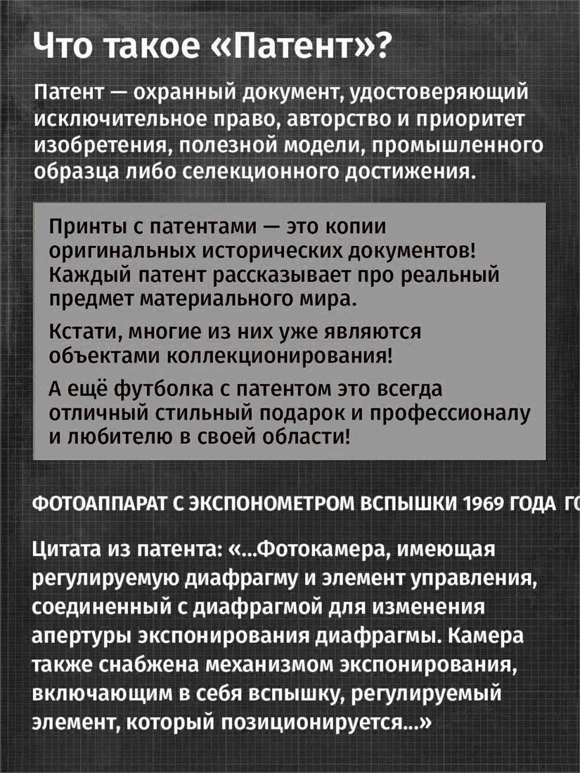 Футболки унисекс, чёрные и белые футболки с изображением патента Фотоаппарат с экспонометром вспышки, 1969 год. Эта модель футболки подходит как мужчинам, так и женщинам, а также адаптируется к различным типам фигуры. Наши принты выполнены методом полноцветной цифровой печати, что обеспечивает высокую износостойкость и насыщенность цветов. Ткань из 100 % хлопка и качественная печать гарантируют сохранение цвета и формы изделия после более чем 100 стирок. В этой серии представлены футболки с патентами на фотоаппараты, кинетоскопы, телевизионный аппарат с конца XIX по начало XX века. Также у нас есть футболки с изображениями патентов на тему Авто, Авиация; Видео и фото; Деньги; Игры и игрушки; Мода, стиль, красота; Мореплавание; Мото и вело; Музыка; Оружие и охота; Профессии и призвания. Ищите также по запросам: футболка для мужчин, мужские футболки, крутая футболка, футболка женская с принтом, футболка мужская с принтом, футболка на день рождения, необычная футболка, необычный подарок, футболка на вечеринку, качественная футболка, шикарная футболка, модная футболка, футболка для подарка, крутая футболка, футболка хайп, подарок парню, подарок девушке, подарок фотографу, подарок инженеру, футболка фотолюбителю, футболка блоггеру, футболка оператору, футболка киношнику, футболка стимпанк, ретро стиль, винтажная электроника, старые фотоаппараты, кинокамеры, ностальгия по 80-м, аналоговая эстетика, олдскул техника.