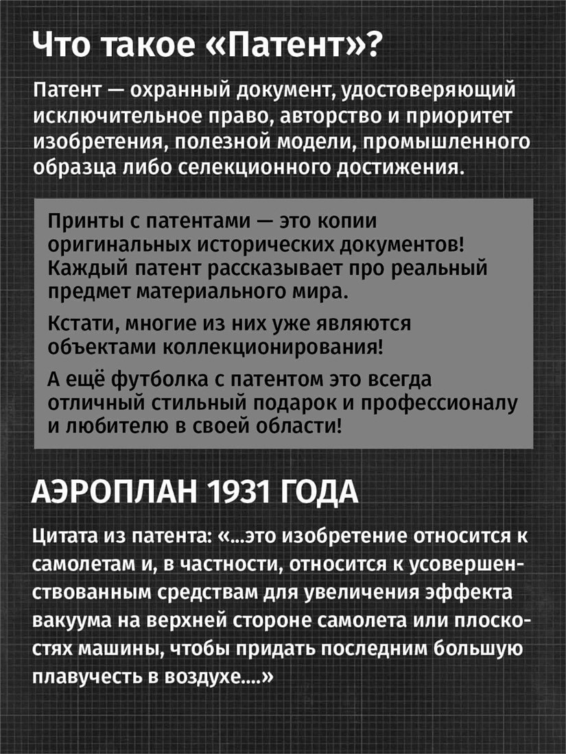 Футболки унисекс, чёрные и белые футболки с изображением патента Аэроплан, 1931 год. Эта модель футболки подходит как мужчинам, так и женщинам, а также адаптируется к различным типам фигуры. Наши принты выполнены методом полноцветной цифровой печати, что обеспечивает высокую износостойкость и насыщенность цветов. Ткань из 100 % хлопка и качественная печать гарантируют сохранение цвета и формы изделия после более чем 100 стирок. В этой серии представлены футболки с патентами на летающие машины, воздушный корабль, сверхзвуковой самолёт, аэроплан, самолёт с крыльями типа «чайка», вертолёт, АН-26, АН-12. Также у нас есть футболки с изображениями патентов на тему Авто, Авиация; Видео и фото; Деньги; Игры и игрушки; Мода, стиль, красота; Мореплавание; Мото и вело; Музыка; Оружие и охота; Профессии и призвания. Ищите также по запросам: футболка для мужчин, мужские футболки, крутая футболка, футболка женская с принтом, футболка мужская с принтом, футболка на день рождения, необычная футболка, необычный подарок, футболка на вечеринку, качественная футболка, шикарная футболка, модная футболка, футболка для подарка, крутая футболка, футболка хайп, подарок парню, подарок девушке, подарок летчику, подарок инженеру, футболка автолюбителю, футболка пилоту, футболка ВДВшнику, футболка десантнику.