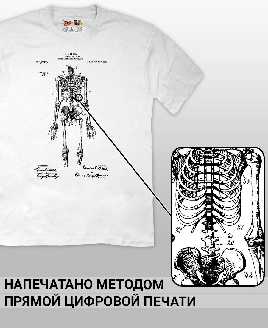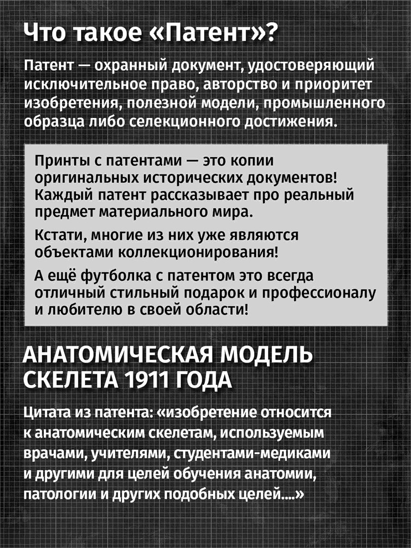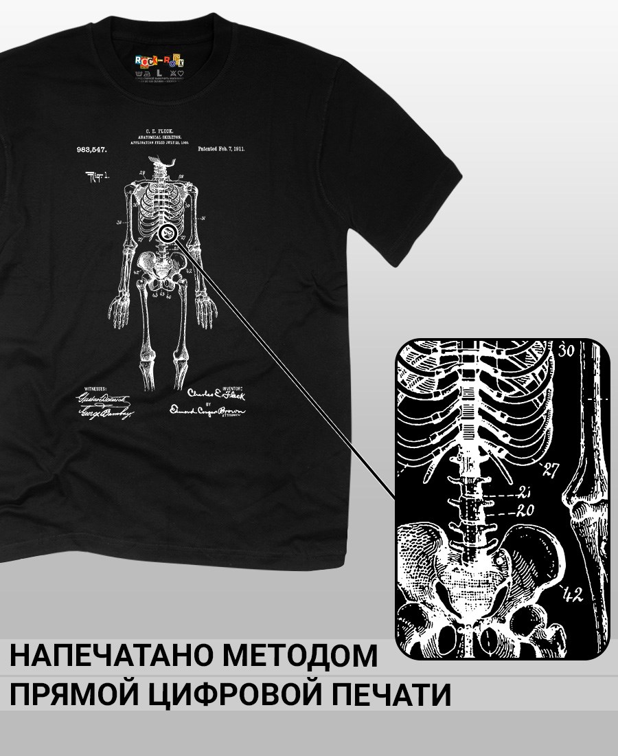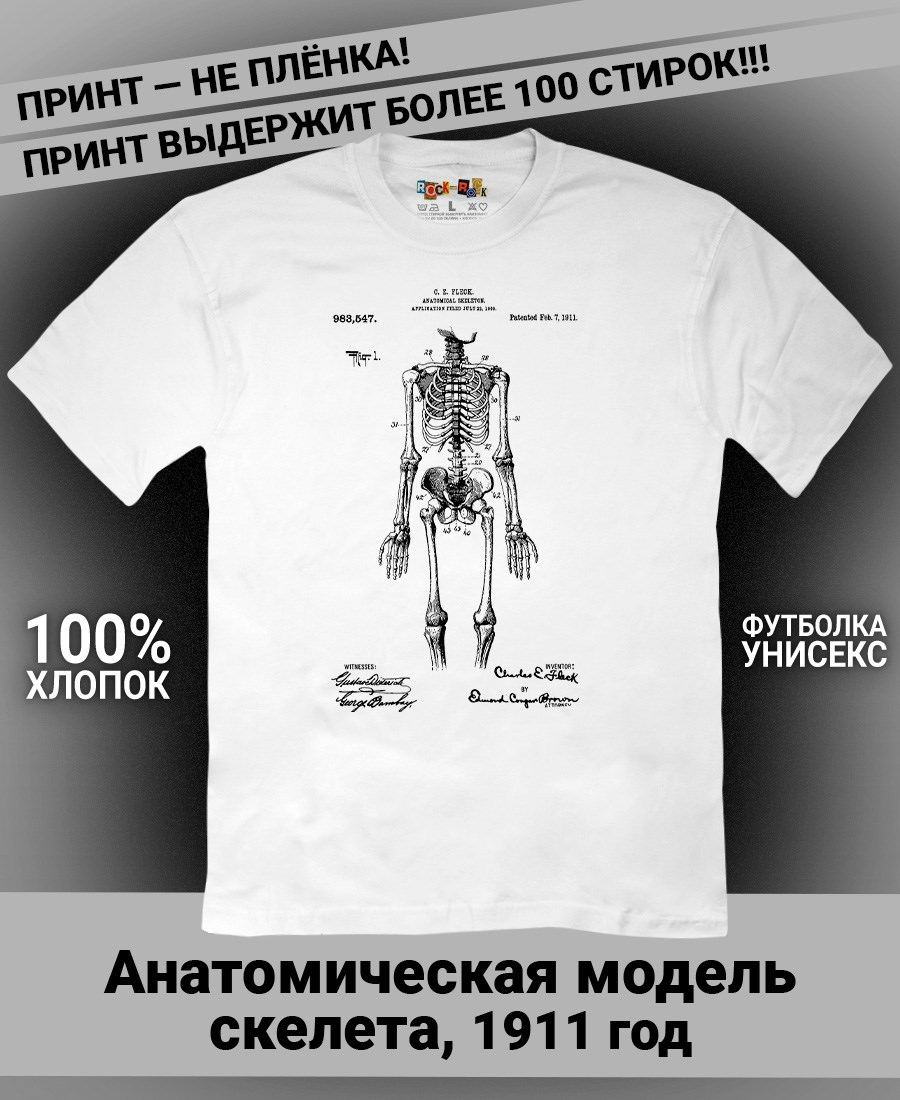 Футболки унисекс, чёрные и белые футболки с изображением патента Футболка Анатомическая модель скелета, 1911 год. Эта модель футболки подходит как мужчинам, так и женщинам, а также адаптируется к различным типам фигуры. Наши принты выполнены методом полноцветной цифровой печати, что обеспечивает высокую износостойкость и насыщенность цветов. Ткань из 100 % хлопка и качественная печать гарантируют сохранение цвета и формы изделия после более чем 100 стирок. В этой серии представлены футболки с патентами на анатомическую модель скелета, хирургическую маску, опору для пожрного рукава, маску пожарного, очки, скафандр, печатную машинку, локомотив, секундомер, магнето. Также у нас есть футболки с изображениями патентов на тему Авто, Авиация; Видео и фото; Деньги; Игры и игрушки; Мода, стиль, красота; Мореплавание; Мото и вело; Музыка; Оружие и охота; Профессии и призвания. Ищите также по запросам: футболка для мужчин, мужские футболки, крутая футболка, футболка женская с принтом, футболка мужская с принтом, футболка на день рождения, необычная футболка, необычный подарок, футболка на вечеринку, качественная футболка, шикарная футболка, модная футболка, футболка для подарка, крутая футболка, футболка хайп, подарок парню, подарок коллекционеру, подарок врачу, подарок пожарному, подарок космонавту, подарок писателю, подарок инжинеру, ретро стиль, винтажная, ностальгия, аналоговая эстетика, олдскул техника.