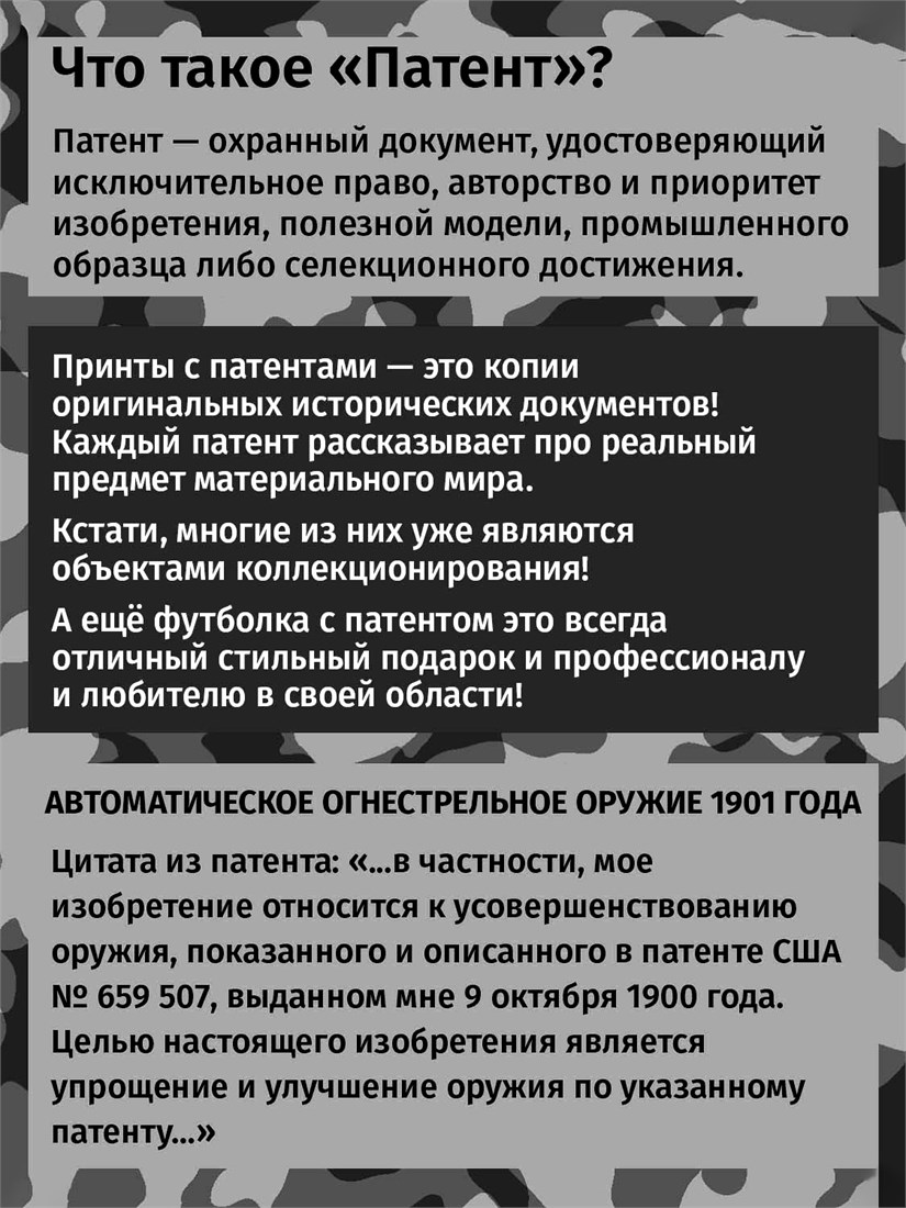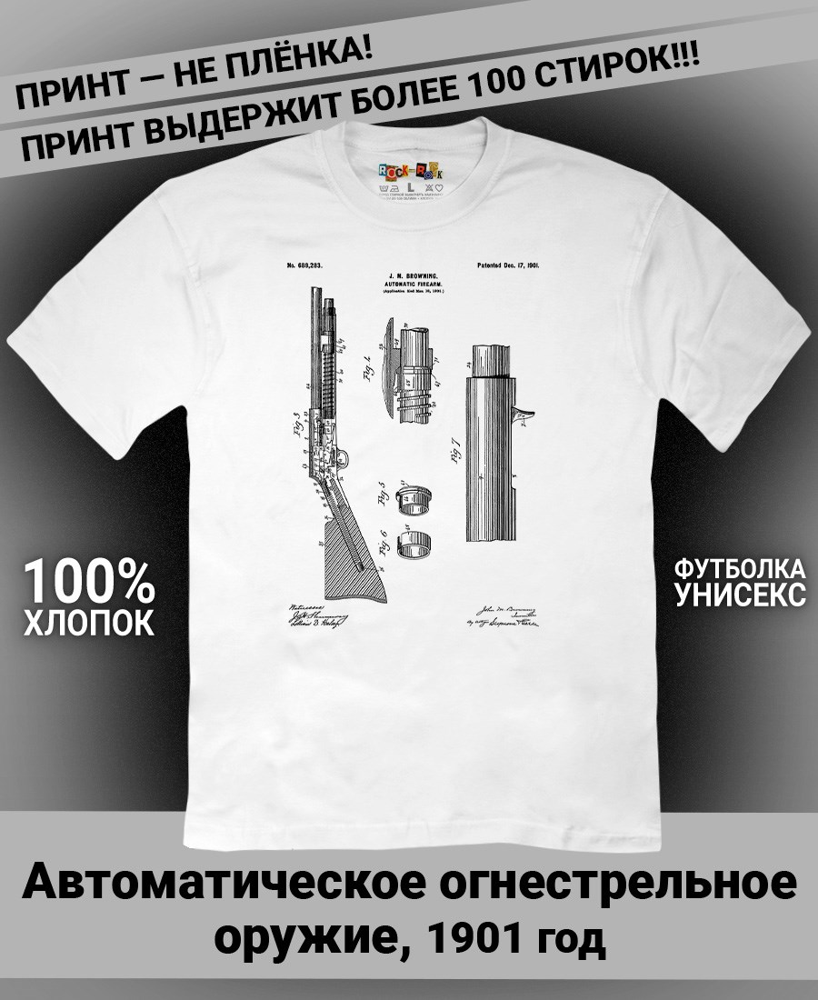 Футболки унисекс, чёрные и белые футболки с изображением патента Автоматическое огнестрельное оружие, 1901 год. Эта модель футболки подходит как мужчинам, так и женщинам, а также адаптируется к различным типам фигуры. Наши принты выполнены методом полноцветной цифровой печати, что обеспечивает высокую износостойкость и насыщенность цветов. Ткань из 100 % хлопка и качественная печать гарантируют сохранение цвета и формы изделия после более чем 100 стирок. В этой серии представлены футболки с патентами на револьверы, ружья, автоматы, гранаты, охотничьи ножи. Также у нас есть футболки с изображениями патентов на тему Авто, Авиация; Видео и фото; Деньги; Игры и игрушки; Мода, стиль, красота; Мореплавание; Мото и вело; Музыка; Оружие и охота; Профессии и призвания. Ищите также по запросам: футболка для мужчин, мужские футболки, крутая футболка, футболка женская с принтом, футболка мужская с принтом, футболка на день рождения, необычная футболка, необычный подарок, футболка на вечеринку, качественная футболка, шикарная футболка, модная футболка, футболка для подарка, крутая футболка, футболка хайп, подарок парню, подарок коллекционеру, подарок охотнику, подарок воину, ретро стиль, винтажная, ностальгия, аналоговая эстетика, олдскул техника.