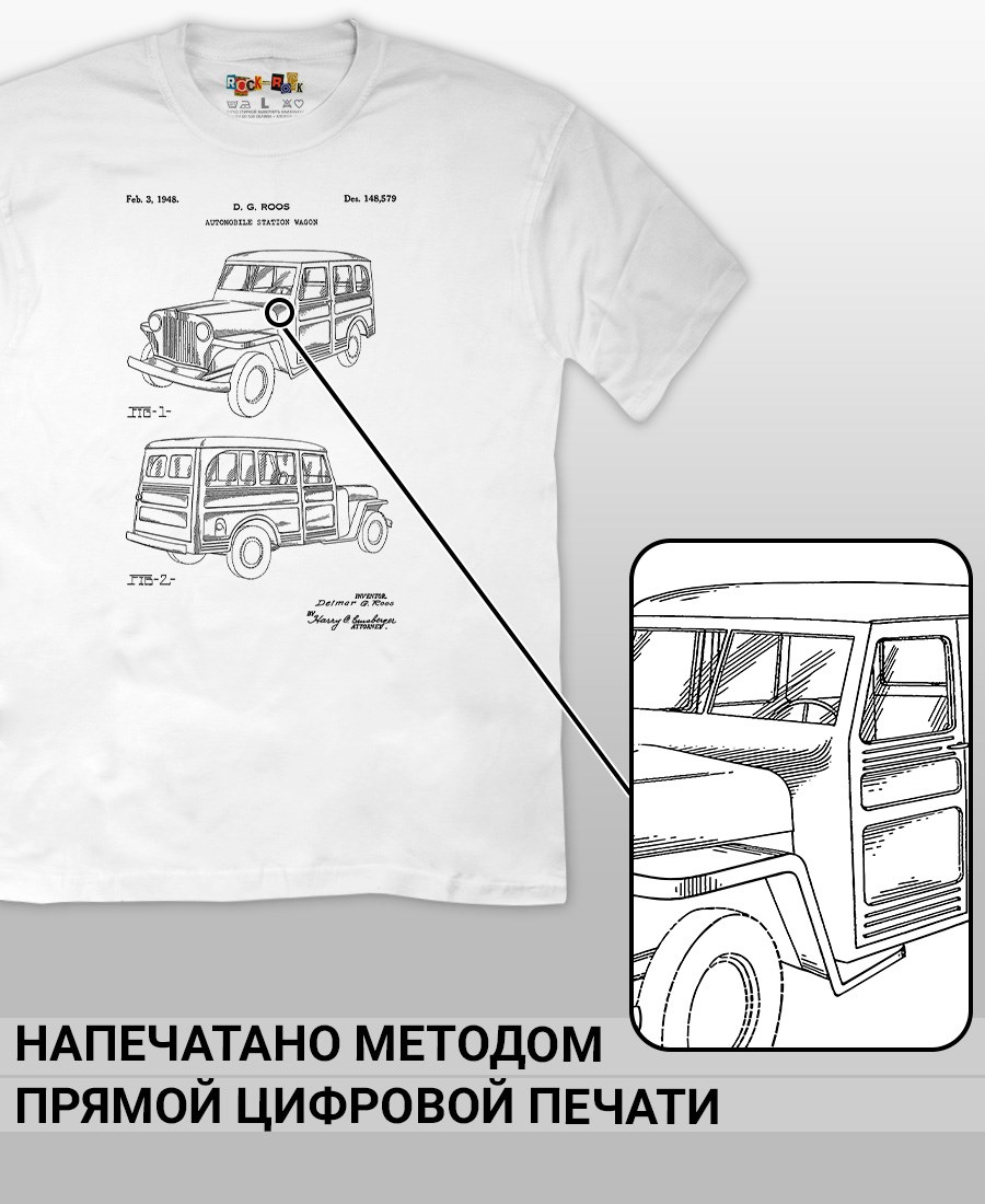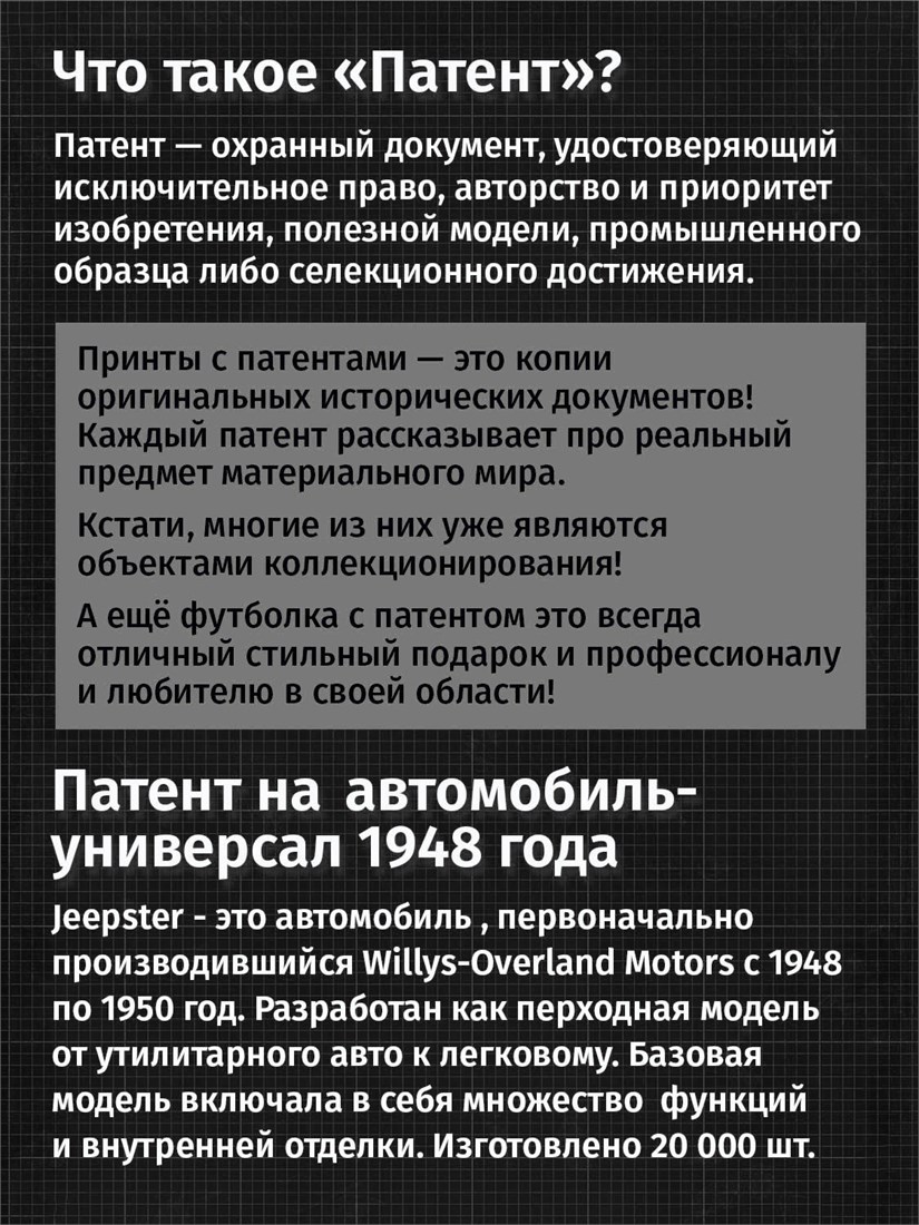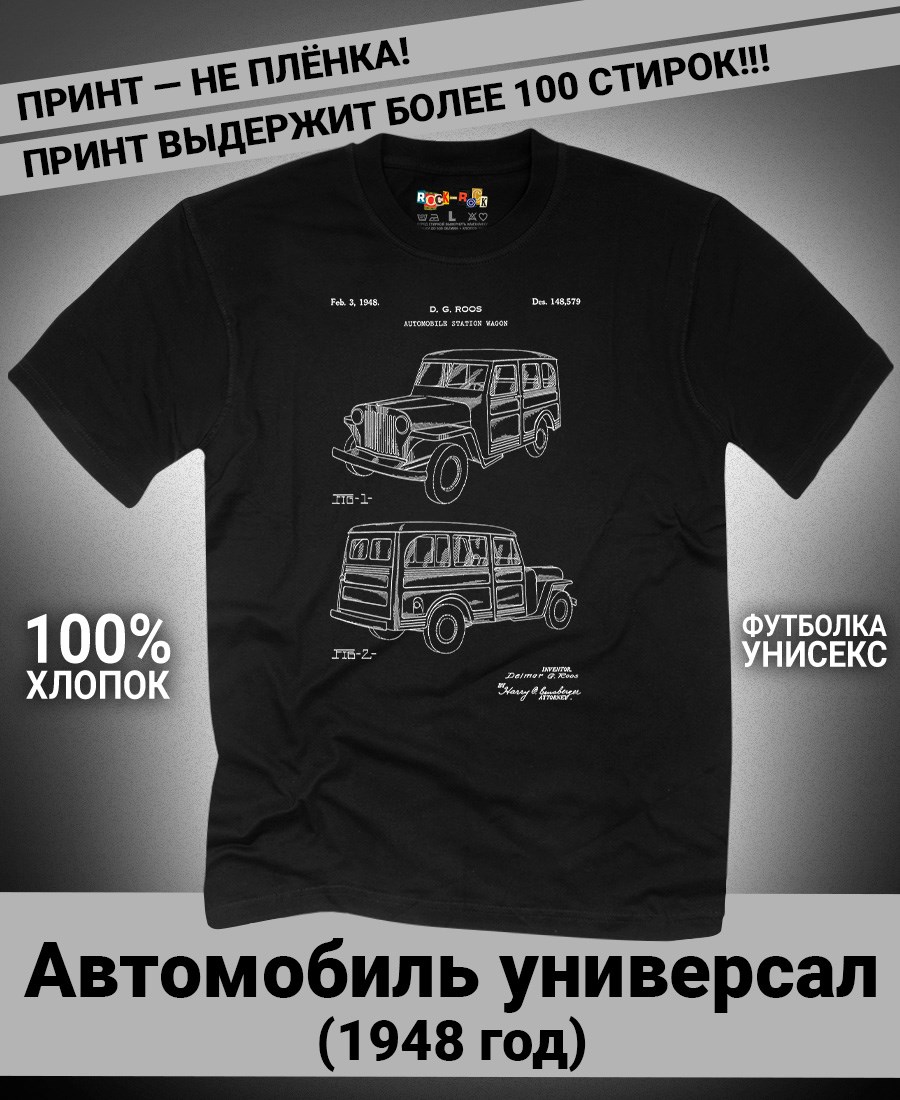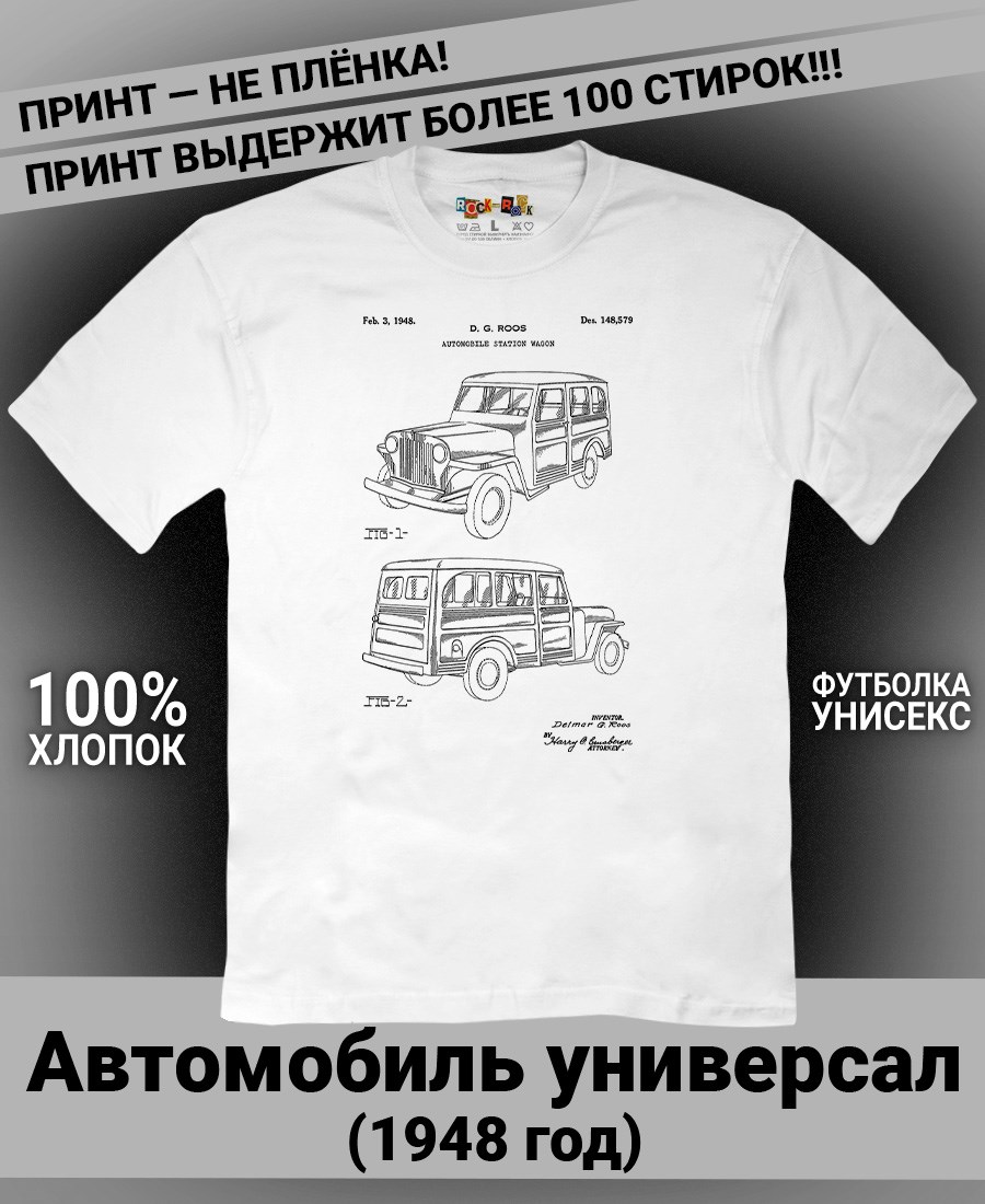 Чёрные и белые футболки унисекс с изображением патента Футболка Автомобиль-универсал, 1948 год. Эта модель футболки подходит как мужчинам, так и женщинам, а также адаптируется к различным типам фигуры. Наши принты выполнены методом полноцветной цифровой печати, что обеспечивает высокую износостойкость и насыщенность цветов. Ткань из 100 % хлопка и качественная печать гарантируют сохранение цвета и формы изделия после более чем 100 стирок. В этой серии представлены футболки с патентами на автомобили Chevrolet Corvette 1973 и 1969 года, автомобиль универсал Jeepster 1948 года, Двигатель Селдона 1912 года, трактор Фердинанда Порше, спорткар Porsche 911, Cadillac Series 61. Также у нас есть футболки с изображениями патентов на тему Авиация; Видео и фото; Деньги; Игры и игрушки; Мода, стиль, красота; Мореплавание; Мото и вело; Музыка; Оружие и охота; Профессии и призвание. Ищите также по запросам: футболка для мужчин, мужские футболки, крутая футболка, футболка женская с принтом, футболка мужская с принтом, футболка на день рождения, необычная футболка, необычный подарок, футболка на вечеринку, качественная футболка, шикарная футболка, модная футболка, футболка для подарка, крутая футболка, футболка хайп, подарок парню, подарок девушке, подарок летчику, футболка автолюбителю, футболка для автоледи.