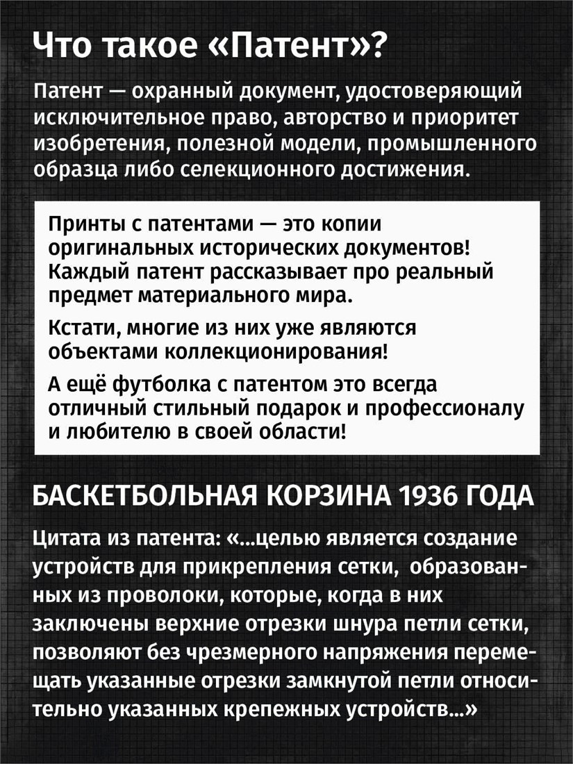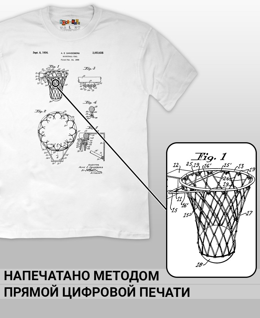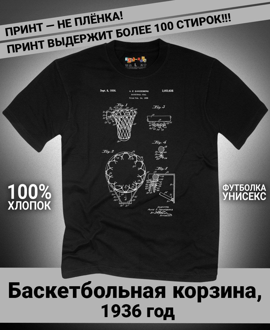 Футболки унисекс, чёрные и белые футболки с изображением патента Футболка Баскетбольная корзина, 1936 год. Эта модель футболки подходит как мужчинам, так и женщинам, а также адаптируется к различным типам фигуры. Наши принты выполнены методом полноцветной цифровой печати, что обеспечивает высокую износостойкость и насыщенность цветов. Ткань из 100 % хлопка и качественная печать гарантируют сохранение цвета и формы изделия после более чем 100 стирок. В этой серии представлены футболки с патентами на футбольные бутсы, футбольный мяч, боксёрский мешок, боксёрские перчатки, баскетбольную корзину, роликовые коньки, гантель, ледовые коньки, ракетку, хоккейные ботинки, хоккейную клюшку. Также у нас есть футболки с изображениями патентов на тему Авто, Авиация; Видео и фото; Деньги; Игры и игрушки; Мода, стиль, красота; Мореплавание; Мото и вело; Музыка; Оружие и охота; Профессии и призвания. Ищите также по запросам: футболка для мужчин, мужские футболки, крутая футболка, футболка женская с принтом, футболка мужская с принтом, футболка на день рождения, необычная футболка, необычный подарок, футболка на вечеринку, качественная футболка, шикарная футболка, модная футболка, футболка для подарка, крутая футболка, футболка хайп, подарок парню, подарок коллекционеру, подарок спортсмену, подарок футболисту, подарок хоккеисту, подарок фигуристу, подарок для стрелка, подарок тенниситу, подарок баскетболисту, подарок фитнес-тренеру, ретро стиль, винтажная, ностальгия, аналоговая эстетика, олдскул техника.