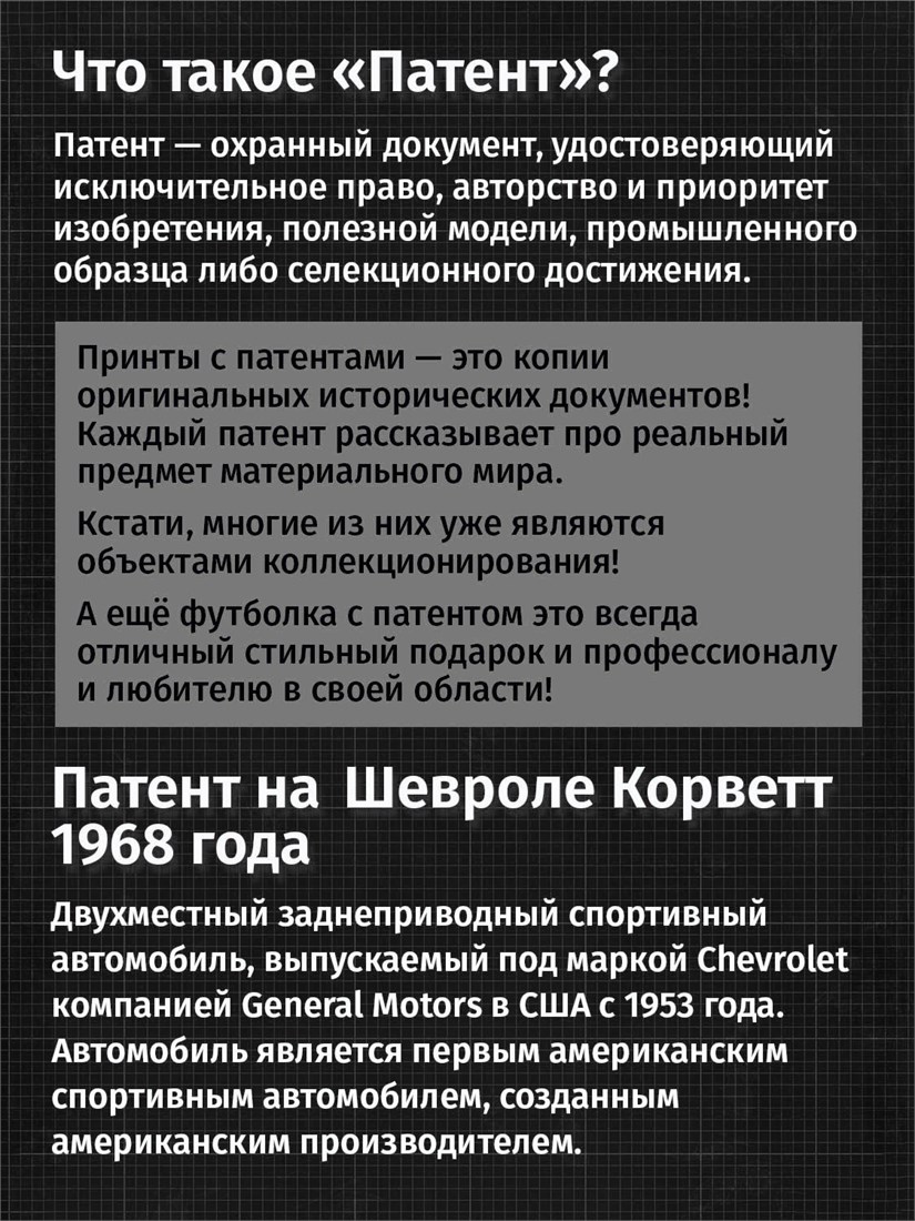 Чёрные и белые футболки унисекс с изображением патента Футболка Chevrolet Corvette, 1968 год. Эта модель футболки подходит как мужчинам, так и женщинам, а также адаптируется к различным типам фигуры. Наши принты выполнены методом полноцветной цифровой печати, что обеспечивает высокую износостойкость и насыщенность цветов. Ткань из 100 % хлопка и качественная печать гарантируют сохранение цвета и формы изделия после более чем 100 стирок. В этой серии представлены футболки с патентами на автомобили Chevrolet Corvette 1973 и 1969 года, автомобиль универсал Jeepster 1948 года, Двигатель Селдона 1912 года, трактор Фердинанда Порше, спорткар Porsche 911, Cadillac Series 61. Также у нас есть футболки с изображениями патентов на тему Авиация; Видео и фото; Деньги; Игры и игрушки; Мода, стиль, красота; Мореплавание; Мото и вело; Музыка; Оружие и охота; Профессии и призвание. Ищите также по запросам: футболка для мужчин, мужские футболки, крутая футболка, футболка женская с принтом, футболка мужская с принтом, футболка на день рождения, необычная футболка, необычный подарок, футболка на вечеринку, качественная футболка, шикарная футболка, модная футболка, футболка для подарка, крутая футболка, футболка хайп, подарок парню, подарок девушке, подарок летчику, футболка автолюбителю, футболка для автоледи.