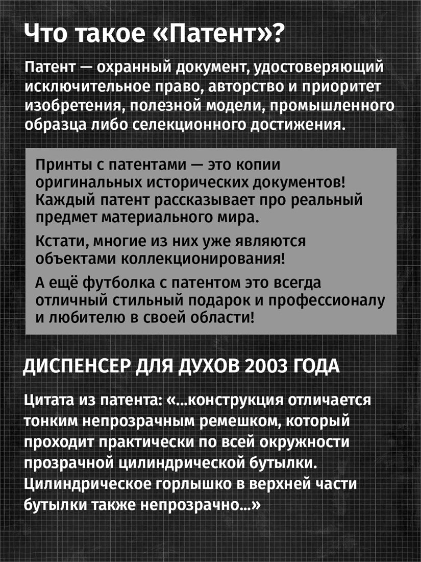 Футболки унисекс, чёрные и белые футболки с изображением патента Диспенсер для духов, 2003. Эта модель футболки подходит как мужчинам, так и женщинам, а также адаптируется к различным типам фигуры. Наши принты выполнены методом полноцветной цифровой печати, что обеспечивает высокую износостойкость и насыщенность цветов. Ткань из 100 % хлопка и качественная печать гарантируют сохранение цвета и формы изделия после более чем 100 стирок. В этой серии представлены футболки с патентами на парикмахерские ножницы, опасную бритву, флакон для духов, футляр для помады, несессер, портновский манекен. Также у нас есть футболки с изображениями патентов на тему Авто, Авиация; Видео и фото; Деньги; Игры и игрушки; Мода, стиль, красота; Мореплавание; Мото и вело; Музыка; Оружие и охота; Профессии и призвания. Ищите также по запросам: футболка для мужчин, мужские футболки, крутая футболка, футболка женская с принтом, футболка мужская с принтом, футболка на день рождения, необычная футболка, необычный подарок, футболка на вечеринку, качественная футболка, шикарная футболка, модная футболка, футболка для подарка, крутая футболка, футболка хайп, подарок парню, подарок девушке, подарок коллекционеру, подарок модельеру, подарок парикмахеру, подарок бьюти-блогеру, подарок стилисту, подарок швее, подарок барберу, футболка блоггеру, футболка стимпанк, ретро стиль, винтажная, ностальгия, аналоговая эстетика, олдскул техника.