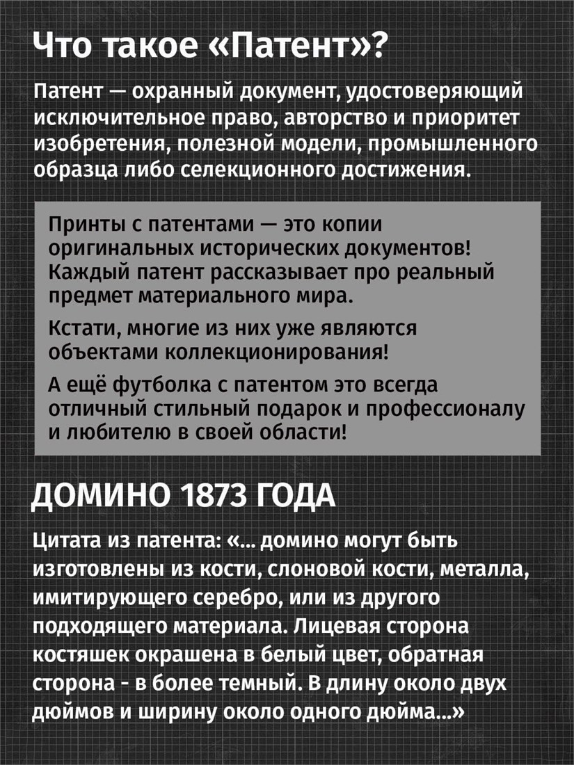 Футболки унисекс, чёрные и белые футболки с изображением патента Домино, 1873 год. Эта модель футболки подходит как мужчинам, так и женщинам, а также адаптируется к различным типам фигуры. Наши принты выполнены методом полноцветной цифровой печати, что обеспечивает высокую износостойкость и насыщенность цветов. Ткань из 100 % хлопка и качественная печать гарантируют сохранение цвета и формы изделия после более чем 100 стирок. В этой серии представлены футболки с патентами на игры, игрушки, игрушечные механизмы, запатентованные с XIX по начало XX века. Также у нас есть футболки с изображениями патентов на тему Авто, Авиация; Видео и фото; Деньги; Игры и игрушки; Мода, стиль, красота; Мореплавание; Мото и вело; Музыка; Оружие и охота; Профессии и призвания. Ищите также по запросам: футболка для мужчин, мужские футболки, крутая футболка, футболка женская с принтом, футболка мужская с принтом, футболка на день рождения, необычная футболка, необычный подарок, футболка на вечеринку, качественная футболка, шикарная футболка, модная футболка, футболка для подарка, крутая футболка, футболка хайп, подарок парню, подарок девушке, подарок коллекционеру, подарок инженеру, футболка блоггеру, футболка стимпанк, ретро стиль, винтажная электроника, старые игрушки, монополия, ностальгия, аналоговая эстетика, олдскул техника.