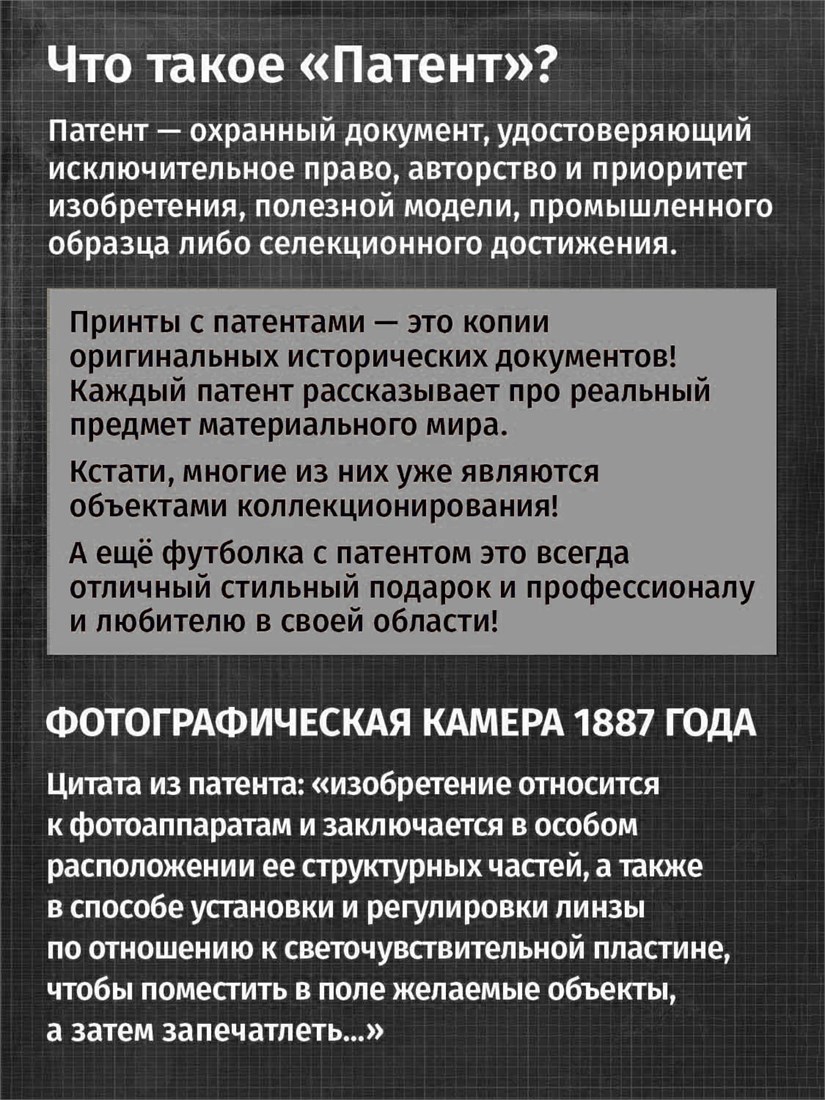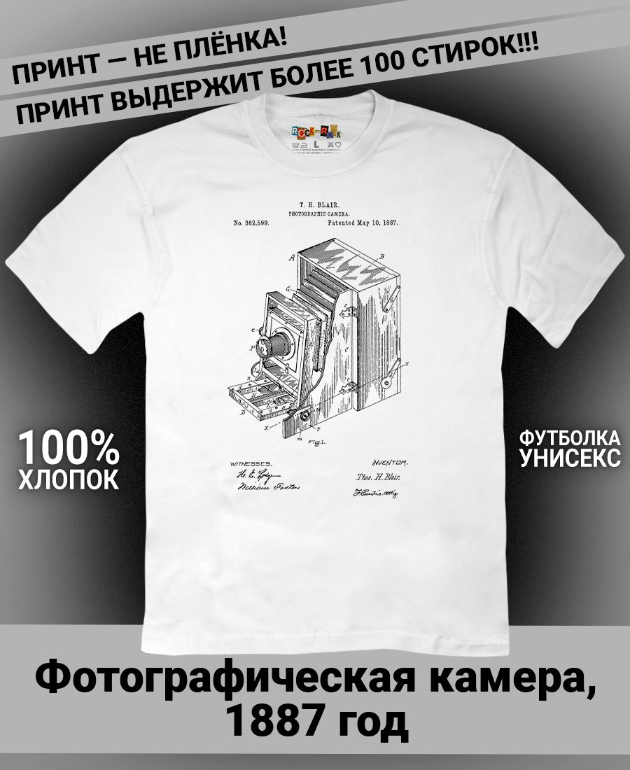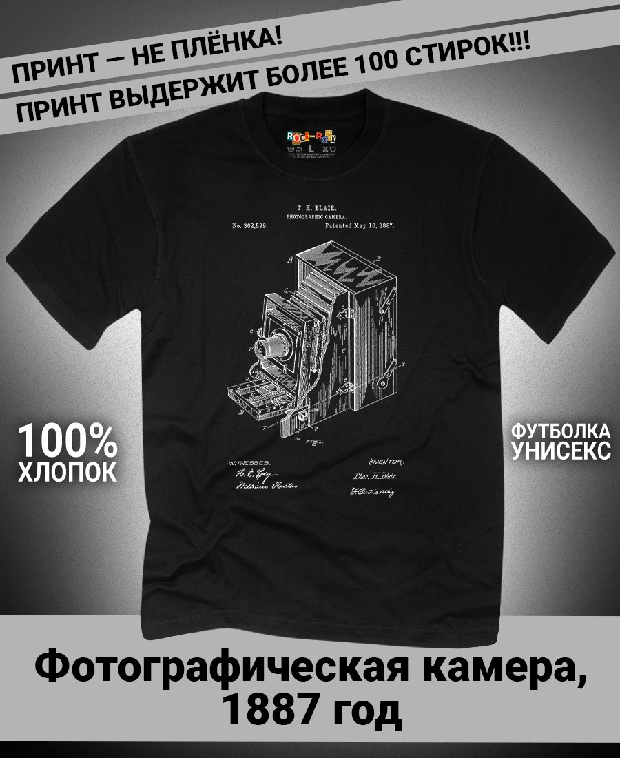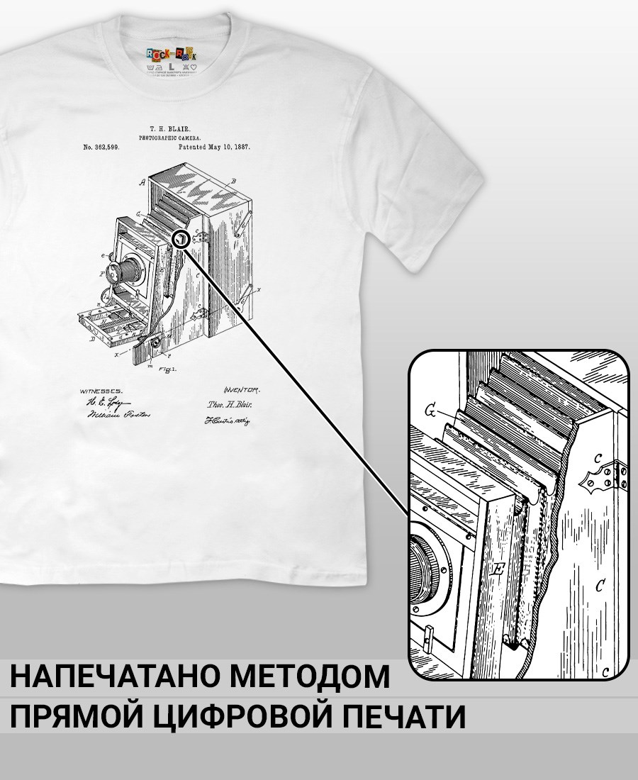 Футболки унисекс, чёрные и белые футболки с изображением патента Фотографическая камера, 1887 год. Эта модель футболки подходит как мужчинам, так и женщинам, а также адаптируется к различным типам фигуры. Наши принты выполнены методом полноцветной цифровой печати, что обеспечивает высокую износостойкость и насыщенность цветов. Ткань из 100 % хлопка и качественная печать гарантируют сохранение цвета и формы изделия после более чем 100 стирок. В этой серии представлены футболки с патентами на фотоаппараты, кинетоскопы, телевизионный аппарат с конца XIX по начало XX века. Также у нас есть футболки с изображениями патентов на тему Авто, Авиация; Видео и фото; Деньги; Игры и игрушки; Мода, стиль, красота; Мореплавание; Мото и вело; Музыка; Оружие и охота; Профессии и призвания. Ищите также по запросам: футболка для мужчин, мужские футболки, крутая футболка, футболка женская с принтом, футболка мужская с принтом, футболка на день рождения, необычная футболка, необычный подарок, футболка на вечеринку, качественная футболка, шикарная футболка, модная футболка, футболка для подарка, крутая футболка, футболка хайп, подарок парню, подарок девушке, подарок фотографу, подарок инженеру, футболка фотолюбителю, футболка блоггеру, футболка оператору, футболка киношнику, футболка стимпанк, ретро стиль, винтажная электроника, старые фотоаппараты, кинокамеры, ностальгия по 80-м, аналоговая эстетика, олдскул техника.
