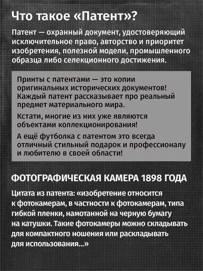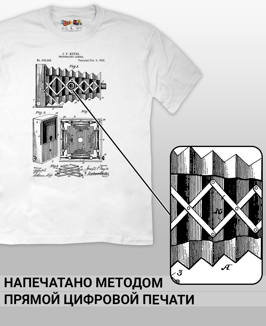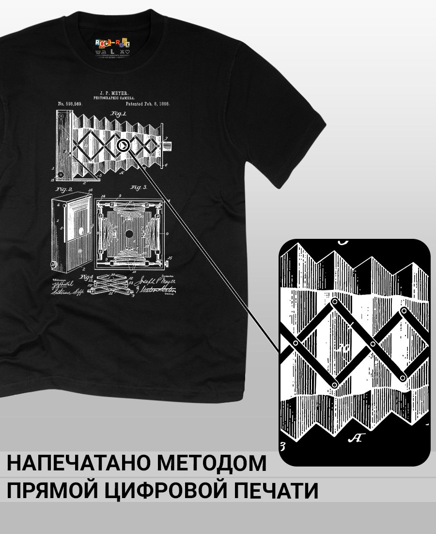 Футболки унисекс, чёрные и белые футболки с изображением патента Фотографическая камера, 1898 год. Эта модель футболки подходит как мужчинам, так и женщинам, а также адаптируется к различным типам фигуры. Наши принты выполнены методом полноцветной цифровой печати, что обеспечивает высокую износостойкость и насыщенность цветов. Ткань из 100 % хлопка и качественная печать гарантируют сохранение цвета и формы изделия после более чем 100 стирок. В этой серии представлены футболки с патентами на фотоаппараты, кинетоскопы, телевизионный аппарат с конца XIX по начало XX века. Также у нас есть футболки с изображениями патентов на тему Авто, Авиация; Видео и фото; Деньги; Игры и игрушки; Мода, стиль, красота; Мореплавание; Мото и вело; Музыка; Оружие и охота; Профессии и призвания. Ищите также по запросам: футболка для мужчин, мужские футболки, крутая футболка, футболка женская с принтом, футболка мужская с принтом, футболка на день рождения, необычная футболка, необычный подарок, футболка на вечеринку, качественная футболка, шикарная футболка, модная футболка, футболка для подарка, крутая футболка, футболка хайп, подарок парню, подарок девушке, подарок фотографу, подарок инженеру, футболка фотолюбителю, футболка блоггеру, футболка оператору, футболка киношнику, футболка стимпанк, ретро стиль, винтажная электроника, старые фотоаппараты, кинокамеры, ностальгия по 80-м, аналоговая эстетика, олдскул техника.