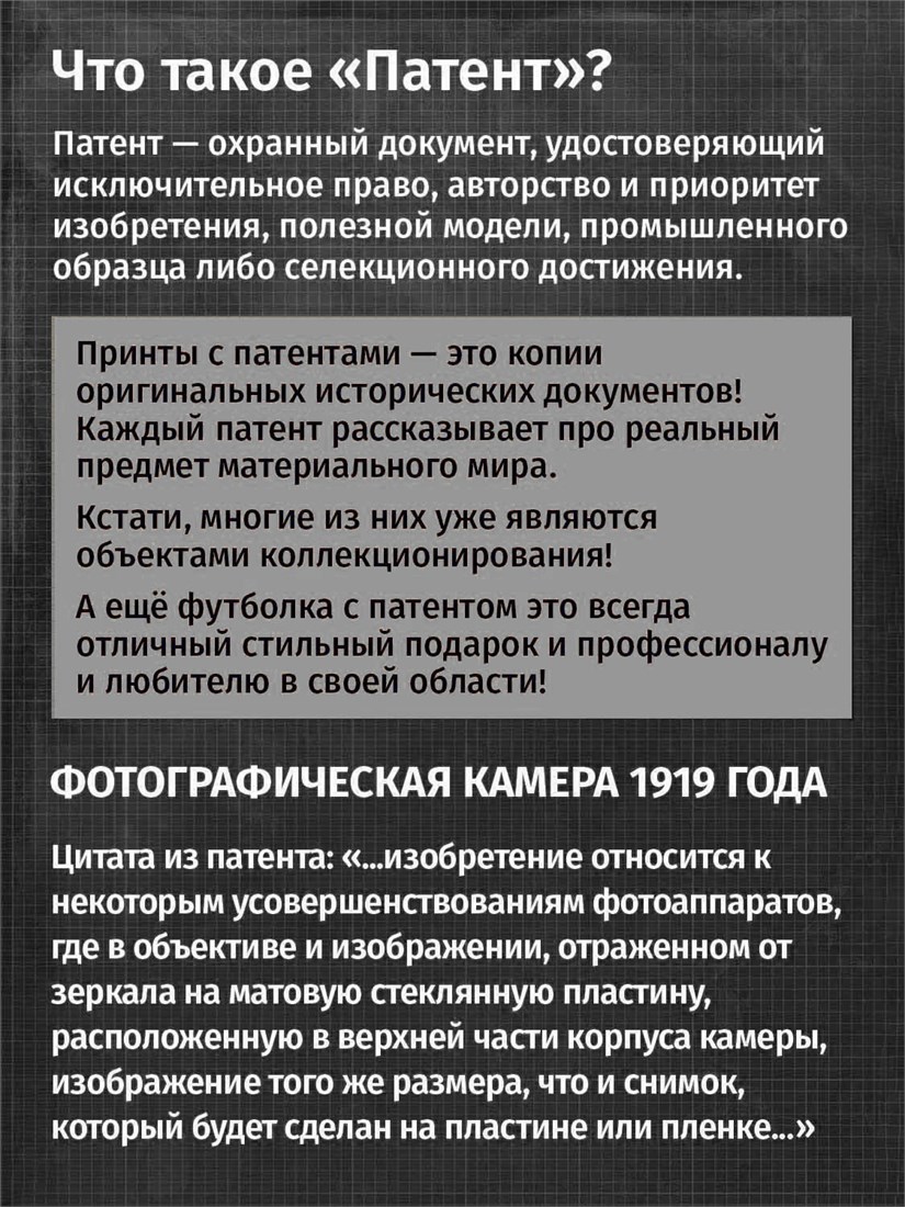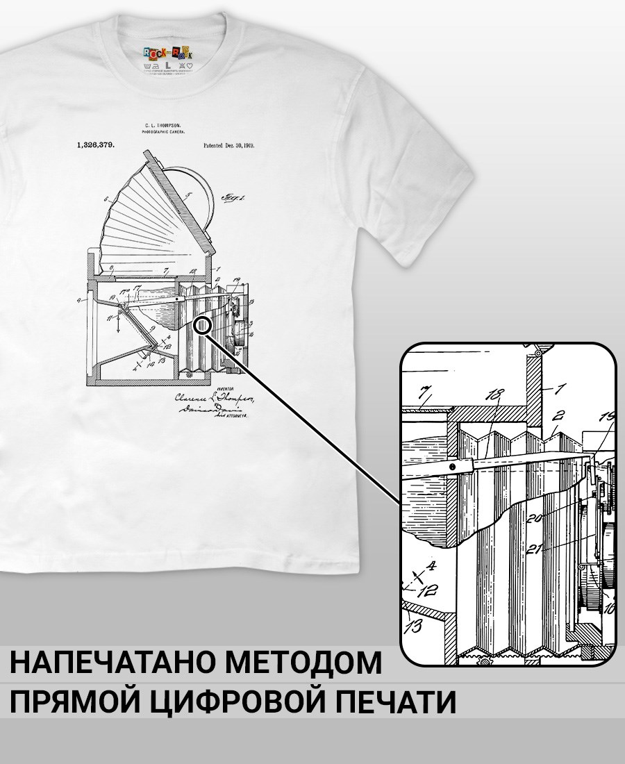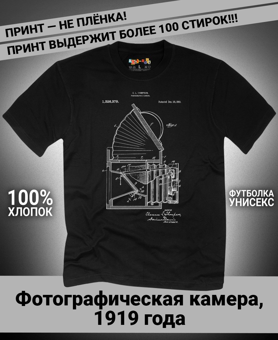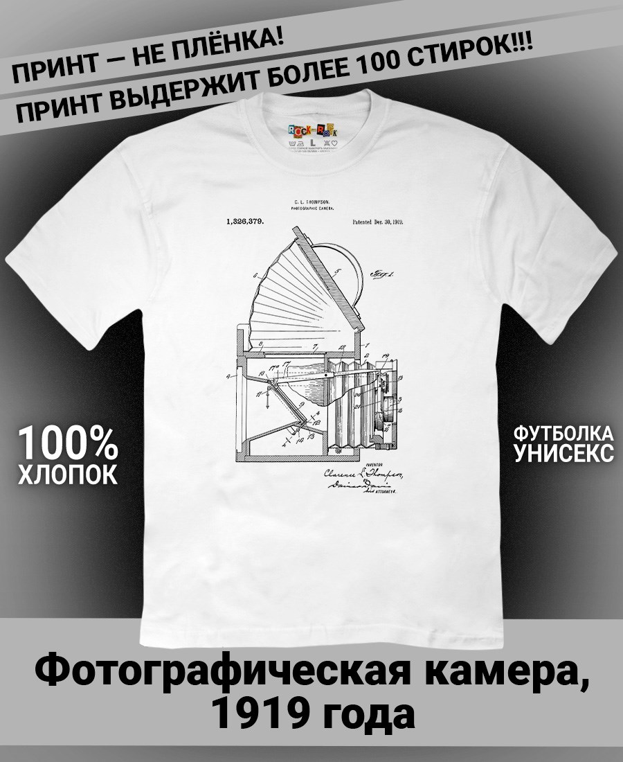 Футболки унисекс, чёрные и белые футболки с изображением патента Фотографическая камера, 1919 года. Эта модель футболки подходит как мужчинам, так и женщинам, а также адаптируется к различным типам фигуры. Наши принты выполнены методом полноцветной цифровой печати, что обеспечивает высокую износостойкость и насыщенность цветов. Ткань из 100 % хлопка и качественная печать гарантируют сохранение цвета и формы изделия после более чем 100 стирок. В этой серии представлены футболки с патентами на фотоаппараты, кинетоскопы, телевизионный аппарат с конца XIX по начало XX века. Также у нас есть футболки с изображениями патентов на тему Авто, Авиация; Видео и фото; Деньги; Игры и игрушки; Мода, стиль, красота; Мореплавание; Мото и вело; Музыка; Оружие и охота; Профессии и призвания. Ищите также по запросам: футболка для мужчин, мужские футболки, крутая футболка, футболка женская с принтом, футболка мужская с принтом, футболка на день рождения, необычная футболка, необычный подарок, футболка на вечеринку, качественная футболка, шикарная футболка, модная футболка, футболка для подарка, крутая футболка, футболка хайп, подарок парню, подарок девушке, подарок фотографу, подарок инженеру, футболка фотолюбителю, футболка блоггеру, футболка оператору, футболка киношнику, футболка стимпанк, ретро стиль, винтажная электроника, старые фотоаппараты, кинокамеры, ностальгия по 80-м, аналоговая эстетика, олдскул техника.