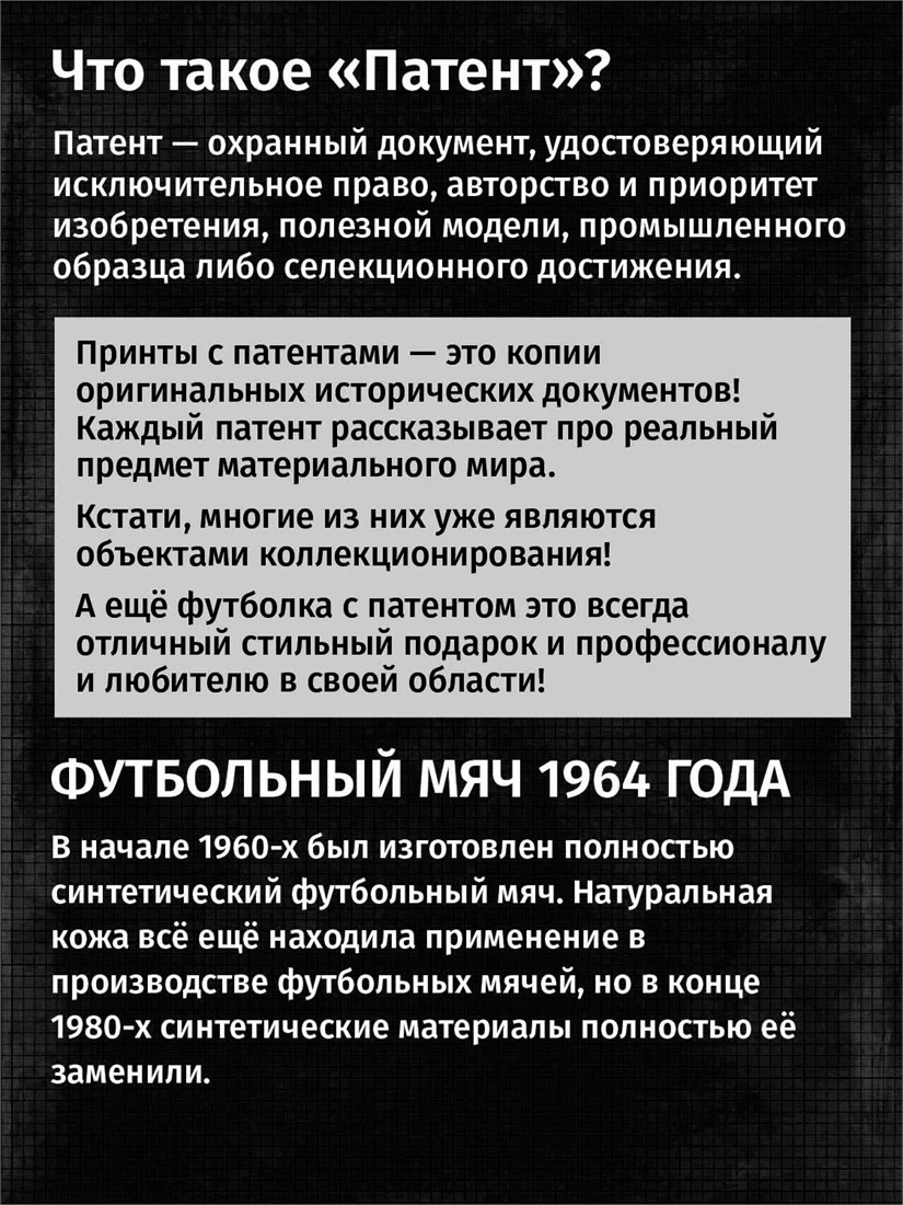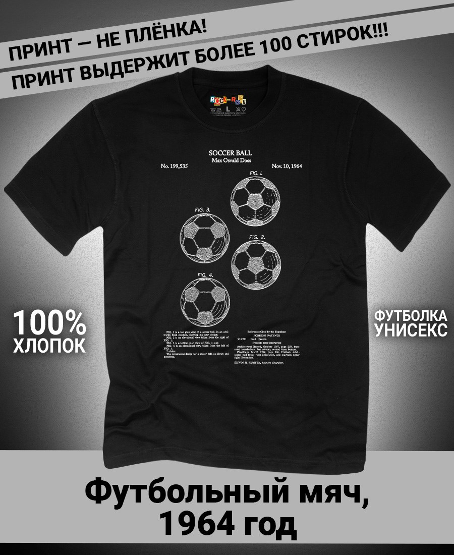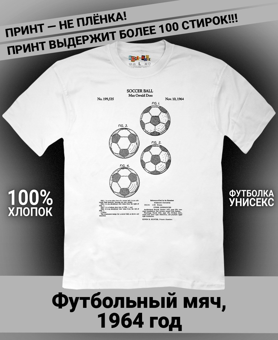 Футболки унисекс, чёрные и белые футболки с изображением патента Футболка Футбольный мяч, 1964 год. Эта модель футболки подходит как мужчинам, так и женщинам, а также адаптируется к различным типам фигуры. Наши принты выполнены методом полноцветной цифровой печати, что обеспечивает высокую износостойкость и насыщенность цветов. Ткань из 100 % хлопка и качественная печать гарантируют сохранение цвета и формы изделия после более чем 100 стирок. В этой серии представлены футболки с патентами на футбольные бутсы, футбольный мяч, боксёрский мешок, боксёрские перчатки, баскетбольную корзину, роликовые коньки, гантель, ледовые коньки, ракетку, хоккейные ботинки, хоккейную клюшку. Также у нас есть футболки с изображениями патентов на тему Авто, Авиация; Видео и фото; Деньги; Игры и игрушки; Мода, стиль, красота; Мореплавание; Мото и вело; Музыка; Оружие и охота; Профессии и призвания. Ищите также по запросам: футболка для мужчин, мужские футболки, крутая футболка, футболка женская с принтом, футболка мужская с принтом, футболка на день рождения, необычная футболка, необычный подарок, футболка на вечеринку, качественная футболка, шикарная футболка, модная футболка, футболка для подарка, крутая футболка, футболка хайп, подарок парню, подарок коллекционеру, подарок спортсмену, подарок футболисту, подарок хоккеисту, подарок фигуристу, подарок для стрелка, подарок тенниситу, подарок баскетболисту, подарок фитнес-тренеру, ретро стиль, винтажная, ностальгия, аналоговая эстетика, олдскул техника.
