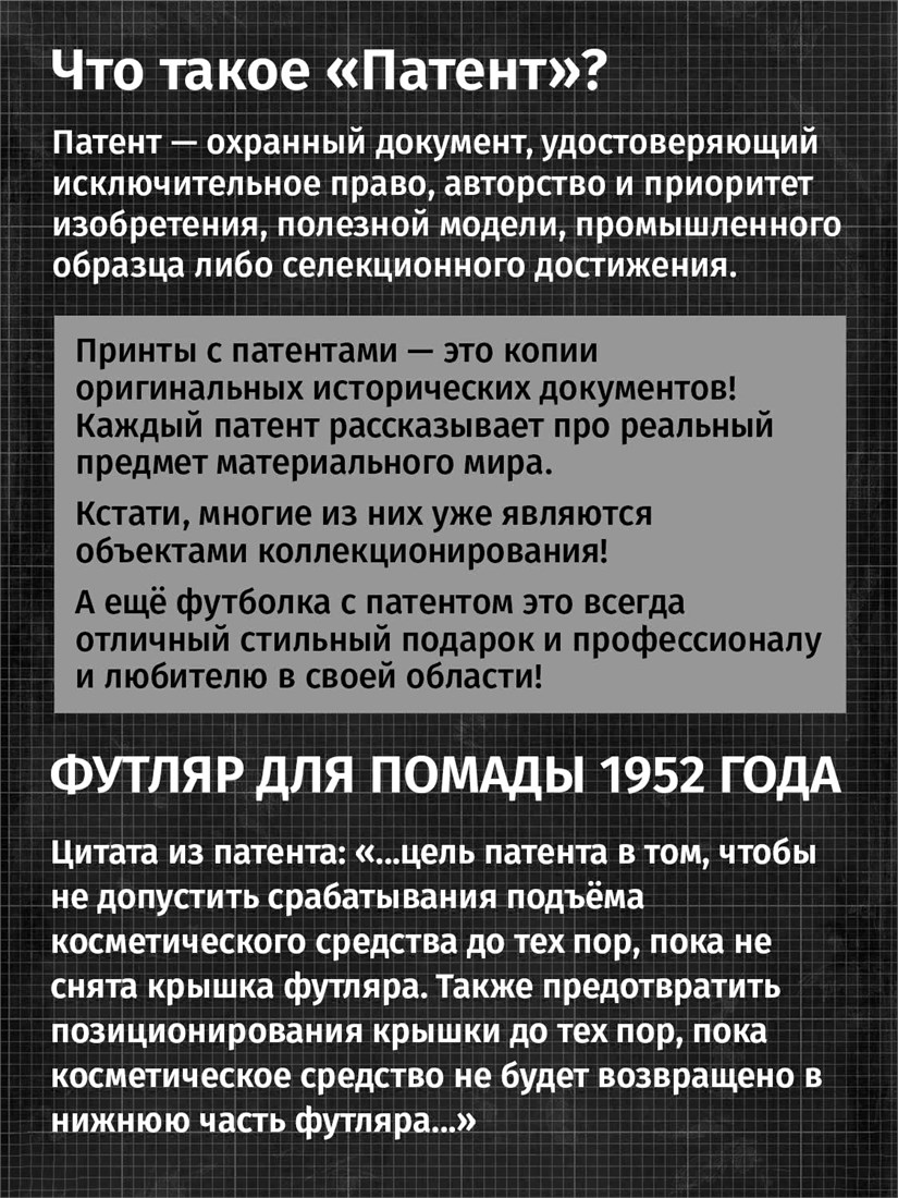 Футболки унисекс, чёрные и белые футболки с изображением патента Футляр для помады, 1952 год. Эта модель футболки подходит как мужчинам, так и женщинам, а также адаптируется к различным типам фигуры. Наши принты выполнены методом полноцветной цифровой печати, что обеспечивает высокую износостойкость и насыщенность цветов. Ткань из 100 % хлопка и качественная печать гарантируют сохранение цвета и формы изделия после более чем 100 стирок. В этой серии представлены футболки с патентами на парикмахерские ножницы, опасную бритву, флакон для духов, футляр для помады, несессер, портновский манекен. Также у нас есть футболки с изображениями патентов на тему Авто, Авиация; Видео и фото; Деньги; Игры и игрушки; Мода, стиль, красота; Мореплавание; Мото и вело; Музыка; Оружие и охота; Профессии и призвания. Ищите также по запросам: футболка для мужчин, мужские футболки, крутая футболка, футболка женская с принтом, футболка мужская с принтом, футболка на день рождения, необычная футболка, необычный подарок, футболка на вечеринку, качественная футболка, шикарная футболка, модная футболка, футболка для подарка, крутая футболка, футболка хайп, подарок парню, подарок девушке, подарок коллекционеру, подарок модельеру, подарок парикмахеру, подарок бьюти-блогеру, подарок стилисту, подарок швее, подарок барберу, футболка блоггеру, футболка стимпанк, ретро стиль, винтажная, ностальгия, аналоговая эстетика, олдскул техника.