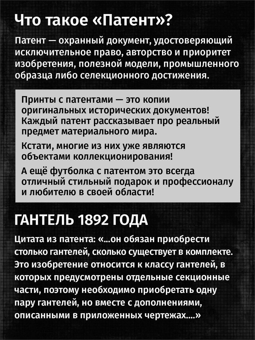 Футболки унисекс, чёрные и белые футболки с изображением патента Футболка Гантель, 1892 год. Эта модель футболки подходит как мужчинам, так и женщинам, а также адаптируется к различным типам фигуры. Наши принты выполнены методом полноцветной цифровой печати, что обеспечивает высокую износостойкость и насыщенность цветов. Ткань из 100 % хлопка и качественная печать гарантируют сохранение цвета и формы изделия после более чем 100 стирок. В этой серии представлены футболки с патентами на футбольные бутсы, футбольный мяч, боксёрский мешок, боксёрские перчатки, баскетбольную корзину, роликовые коньки, гантель, ледовые коньки, ракетку, хоккейные ботинки, хоккейную клюшку. Также у нас есть футболки с изображениями патентов на тему Авто, Авиация; Видео и фото; Деньги; Игры и игрушки; Мода, стиль, красота; Мореплавание; Мото и вело; Музыка; Оружие и охота; Профессии и призвания. Ищите также по запросам: футболка для мужчин, мужские футболки, крутая футболка, футболка женская с принтом, футболка мужская с принтом, футболка на день рождения, необычная футболка, необычный подарок, футболка на вечеринку, качественная футболка, шикарная футболка, модная футболка, футболка для подарка, крутая футболка, футболка хайп, подарок парню, подарок коллекционеру, подарок спортсмену, подарок футболисту, подарок хоккеисту, подарок фигуристу, подарок для стрелка, подарок тенниситу, подарок баскетболисту, подарок фитнес-тренеру, ретро стиль, винтажная, ностальгия, аналоговая эстетика, олдскул техника.