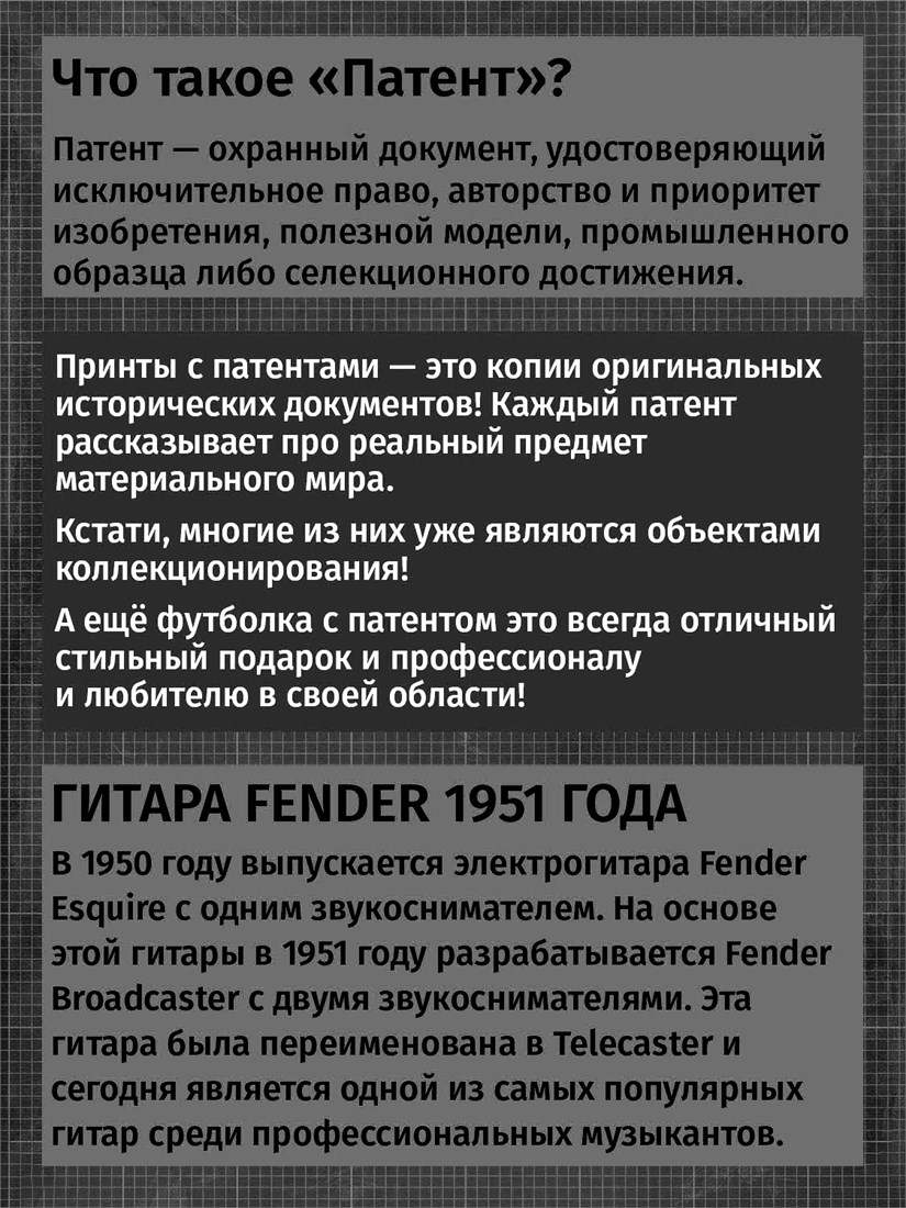 Футболки унисекс, чёрные и белые футболки с изображением патента Гитара Fender, 1951 год. Эта модель футболки подходит как мужчинам, так и женщинам, а также адаптируется к различным типам фигуры. Наши принты выполнены методом полноцветной цифровой печати, что обеспечивает высокую износостойкость и насыщенность цветов. Ткань из 100 % хлопка и качественная печать гарантируют сохранение цвета и формы изделия после более чем 100 стирок. В этой серии представлены футболки с патентами на фортепиано, барабанные установки, гитары, аккордеон, банджо, микрофон, граммофон. Также у нас есть футболки с изображениями патентов на тему Авто, Авиация; Видео и фото; Деньги; Игры и игрушки; Мода, стиль, красота; Мореплавание; Мото и вело; Музыка; Оружие и охота; Профессии и призвания. Ищите также по запросам: футболка для мужчин, мужские футболки, крутая футболка, футболка женская с принтом, футболка мужская с принтом, футболка на день рождения, необычная футболка, необычный подарок, футболка на вечеринку, качественная футболка, шикарная футболка, модная футболка, футболка для подарка, крутая футболка, футболка хайп, подарок парню, подарок девушке, подарок коллекционеру, подарок музыканту, подарок гитаристу, подарок барабанщику, подарок аккордионисту, подарок рокеру, подарок пионисту, футболка музыканта, футболка музыка, ретро стиль, винтажная, ностальгия, аналоговая эстетика, олдскул техника.