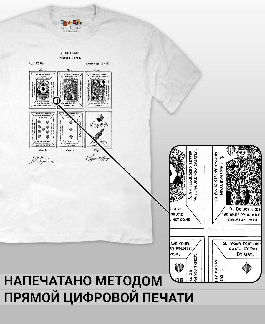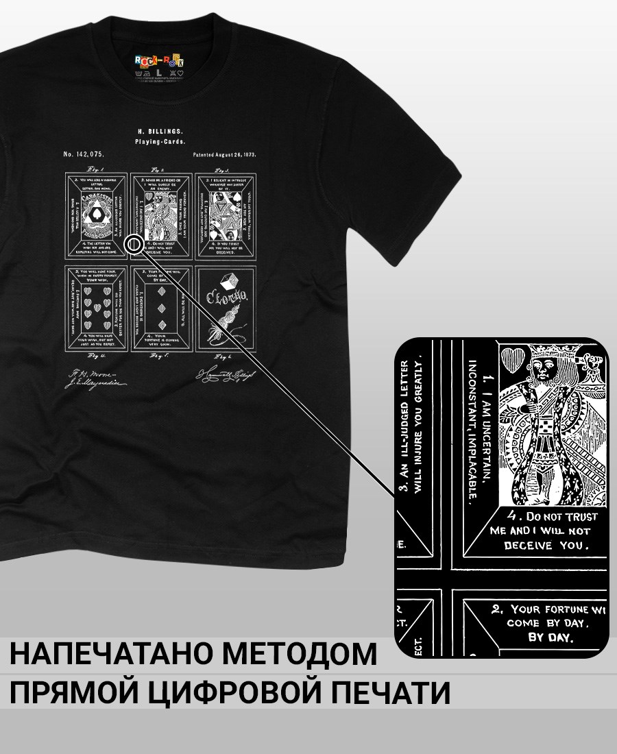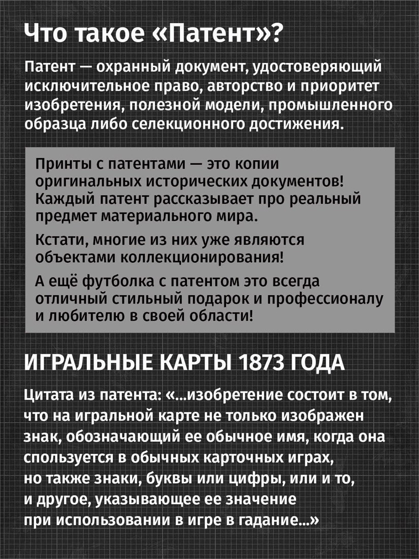 Футболки унисекс, чёрные и белые футболки с изображением патента Игральные карты, 1873 год. Эта модель футболки подходит как мужчинам, так и женщинам, а также адаптируется к различным типам фигуры. Наши принты выполнены методом полноцветной цифровой печати, что обеспечивает высокую износостойкость и насыщенность цветов. Ткань из 100 % хлопка и качественная печать гарантируют сохранение цвета и формы изделия после более чем 100 стирок. В этой серии представлены футболки с патентами на игры, игрушки, игрушечные механизмы, запатентованные с XIX по начало XX века. Также у нас есть футболки с изображениями патентов на тему Авто, Авиация; Видео и фото; Деньги; Игры и игрушки; Мода, стиль, красота; Мореплавание; Мото и вело; Музыка; Оружие и охота; Профессии и призвания. Ищите также по запросам: футболка для мужчин, мужские футболки, крутая футболка, футболка женская с принтом, футболка мужская с принтом, футболка на день рождения, необычная футболка, необычный подарок, футболка на вечеринку, качественная футболка, шикарная футболка, модная футболка, футболка для подарка, крутая футболка, футболка хайп, подарок парню, подарок девушке, подарок коллекционеру, подарок инженеру, футболка блоггеру, футболка стимпанк, ретро стиль, винтажная электроника, старые игрушки, монополия, ностальгия, аналоговая эстетика, олдскул техника.