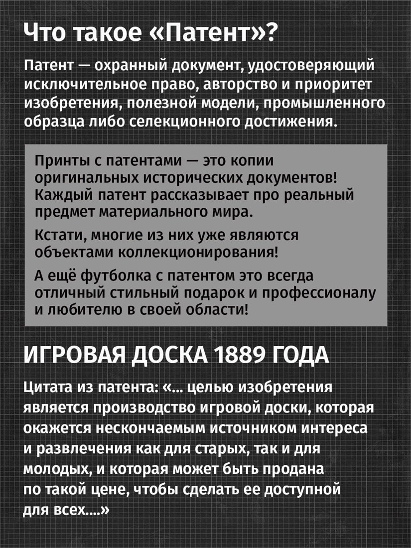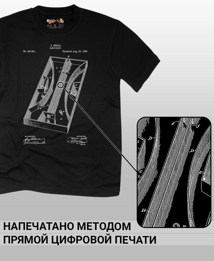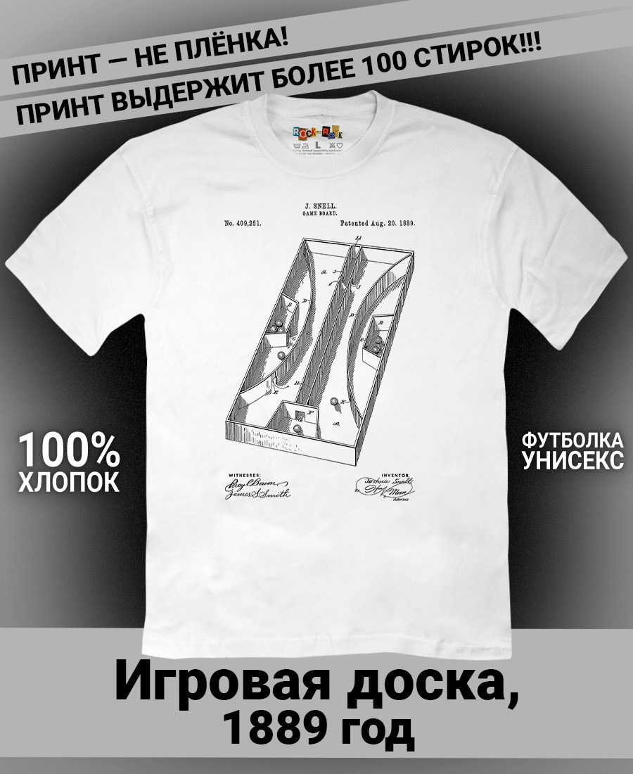 Футболки унисекс, чёрные и белые футболки с изображением патента Игровая доска, 1889 год. Эта модель футболки подходит как мужчинам, так и женщинам, а также адаптируется к различным типам фигуры. Наши принты выполнены методом полноцветной цифровой печати, что обеспечивает высокую износостойкость и насыщенность цветов. Ткань из 100 % хлопка и качественная печать гарантируют сохранение цвета и формы изделия после более чем 100 стирок. В этой серии представлены футболки с патентами на игры, игрушки, игрушечные механизмы, запатентованные с XIX по начало XX века. Также у нас есть футболки с изображениями патентов на тему Авто, Авиация; Видео и фото; Деньги; Игры и игрушки; Мода, стиль, красота; Мореплавание; Мото и вело; Музыка; Оружие и охота; Профессии и призвания. Ищите также по запросам: футболка для мужчин, мужские футболки, крутая футболка, футболка женская с принтом, футболка мужская с принтом, футболка на день рождения, необычная футболка, необычный подарок, футболка на вечеринку, качественная футболка, шикарная футболка, модная футболка, футболка для подарка, крутая футболка, футболка хайп, подарок парню, подарок девушке, подарок коллекционеру, подарок инженеру, футболка блоггеру, футболка стимпанк, ретро стиль, винтажная электроника, старые игрушки, монополия, ностальгия, аналоговая эстетика, олдскул техника.