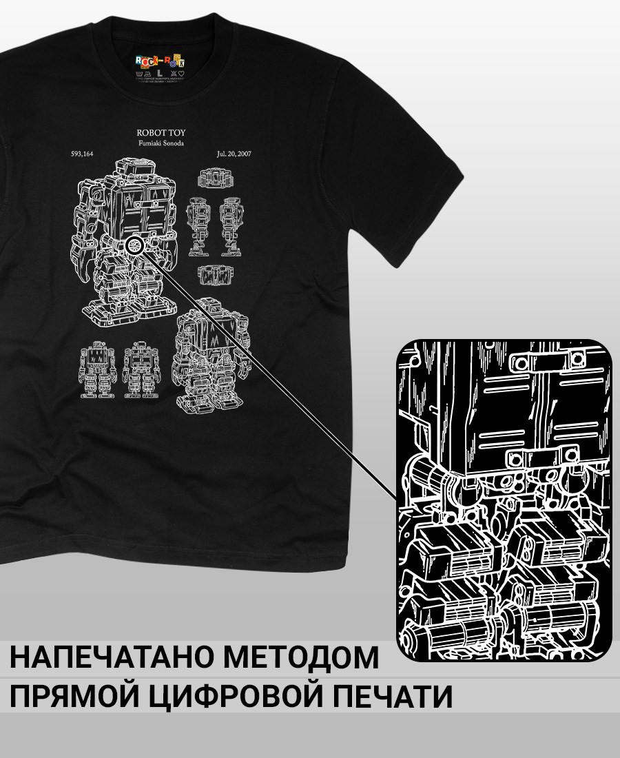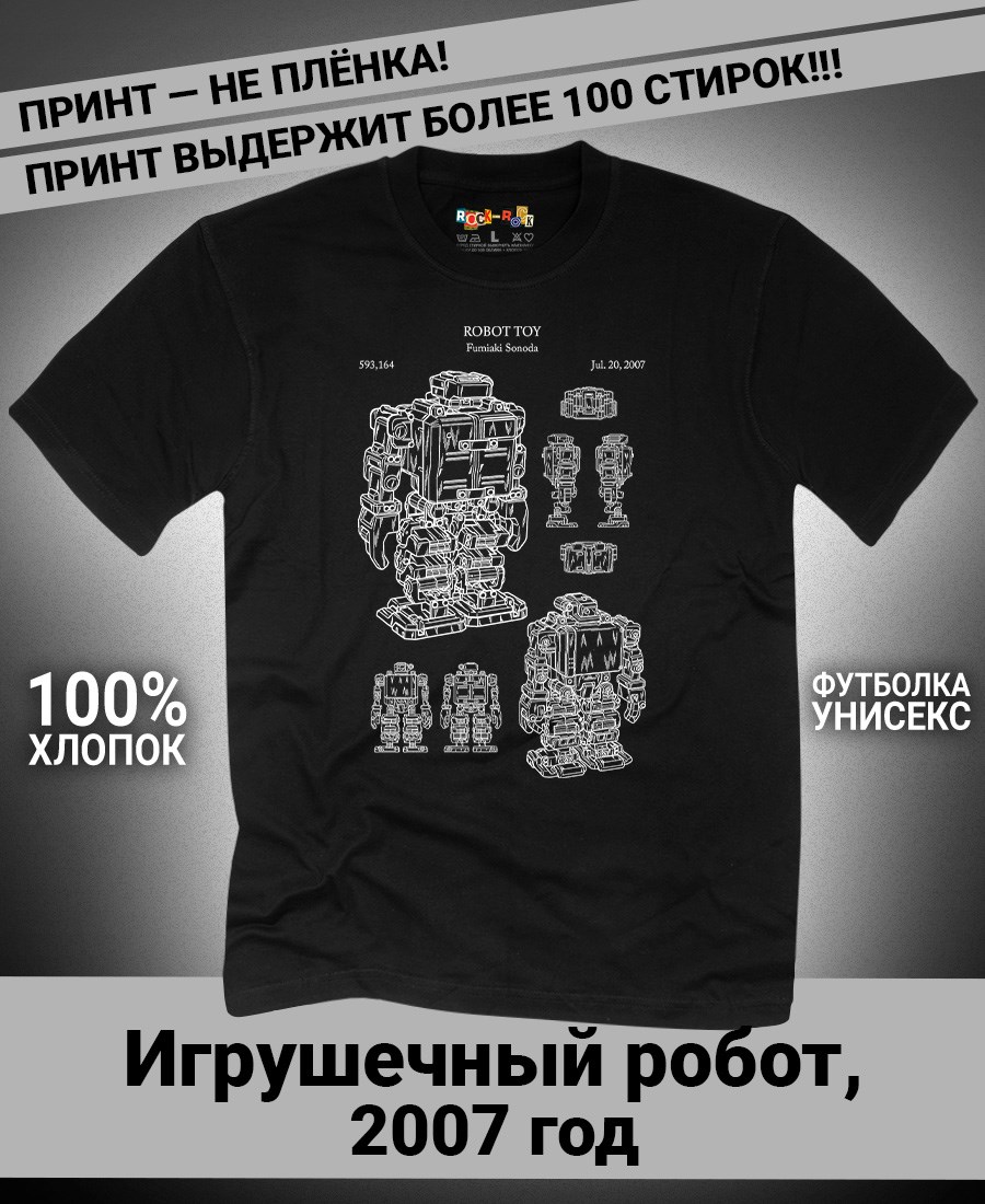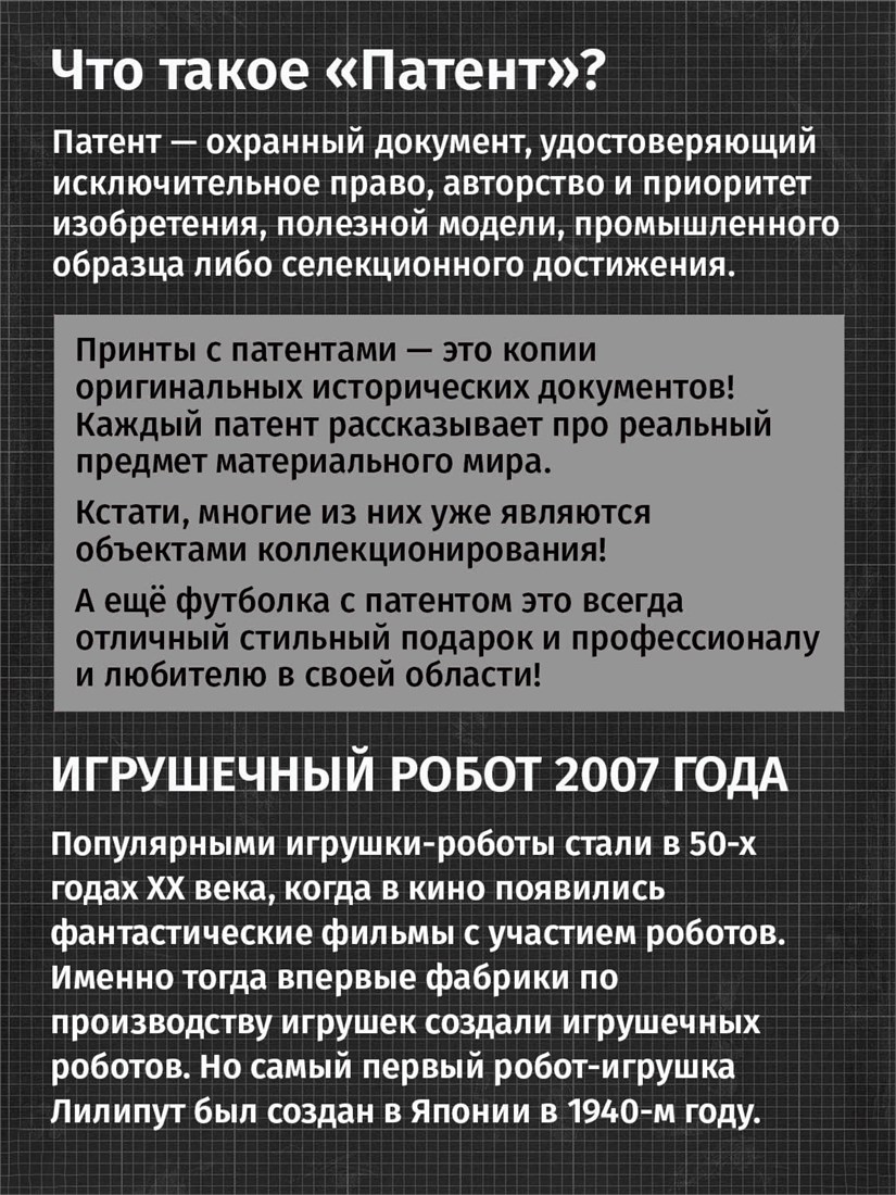 Футболки унисекс, чёрные и белые футболки с изображением патента Игрушечный робот, 2007 год. Эта модель футболки подходит как мужчинам, так и женщинам, а также адаптируется к различным типам фигуры. Наши принты выполнены методом полноцветной цифровой печати, что обеспечивает высокую износостойкость и насыщенность цветов. Ткань из 100 % хлопка и качественная печать гарантируют сохранение цвета и формы изделия после более чем 100 стирок. В этой серии представлены футболки с патентами на игры, игрушки, игрушечные механизмы, запатентованные с XIX по начало XX века. Также у нас есть футболки с изображениями патентов на тему Авто, Авиация; Видео и фото; Деньги; Игры и игрушки; Мода, стиль, красота; Мореплавание; Мото и вело; Музыка; Оружие и охота; Профессии и призвания. Ищите также по запросам: футболка для мужчин, мужские футболки, крутая футболка, футболка женская с принтом, футболка мужская с принтом, футболка на день рождения, необычная футболка, необычный подарок, футболка на вечеринку, качественная футболка, шикарная футболка, модная футболка, футболка для подарка, крутая футболка, футболка хайп, подарок парню, подарок девушке, подарок коллекционеру, подарок инженеру, футболка блоггеру, футболка стимпанк, ретро стиль, винтажная электроника, старые игрушки, монополия, ностальгия, аналоговая эстетика, олдскул техника.