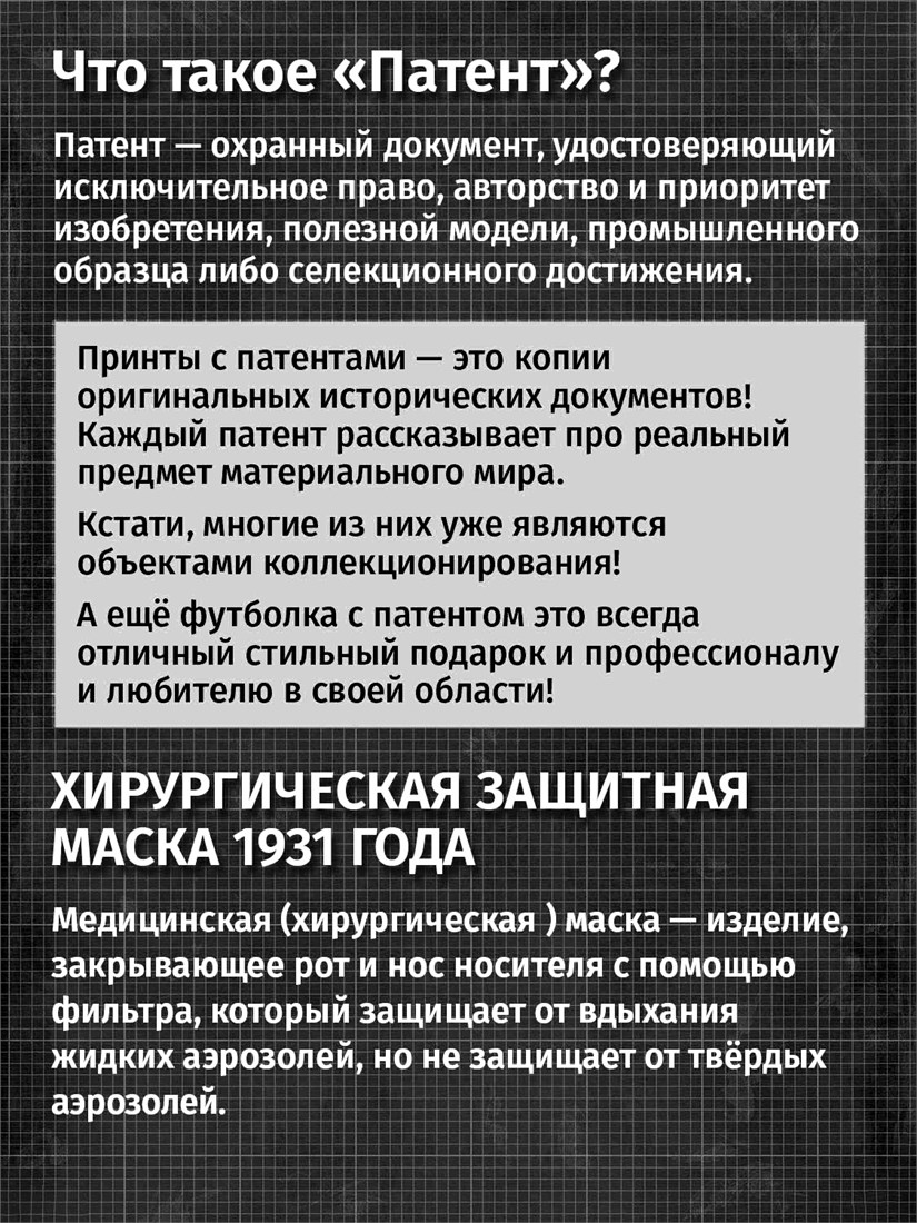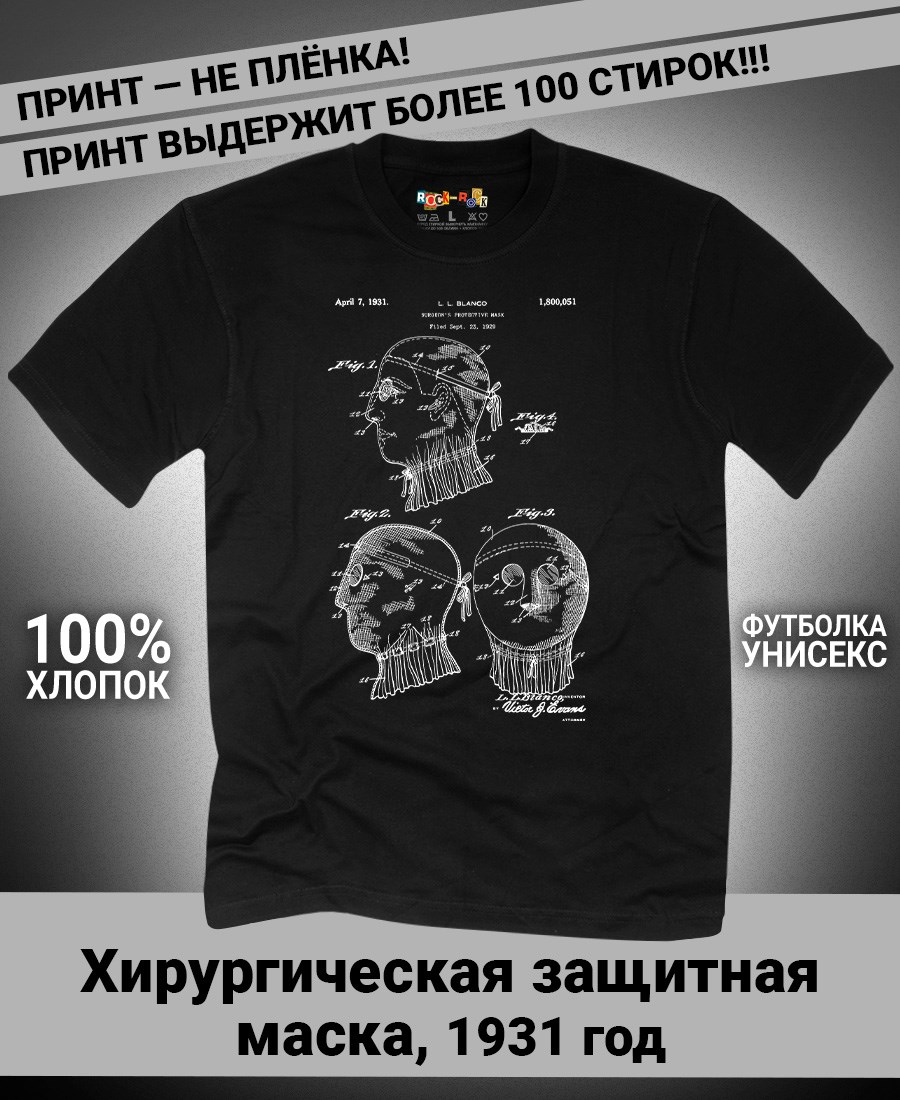 Футболки унисекс, чёрные и белые футболки с изображением патента Футболка Хирургическая защитная маска, 1931 год. Эта модель футболки подходит как мужчинам, так и женщинам, а также адаптируется к различным типам фигуры. Наши принты выполнены методом полноцветной цифровой печати, что обеспечивает высокую износостойкость и насыщенность цветов. Ткань из 100 % хлопка и качественная печать гарантируют сохранение цвета и формы изделия после более чем 100 стирок. В этой серии представлены футболки с патентами на анатомическую модель скелета, хирургическую маску, опору для пожрного рукава, маску пожарного, очки, скафандр, печатную машинку, локомотив, секундомер, магнето. Также у нас есть футболки с изображениями патентов на тему Авто, Авиация; Видео и фото; Деньги; Игры и игрушки; Мода, стиль, красота; Мореплавание; Мото и вело; Музыка; Оружие и охота; Профессии и призвания. Ищите также по запросам: футболка для мужчин, мужские футболки, крутая футболка, футболка женская с принтом, футболка мужская с принтом, футболка на день рождения, необычная футболка, необычный подарок, футболка на вечеринку, качественная футболка, шикарная футболка, модная футболка, футболка для подарка, крутая футболка, футболка хайп, подарок парню, подарок коллекционеру, подарок врачу, подарок пожарному, подарок космонавту, подарок писателю, подарок инжинеру, ретро стиль, винтажная, ностальгия, аналоговая эстетика, олдскул техника.