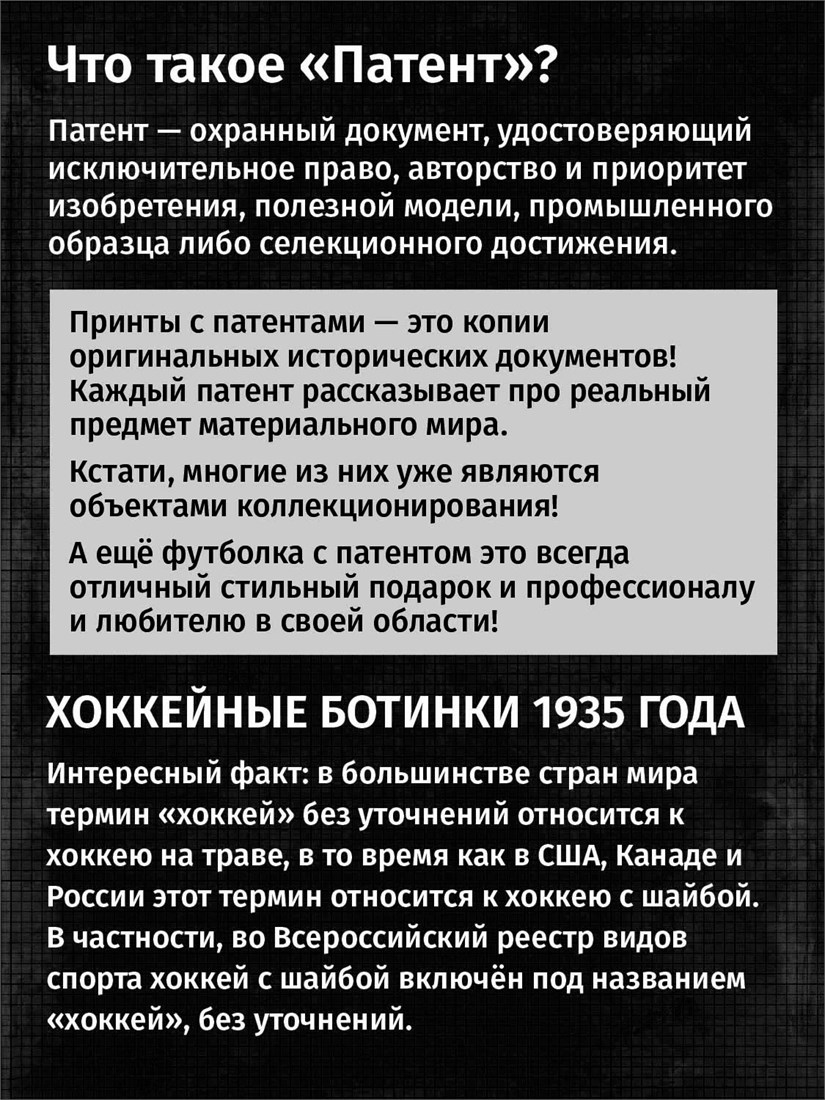 Футболки унисекс, чёрные и белые футболки с изображением патента Футболка Хоккейные ботинки, 1935 год. Эта модель футболки подходит как мужчинам, так и женщинам, а также адаптируется к различным типам фигуры. Наши принты выполнены методом полноцветной цифровой печати, что обеспечивает высокую износостойкость и насыщенность цветов. Ткань из 100 % хлопка и качественная печать гарантируют сохранение цвета и формы изделия после более чем 100 стирок. В этой серии представлены футболки с патентами на футбольные бутсы, футбольный мяч, боксёрский мешок, боксёрские перчатки, баскетбольную корзину, роликовые коньки, гантель, ледовые коньки, ракетку, хоккейные ботинки, хоккейную клюшку. Также у нас есть футболки с изображениями патентов на тему Авто, Авиация; Видео и фото; Деньги; Игры и игрушки; Мода, стиль, красота; Мореплавание; Мото и вело; Музыка; Оружие и охота; Профессии и призвания. Ищите также по запросам: футболка для мужчин, мужские футболки, крутая футболка, футболка женская с принтом, футболка мужская с принтом, футболка на день рождения, необычная футболка, необычный подарок, футболка на вечеринку, качественная футболка, шикарная футболка, модная футболка, футболка для подарка, крутая футболка, футболка хайп, подарок парню, подарок коллекционеру, подарок спортсмену, подарок футболисту, подарок хоккеисту, подарок фигуристу, подарок для стрелка, подарок тенниситу, подарок баскетболисту, подарок фитнес-тренеру, ретро стиль, винтажная, ностальгия, аналоговая эстетика, олдскул техника.