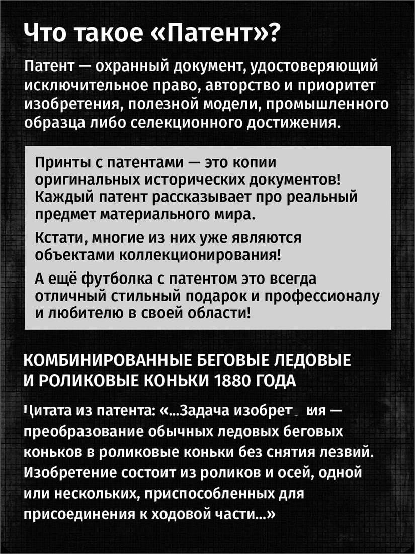 Футболки унисекс, чёрные и белые футболки с изображением патента Футболка Комбинированные беговые ледовые и роликовые коньки, 1880 год. Эта модель футболки подходит как мужчинам, так и женщинам, а также адаптируется к различным типам фигуры. Наши принты выполнены методом полноцветной цифровой печати, что обеспечивает высокую износостойкость и насыщенность цветов. Ткань из 100 % хлопка и качественная печать гарантируют сохранение цвета и формы изделия после более чем 100 стирок. В этой серии представлены футболки с патентами на футбольные бутсы, футбольный мяч, боксёрский мешок, боксёрские перчатки, баскетбольную корзину, роликовые коньки, гантель, ледовые коньки, ракетку, хоккейные ботинки, хоккейную клюшку. Также у нас есть футболки с изображениями патентов на тему Авто, Авиация; Видео и фото; Деньги; Игры и игрушки; Мода, стиль, красота; Мореплавание; Мото и вело; Музыка; Оружие и охота; Профессии и призвания. Ищите также по запросам: футболка для мужчин, мужские футболки, крутая футболка, футболка женская с принтом, футболка мужская с принтом, футболка на день рождения, необычная футболка, необычный подарок, футболка на вечеринку, качественная футболка, шикарная футболка, модная футболка, футболка для подарка, крутая футболка, футболка хайп, подарок парню, подарок коллекционеру, подарок спортсмену, подарок футболисту, подарок хоккеисту, подарок фигуристу, подарок для стрелка, подарок тенниситу, подарок баскетболисту, подарок фитнес-тренеру, ретро стиль, винтажная, ностальгия, аналоговая эстетика, олдскул техника.