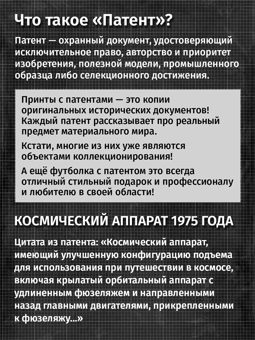 Футболки унисекс, чёрные и белые футболки с изображением патента Футболка Космический аппарат, 1975 год. Эта модель футболки подходит как мужчинам, так и женщинам, а также адаптируется к различным типам фигуры. Наши принты выполнены методом полноцветной цифровой печати, что обеспечивает высокую износостойкость и насыщенность цветов. Ткань из 100 % хлопка и качественная печать гарантируют сохранение цвета и формы изделия после более чем 100 стирок. В этой серии представлены футболки с патентами на анатомическую модель скелета, хирургическую маску, опору для пожрного рукава, маску пожарного, очки, скафандр, печатную машинку, локомотив, секундомер, магнето. Также у нас есть футболки с изображениями патентов на тему Авто, Авиация; Видео и фото; Деньги; Игры и игрушки; Мода, стиль, красота; Мореплавание; Мото и вело; Музыка; Оружие и охота; Профессии и призвания. Ищите также по запросам: футболка для мужчин, мужские футболки, крутая футболка, футболка женская с принтом, футболка мужская с принтом, футболка на день рождения, необычная футболка, необычный подарок, футболка на вечеринку, качественная футболка, шикарная футболка, модная футболка, футболка для подарка, крутая футболка, футболка хайп, подарок парню, подарок коллекционеру, подарок врачу, подарок пожарному, подарок космонавту, подарок писателю, подарок инжинеру, ретро стиль, винтажная, ностальгия, аналоговая эстетика, олдскул техника.