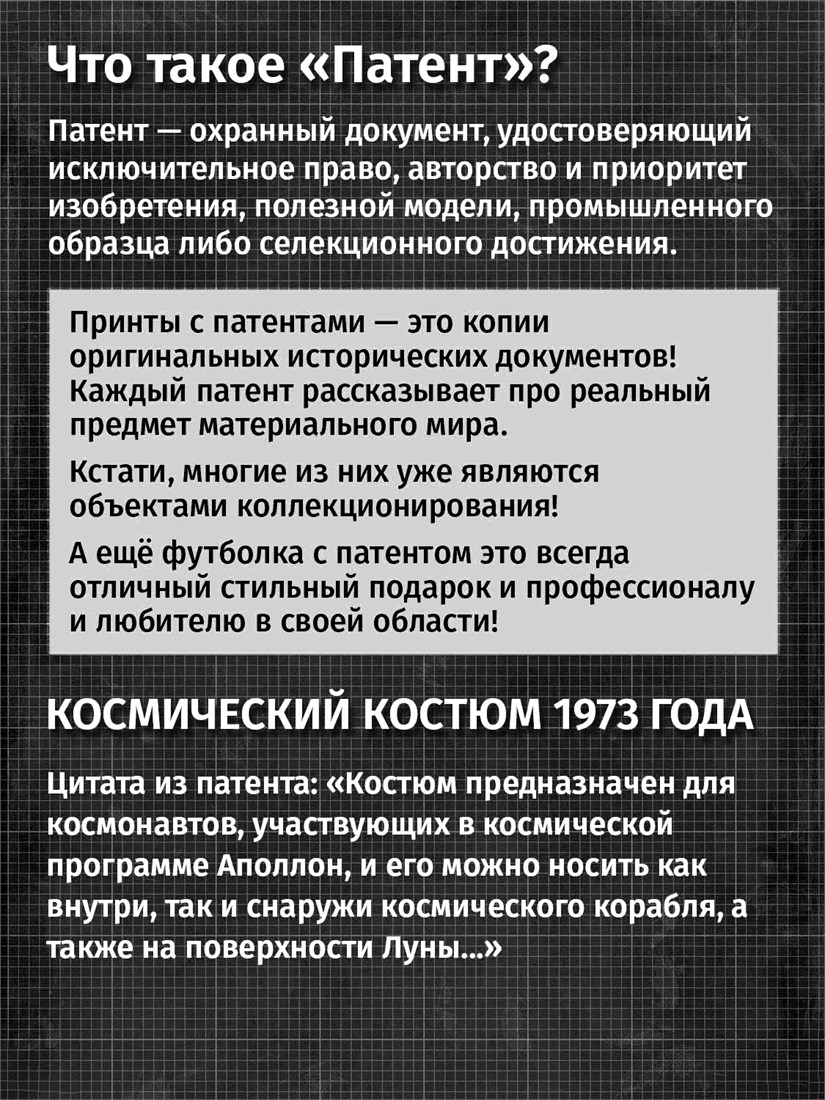 Футболки унисекс, чёрные и белые футболки с изображением патента Футболка Космический костюм, 1973 год. Эта модель футболки подходит как мужчинам, так и женщинам, а также адаптируется к различным типам фигуры. Наши принты выполнены методом полноцветной цифровой печати, что обеспечивает высокую износостойкость и насыщенность цветов. Ткань из 100 % хлопка и качественная печать гарантируют сохранение цвета и формы изделия после более чем 100 стирок. В этой серии представлены футболки с патентами на анатомическую модель скелета, хирургическую маску, опору для пожрного рукава, маску пожарного, очки, скафандр, печатную машинку, локомотив, секундомер, магнето. Также у нас есть футболки с изображениями патентов на тему Авто, Авиация; Видео и фото; Деньги; Игры и игрушки; Мода, стиль, красота; Мореплавание; Мото и вело; Музыка; Оружие и охота; Профессии и призвания. Ищите также по запросам: футболка для мужчин, мужские футболки, крутая футболка, футболка женская с принтом, футболка мужская с принтом, футболка на день рождения, необычная футболка, необычный подарок, футболка на вечеринку, качественная футболка, шикарная футболка, модная футболка, футболка для подарка, крутая футболка, футболка хайп, подарок парню, подарок коллекционеру, подарок врачу, подарок пожарному, подарок космонавту, подарок писателю, подарок инжинеру, ретро стиль, винтажная, ностальгия, аналоговая эстетика, олдскул техника.