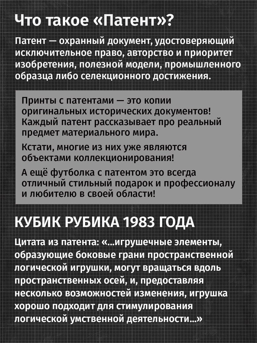 Футболки унисекс, чёрные и белые футболки с изображением патента Кубик Рубика, 1983 год. Эта модель футболки подходит как мужчинам, так и женщинам, а также адаптируется к различным типам фигуры. Наши принты выполнены методом полноцветной цифровой печати, что обеспечивает высокую износостойкость и насыщенность цветов. Ткань из 100 % хлопка и качественная печать гарантируют сохранение цвета и формы изделия после более чем 100 стирок. В этой серии представлены футболки с патентами на игры, игрушки, игрушечные механизмы, запатентованные с XIX по начало XX века. Также у нас есть футболки с изображениями патентов на тему Авто, Авиация; Видео и фото; Деньги; Игры и игрушки; Мода, стиль, красота; Мореплавание; Мото и вело; Музыка; Оружие и охота; Профессии и призвания. Ищите также по запросам: футболка для мужчин, мужские футболки, крутая футболка, футболка женская с принтом, футболка мужская с принтом, футболка на день рождения, необычная футболка, необычный подарок, футболка на вечеринку, качественная футболка, шикарная футболка, модная футболка, футболка для подарка, крутая футболка, футболка хайп, подарок парню, подарок девушке, подарок коллекционеру, подарок инженеру, футболка блоггеру, футболка стимпанк, ретро стиль, винтажная электроника, старые игрушки, монополия, ностальгия, аналоговая эстетика, олдскул техника.
