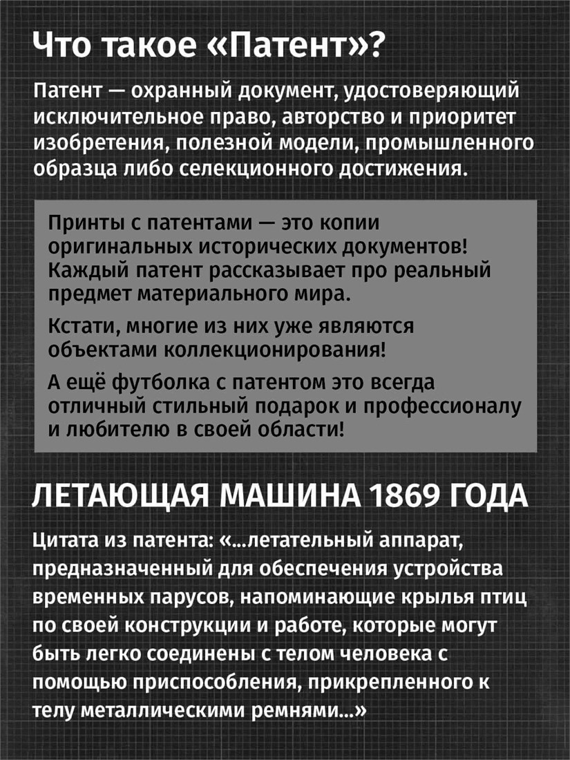 Футболки унисекс, чёрные и белые футболки с изображением патента Летающая машина, 1869 год. Эта модель футболки подходит как мужчинам, так и женщинам, а также адаптируется к различным типам фигуры. Наши принты выполнены методом полноцветной цифровой печати, что обеспечивает высокую износостойкость и насыщенность цветов. Ткань из 100 % хлопка и качественная печать гарантируют сохранение цвета и формы изделия после более чем 100 стирок. В этой серии представлены футболки с патентами на летающие машины, воздушный корабль, сверхзвуковой самолёт, аэроплан, самолёт с крыльями типа «чайка», вертолёт, АН-26, АН-12. Также у нас есть футболки с изображениями патентов на тему Авто, Авиация; Видео и фото; Деньги; Игры и игрушки; Мода, стиль, красота; Мореплавание; Мото и вело; Музыка; Оружие и охота; Профессии и призвания. Ищите также по запросам: футболка для мужчин, мужские футболки, крутая футболка, футболка женская с принтом, футболка мужская с принтом, футболка на день рождения, необычная футболка, необычный подарок, футболка на вечеринку, качественная футболка, шикарная футболка, модная футболка, футболка для подарка, крутая футболка, футболка хайп, подарок парню, подарок девушке, подарок летчику, подарок инженеру, футболка автолюбителю, футболка пилоту, футболка ВДВшнику, футболка десантнику.