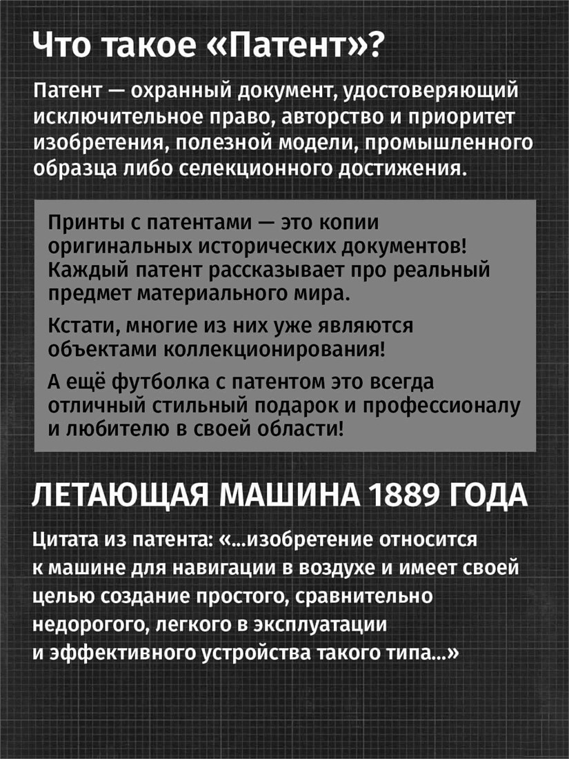 Футболки унисекс, чёрные и белые футболки с изображением патента Летающая машина, 1889 год. Эта модель футболки подходит как мужчинам, так и женщинам, а также адаптируется к различным типам фигуры. Наши принты выполнены методом полноцветной цифровой печати, что обеспечивает высокую износостойкость и насыщенность цветов. Ткань из 100 % хлопка и качественная печать гарантируют сохранение цвета и формы изделия после более чем 100 стирок. В этой серии представлены футболки с патентами на летающие машины, воздушный корабль, сверхзвуковой самолёт, аэроплан, самолёт с крыльями типа «чайка», вертолёт, АН-26, АН-12. Также у нас есть футболки с изображениями патентов на тему Авто, Авиация; Видео и фото; Деньги; Игры и игрушки; Мода, стиль, красота; Мореплавание; Мото и вело; Музыка; Оружие и охота; Профессии и призвания. Ищите также по запросам: футболка для мужчин, мужские футболки, крутая футболка, футболка женская с принтом, футболка мужская с принтом, футболка на день рождения, необычная футболка, необычный подарок, футболка на вечеринку, качественная футболка, шикарная футболка, модная футболка, футболка для подарка, крутая футболка, футболка хайп, подарок парню, подарок девушке, подарок летчику, подарок инженеру, футболка автолюбителю, футболка пилоту, футболка ВДВшнику, футболка десантнику.