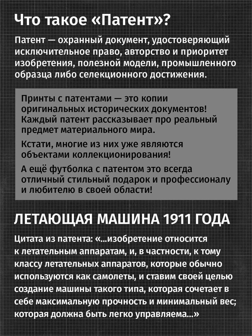 Футболки унисекс, чёрные и белые футболки с изображением патента Летающая машина, 1911 год. Эта модель футболки подходит как мужчинам, так и женщинам, а также адаптируется к различным типам фигуры. Наши принты выполнены методом полноцветной цифровой печати, что обеспечивает высокую износостойкость и насыщенность цветов. Ткань из 100 % хлопка и качественная печать гарантируют сохранение цвета и формы изделия после более чем 100 стирок. В этой серии представлены футболки с патентами на летающие машины, воздушный корабль, сверхзвуковой самолёт, аэроплан, самолёт с крыльями типа «чайка», вертолёт, АН-26, АН-12. Также у нас есть футболки с изображениями патентов на тему Авто, Авиация; Видео и фото; Деньги; Игры и игрушки; Мода, стиль, красота; Мореплавание; Мото и вело; Музыка; Оружие и охота; Профессии и призвания. Ищите также по запросам: футболка для мужчин, мужские футболки, крутая футболка, футболка женская с принтом, футболка мужская с принтом, футболка на день рождения, необычная футболка, необычный подарок, футболка на вечеринку, качественная футболка, шикарная футболка, модная футболка, футболка для подарка, крутая футболка, футболка хайп, подарок парню, подарок девушке, подарок летчику, подарок инженеру, футболка автолюбителю, футболка пилоту, футболка ВДВшнику, футболка десантнику.