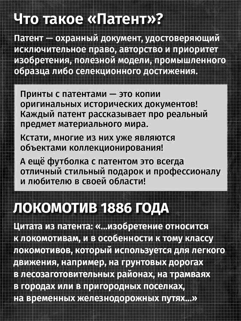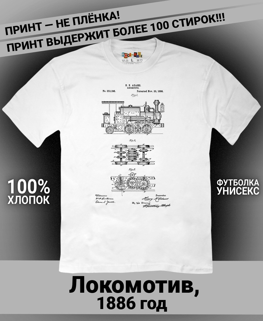 Футболки унисекс, чёрные и белые футболки с изображением патента Футболка Локомотив, 1886 год. Эта модель футболки подходит как мужчинам, так и женщинам, а также адаптируется к различным типам фигуры. Наши принты выполнены методом полноцветной цифровой печати, что обеспечивает высокую износостойкость и насыщенность цветов. Ткань из 100 % хлопка и качественная печать гарантируют сохранение цвета и формы изделия после более чем 100 стирок. В этой серии представлены футболки с патентами на анатомическую модель скелета, хирургическую маску, опору для пожрного рукава, маску пожарного, очки, скафандр, печатную машинку, локомотив, секундомер, магнето. Также у нас есть футболки с изображениями патентов на тему Авто, Авиация; Видео и фото; Деньги; Игры и игрушки; Мода, стиль, красота; Мореплавание; Мото и вело; Музыка; Оружие и охота; Профессии и призвания. Ищите также по запросам: футболка для мужчин, мужские футболки, крутая футболка, футболка женская с принтом, футболка мужская с принтом, футболка на день рождения, необычная футболка, необычный подарок, футболка на вечеринку, качественная футболка, шикарная футболка, модная футболка, футболка для подарка, крутая футболка, футболка хайп, подарок парню, подарок коллекционеру, подарок врачу, подарок пожарному, подарок космонавту, подарок писателю, подарок инжинеру, ретро стиль, винтажная, ностальгия, аналоговая эстетика, олдскул техника.