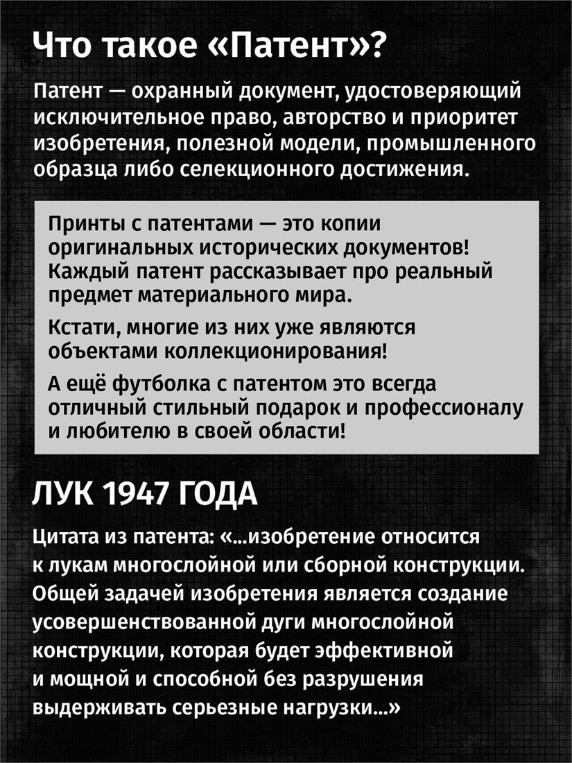 Футболки унисекс, чёрные и белые футболки с изображением патента Футболка Лук, 1947 год. Эта модель футболки подходит как мужчинам, так и женщинам, а также адаптируется к различным типам фигуры. Наши принты выполнены методом полноцветной цифровой печати, что обеспечивает высокую износостойкость и насыщенность цветов. Ткань из 100 % хлопка и качественная печать гарантируют сохранение цвета и формы изделия после более чем 100 стирок. В этой серии представлены футболки с патентами на футбольные бутсы, футбольный мяч, боксёрский мешок, боксёрские перчатки, баскетбольную корзину, роликовые коньки, гантель, ледовые коньки, ракетку, хоккейные ботинки, хоккейную клюшку. Также у нас есть футболки с изображениями патентов на тему Авто, Авиация; Видео и фото; Деньги; Игры и игрушки; Мода, стиль, красота; Мореплавание; Мото и вело; Музыка; Оружие и охота; Профессии и призвания. Ищите также по запросам: футболка для мужчин, мужские футболки, крутая футболка, футболка женская с принтом, футболка мужская с принтом, футболка на день рождения, необычная футболка, необычный подарок, футболка на вечеринку, качественная футболка, шикарная футболка, модная футболка, футболка для подарка, крутая футболка, футболка хайп, подарок парню, подарок коллекционеру, подарок спортсмену, подарок футболисту, подарок хоккеисту, подарок фигуристу, подарок для стрелка, подарок тенниситу, подарок баскетболисту, подарок фитнес-тренеру, ретро стиль, винтажная, ностальгия, аналоговая эстетика, олдскул техника.