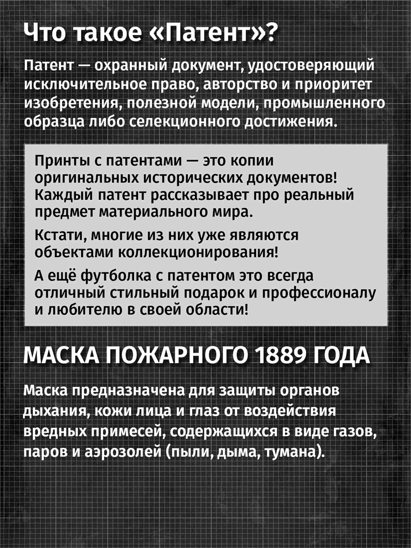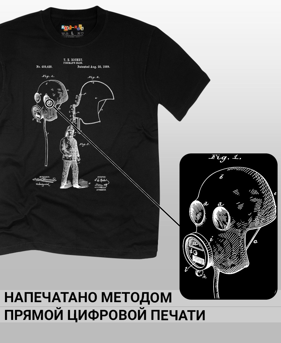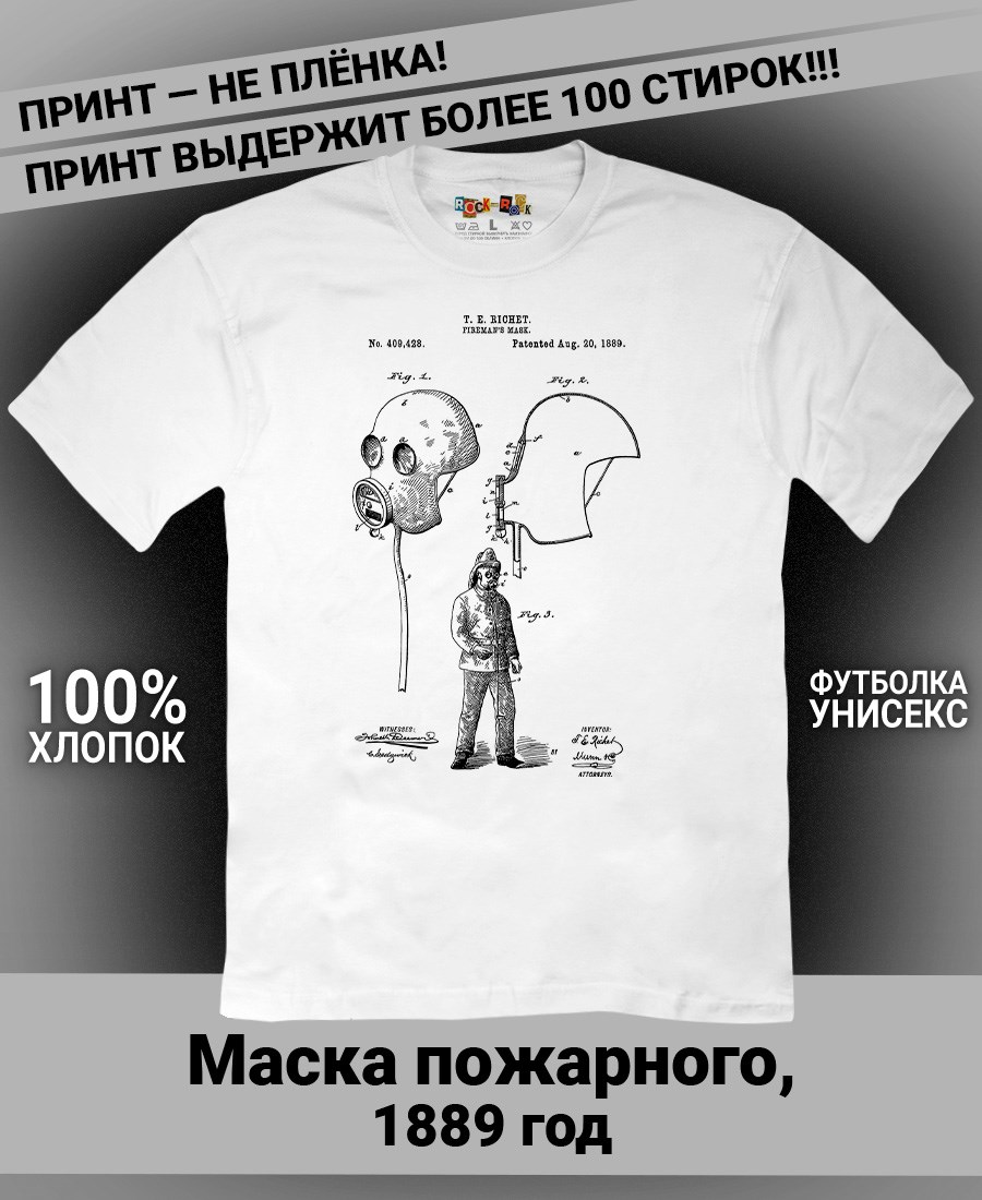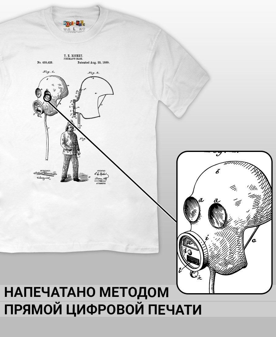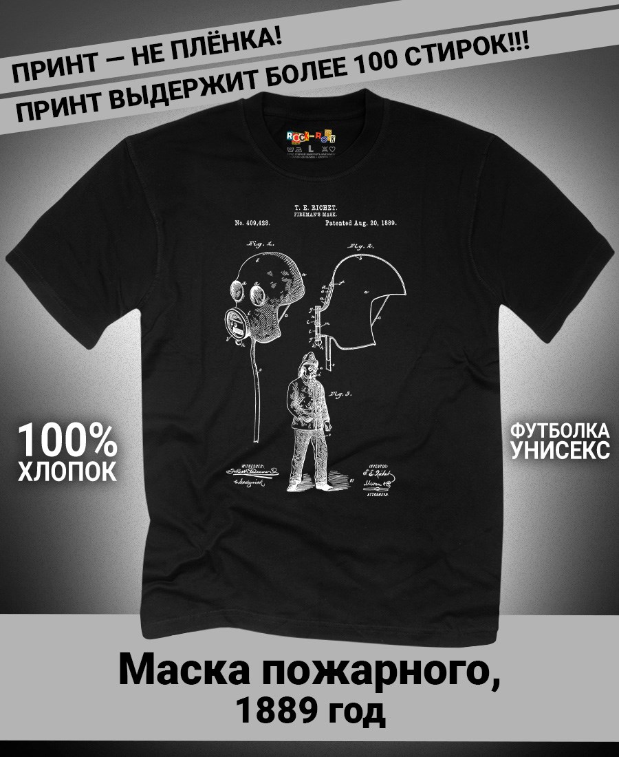 Футболки унисекс, чёрные и белые футболки с изображением патента Футболка Маска пожарного, 1889 год. Эта модель футболки подходит как мужчинам, так и женщинам, а также адаптируется к различным типам фигуры. Наши принты выполнены методом полноцветной цифровой печати, что обеспечивает высокую износостойкость и насыщенность цветов. Ткань из 100 % хлопка и качественная печать гарантируют сохранение цвета и формы изделия после более чем 100 стирок. В этой серии представлены футболки с патентами на анатомическую модель скелета, хирургическую маску, опору для пожрного рукава, маску пожарного, очки, скафандр, печатную машинку, локомотив, секундомер, магнето. Также у нас есть футболки с изображениями патентов на тему Авто, Авиация; Видео и фото; Деньги; Игры и игрушки; Мода, стиль, красота; Мореплавание; Мото и вело; Музыка; Оружие и охота; Профессии и призвания. Ищите также по запросам: футболка для мужчин, мужские футболки, крутая футболка, футболка женская с принтом, футболка мужская с принтом, футболка на день рождения, необычная футболка, необычный подарок, футболка на вечеринку, качественная футболка, шикарная футболка, модная футболка, футболка для подарка, крутая футболка, футболка хайп, подарок парню, подарок коллекционеру, подарок врачу, подарок пожарному, подарок космонавту, подарок писателю, подарок инжинеру, ретро стиль, винтажная, ностальгия, аналоговая эстетика, олдскул техника.