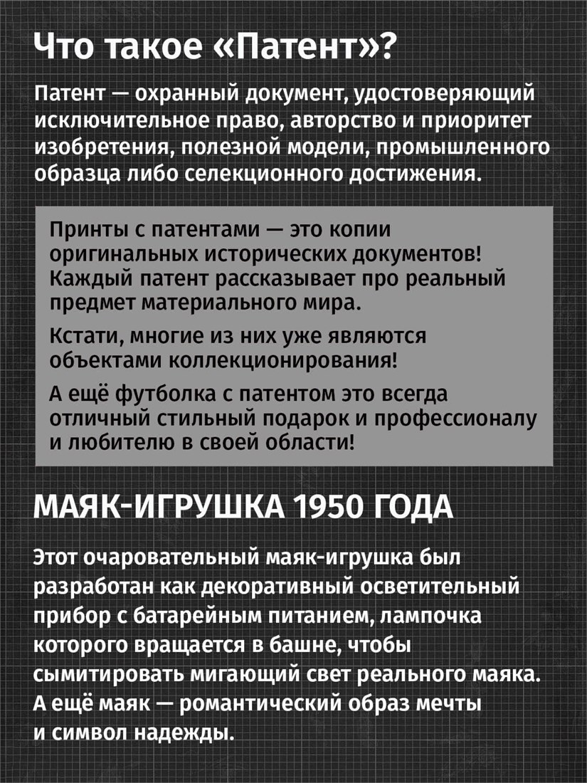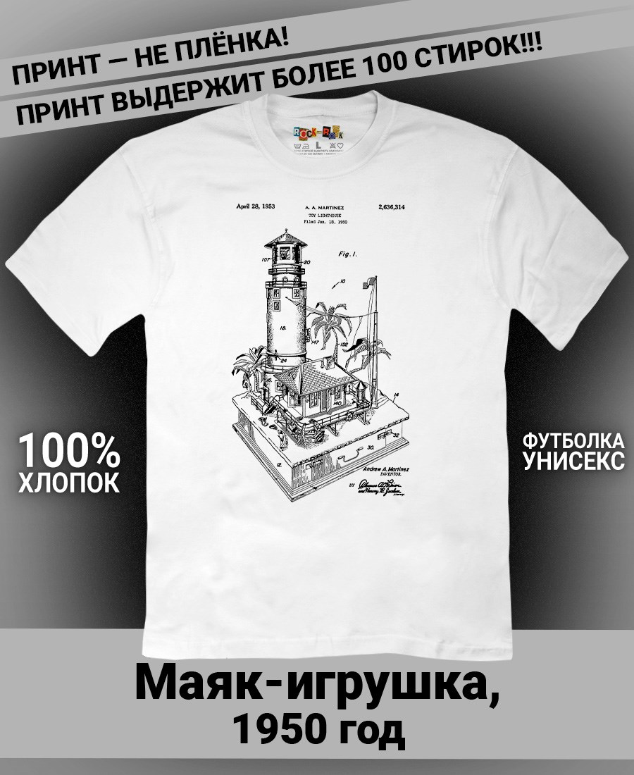 Футболки унисекс, чёрные и белые футболки с изображением патента Маяк-игрушка, 1950 год. Эта модель футболки подходит как мужчинам, так и женщинам, а также адаптируется к различным типам фигуры. Наши принты выполнены методом полноцветной цифровой печати, что обеспечивает высокую износостойкость и насыщенность цветов. Ткань из 100 % хлопка и качественная печать гарантируют сохранение цвета и формы изделия после более чем 100 стирок. В этой серии представлены футболки с патентами на игры, игрушки, игрушечные механизмы, запатентованные с XIX по начало XX века. Также у нас есть футболки с изображениями патентов на тему Авто, Авиация; Видео и фото; Деньги; Игры и игрушки; Мода, стиль, красота; Мореплавание; Мото и вело; Музыка; Оружие и охота; Профессии и призвания. Ищите также по запросам: футболка для мужчин, мужские футболки, крутая футболка, футболка женская с принтом, футболка мужская с принтом, футболка на день рождения, необычная футболка, необычный подарок, футболка на вечеринку, качественная футболка, шикарная футболка, модная футболка, футболка для подарка, крутая футболка, футболка хайп, подарок парню, подарок девушке, подарок коллекционеру, подарок инженеру, футболка блоггеру, футболка стимпанк, ретро стиль, винтажная электроника, старые игрушки, монополия, ностальгия, аналоговая эстетика, олдскул техника.