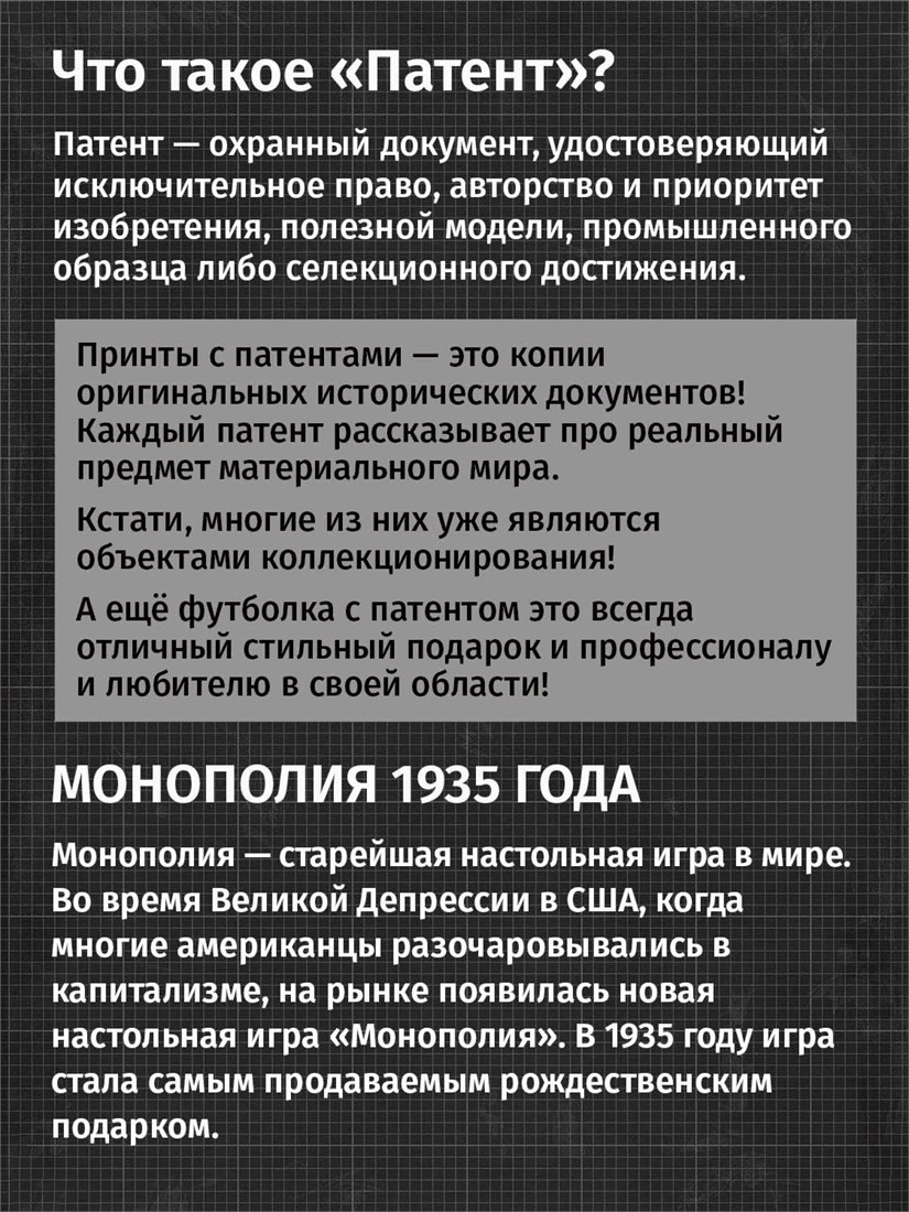 Футболки унисекс, чёрные и белые футболки с изображением патента Монополия, 1935 год. Эта модель футболки подходит как мужчинам, так и женщинам, а также адаптируется к различным типам фигуры. Наши принты выполнены методом полноцветной цифровой печати, что обеспечивает высокую износостойкость и насыщенность цветов. Ткань из 100 % хлопка и качественная печать гарантируют сохранение цвета и формы изделия после более чем 100 стирок. В этой серии представлены футболки с патентами на игры, игрушки, игрушечные механизмы, запатентованные с XIX по начало XX века. Также у нас есть футболки с изображениями патентов на тему Авто, Авиация; Видео и фото; Деньги; Игры и игрушки; Мода, стиль, красота; Мореплавание; Мото и вело; Музыка; Оружие и охота; Профессии и призвания. Ищите также по запросам: футболка для мужчин, мужские футболки, крутая футболка, футболка женская с принтом, футболка мужская с принтом, футболка на день рождения, необычная футболка, необычный подарок, футболка на вечеринку, качественная футболка, шикарная футболка, модная футболка, футболка для подарка, крутая футболка, футболка хайп, подарок парню, подарок девушке, подарок коллекционеру, подарок инженеру, футболка блоггеру, футболка стимпанк, ретро стиль, винтажная электроника, старые игрушки, монополия, ностальгия, аналоговая эстетика, олдскул техника.