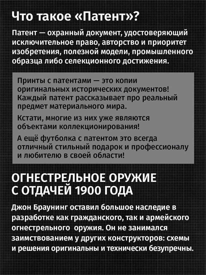 Футболки унисекс, чёрные и белые футболки с изображением патента Огнестрельное оружие с отдачей, 1900 год. Эта модель футболки подходит как мужчинам, так и женщинам, а также адаптируется к различным типам фигуры. Наши принты выполнены методом полноцветной цифровой печати, что обеспечивает высокую износостойкость и насыщенность цветов. Ткань из 100 % хлопка и качественная печать гарантируют сохранение цвета и формы изделия после более чем 100 стирок. В этой серии представлены футболки с патентами на револьверы, ружья, автоматы, гранаты, охотничьи ножи. Также у нас есть футболки с изображениями патентов на тему Авто, Авиация; Видео и фото; Деньги; Игры и игрушки; Мода, стиль, красота; Мореплавание; Мото и вело; Музыка; Оружие и охота; Профессии и призвания. Ищите также по запросам: футболка для мужчин, мужские футболки, крутая футболка, футболка женская с принтом, футболка мужская с принтом, футболка на день рождения, необычная футболка, необычный подарок, футболка на вечеринку, качественная футболка, шикарная футболка, модная футболка, футболка для подарка, крутая футболка, футболка хайп, подарок парню, подарок коллекционеру, подарок охотнику, подарок воину, ретро стиль, винтажная, ностальгия, аналоговая эстетика, олдскул техника.