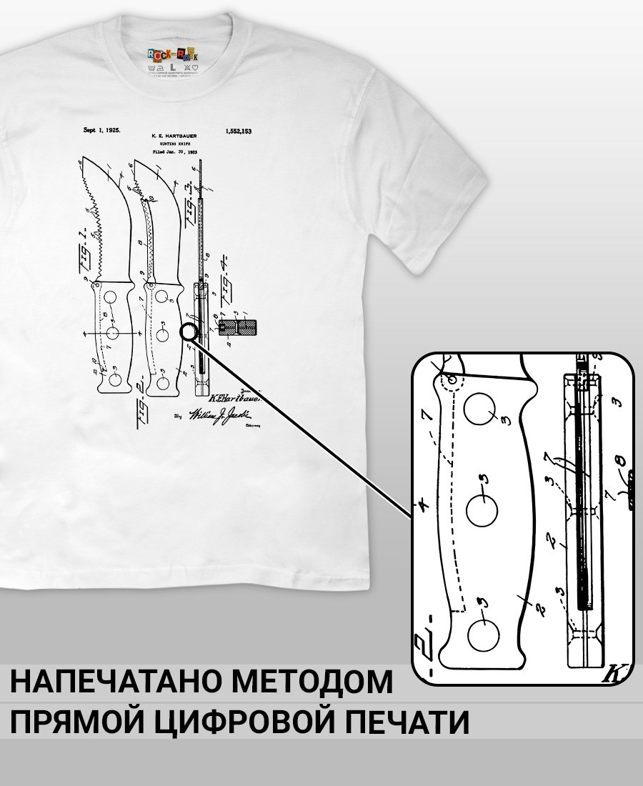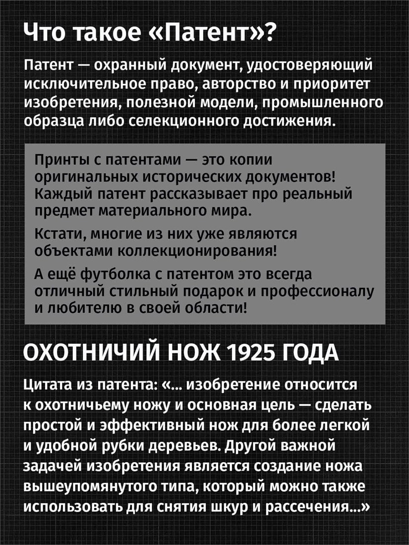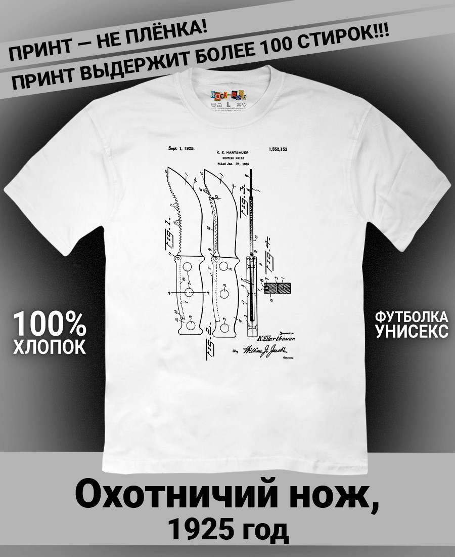 Футболки унисекс, чёрные и белые футболки с изображением патента Охотничий нож, 1925 год. Эта модель футболки подходит как мужчинам, так и женщинам, а также адаптируется к различным типам фигуры. Наши принты выполнены методом полноцветной цифровой печати, что обеспечивает высокую износостойкость и насыщенность цветов. Ткань из 100 % хлопка и качественная печать гарантируют сохранение цвета и формы изделия после более чем 100 стирок. В этой серии представлены футболки с патентами на револьверы, ружья, автоматы, гранаты, охотничьи ножи. Также у нас есть футболки с изображениями патентов на тему Авто, Авиация; Видео и фото; Деньги; Игры и игрушки; Мода, стиль, красота; Мореплавание; Мото и вело; Музыка; Оружие и охота; Профессии и призвания. Ищите также по запросам: футболка для мужчин, мужские футболки, крутая футболка, футболка женская с принтом, футболка мужская с принтом, футболка на день рождения, необычная футболка, необычный подарок, футболка на вечеринку, качественная футболка, шикарная футболка, модная футболка, футболка для подарка, крутая футболка, футболка хайп, подарок парню, подарок коллекционеру, подарок охотнику, подарок воину, ретро стиль, винтажная, ностальгия, аналоговая эстетика, олдскул техника.