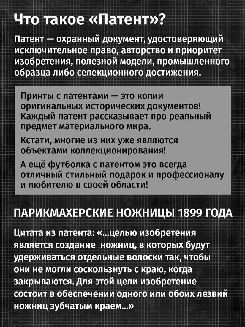 Футболки унисекс, чёрные и белые футболки с изображением патента Парикмахерские ножницы, 1899 год. Эта модель футболки подходит как мужчинам, так и женщинам, а также адаптируется к различным типам фигуры. Наши принты выполнены методом полноцветной цифровой печати, что обеспечивает высокую износостойкость и насыщенность цветов. Ткань из 100 % хлопка и качественная печать гарантируют сохранение цвета и формы изделия после более чем 100 стирок. В этой серии представлены футболки с патентами на парикмахерские ножницы, опасную бритву, флакон для духов, футляр для помады, несессер, портновский манекен. Также у нас есть футболки с изображениями патентов на тему Авто, Авиация; Видео и фото; Деньги; Игры и игрушки; Мода, стиль, красота; Мореплавание; Мото и вело; Музыка; Оружие и охота; Профессии и призвания. Ищите также по запросам: футболка для мужчин, мужские футболки, крутая футболка, футболка женская с принтом, футболка мужская с принтом, футболка на день рождения, необычная футболка, необычный подарок, футболка на вечеринку, качественная футболка, шикарная футболка, модная футболка, футболка для подарка, крутая футболка, футболка хайп, подарок парню, подарок девушке, подарок коллекционеру, подарок модельеру, подарок парикмахеру, подарок бьюти-блогеру, подарок стилисту, подарок швее, подарок барберу, футболка блоггеру, футболка стимпанк, ретро стиль, винтажная, ностальгия, аналоговая эстетика, олдскул техника.