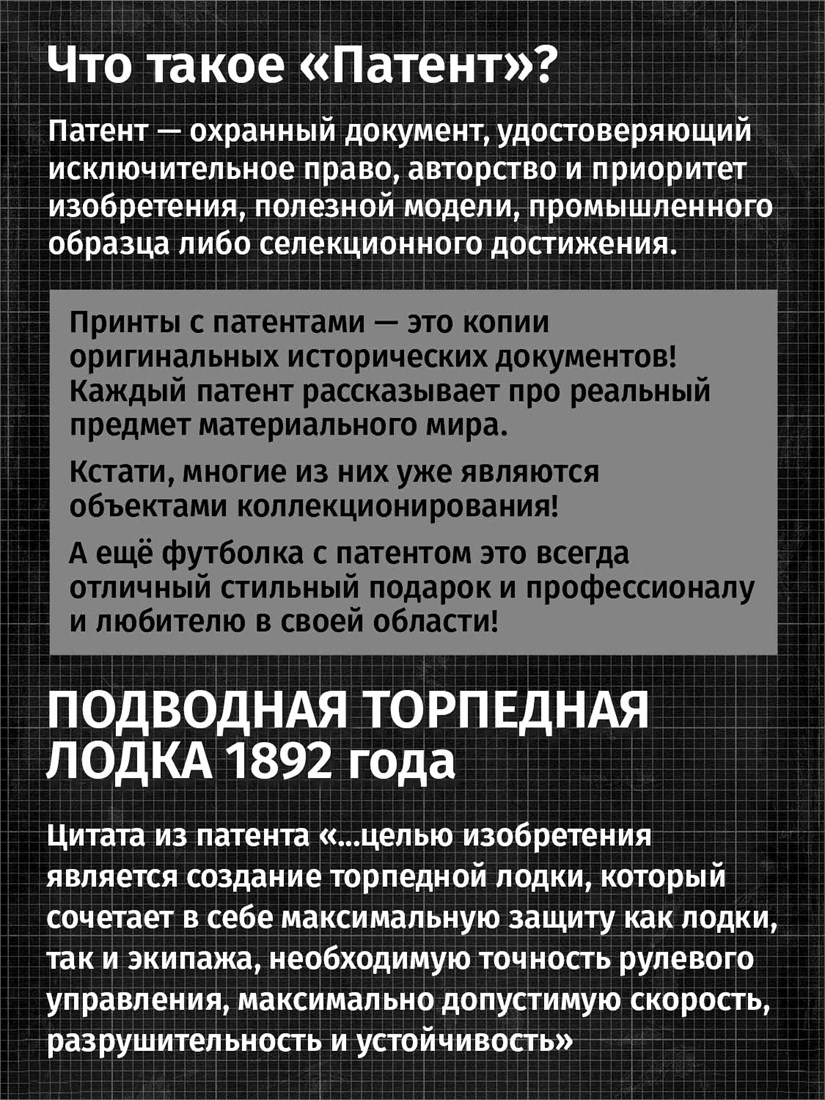 Футболки унисекс, чёрные и белые футболки с изображением патента Подводная торпедная лодка, 1892 год. Эта модель футболки подходит как мужчинам, так и женщинам, а также адаптируется к различным типам фигуры. Наши принты выполнены методом полноцветной цифровой печати, что обеспечивает высокую износостойкость и насыщенность цветов. Ткань из 100 % хлопка и качественная печать гарантируют сохранение цвета и формы изделия после более чем 100 стирок. В этой серии представлены футболки с патентами на подводные лодки, парусные лодки, шлюпки, такелаж, каноэ, водолазные костюм, компас. Также у нас есть футболки с изображениями патентов на тему Авто, Авиация; Видео и фото; Деньги; Игры и игрушки; Мода, стиль, красота; Мореплавание; Мото и вело; Музыка; Оружие и охота; Профессии и призвания. Ищите также по запросам: футболка для мужчин, мужские футболки, крутая футболка, футболка женская с принтом, футболка мужская с принтом, футболка на день рождения, необычная футболка, необычный подарок, футболка на вечеринку, качественная футболка, шикарная футболка, модная футболка, футболка для подарка, крутая футболка, футболка хайп, подарок парню, подарок девушке, подарок коллекционеру, подарок моряку, подарок яхтеру, подарок яхтсмену, подарок путешественнику, подарок дайверу, подарок речнику, футболка блоггеру, футболка стимпанк, ретро стиль, винтажная, ностальгия, аналоговая эстетика, олдскул техника.
