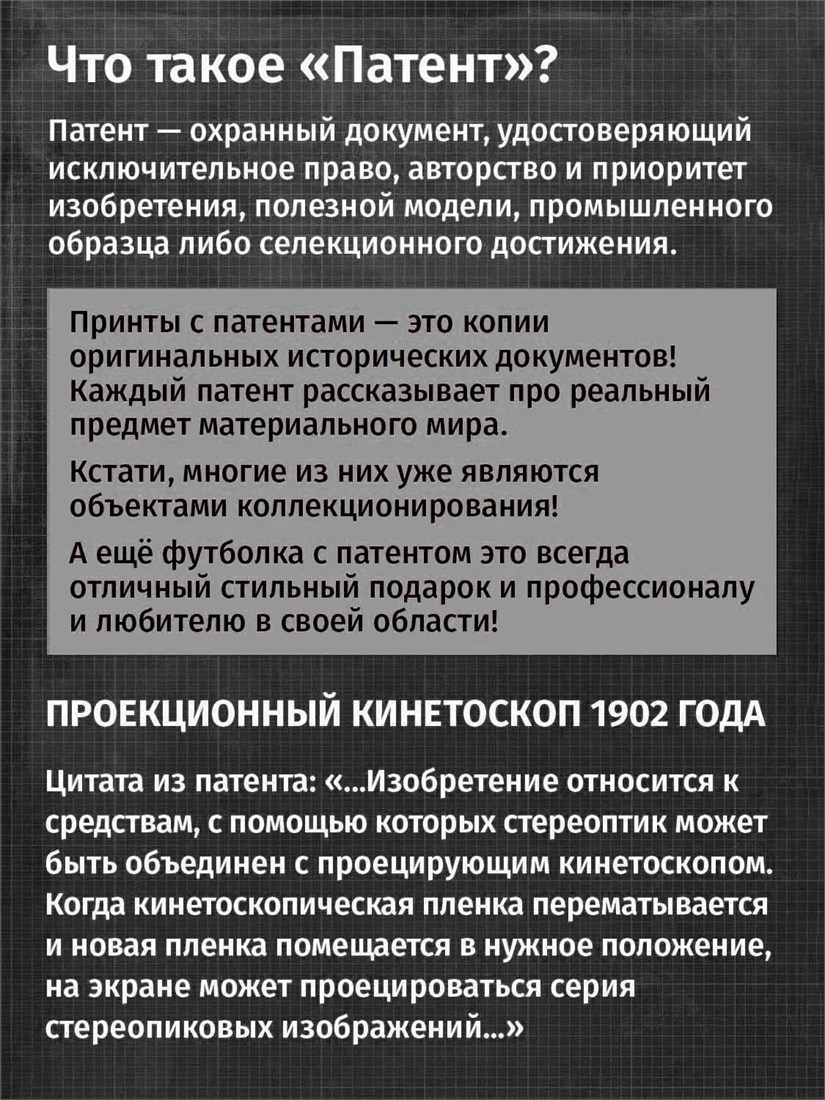 Футболки унисекс, чёрные и белые футболки с изображением патента Фотокамера, 1902 год. Эта модель футболки подходит как мужчинам, так и женщинам, а также адаптируется к различным типам фигуры. Наши принты выполнены методом полноцветной цифровой печати, что обеспечивает высокую износостойкость и насыщенность цветов. Ткань из 100 % хлопка и качественная печать гарантируют сохранение цвета и формы изделия после более чем 100 стирок. В этой серии представлены футболки с патентами на фотоаппараты, кинетоскопы, телевизионный аппарат с конца XIX по начало XX века. Также у нас есть футболки с изображениями патентов на тему Авто, Авиация; Видео и фото; Деньги; Игры и игрушки; Мода, стиль, красота; Мореплавание; Мото и вело; Музыка; Оружие и охота; Профессии и призвания. Ищите также по запросам: футболка для мужчин, мужские футболки, крутая футболка, футболка женская с принтом, футболка мужская с принтом, футболка на день рождения, необычная футболка, необычный подарок, футболка на вечеринку, качественная футболка, шикарная футболка, модная футболка, футболка для подарка, крутая футболка, футболка хайп, подарок парню, подарок девушке, подарок фотографу, подарок инженеру, футболка фотолюбителю, футболка блоггеру, футболка оператору, футболка киношнику, футболка стимпанк, ретро стиль, винтажная электроника, старые фотоаппараты, кинокамеры, ностальгия по 80-м, аналоговая эстетика, олдскул техника.