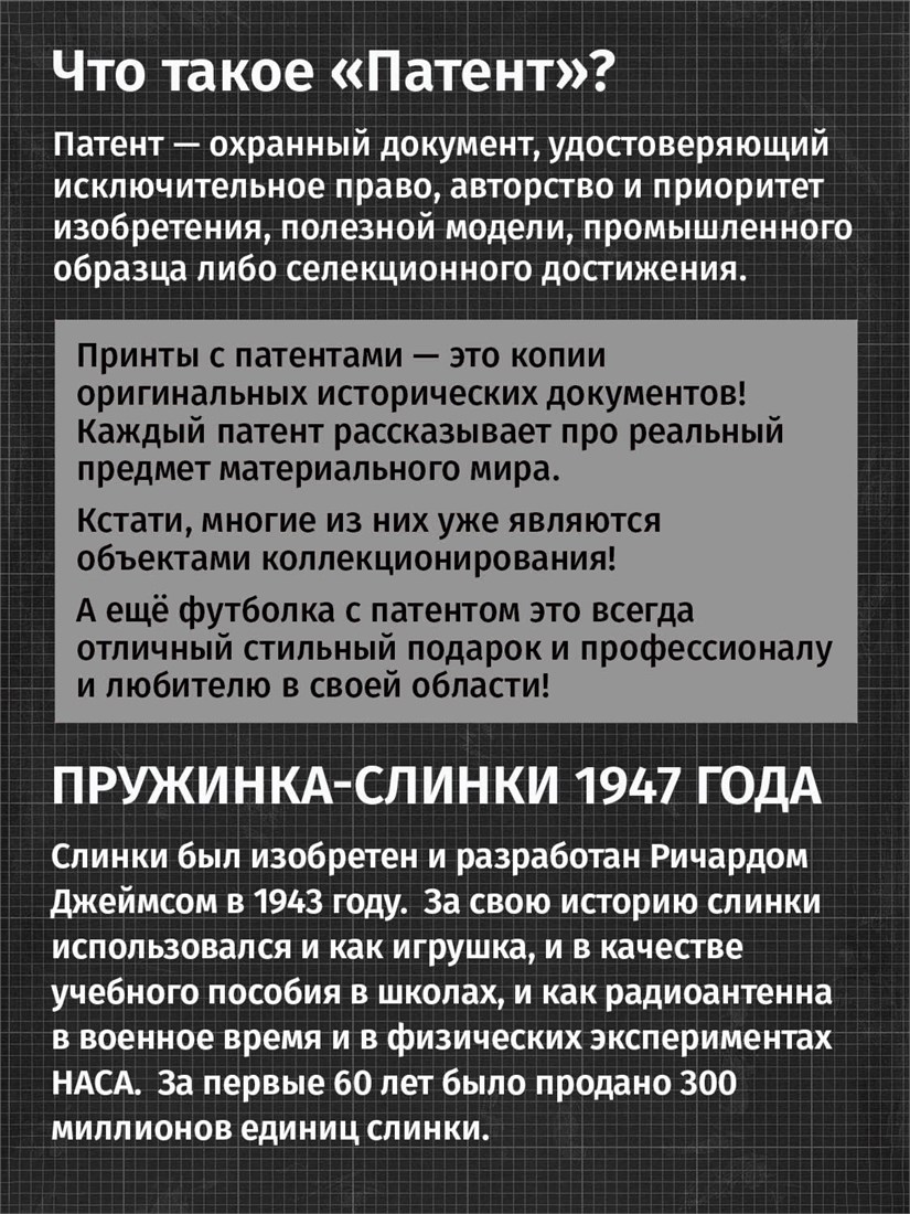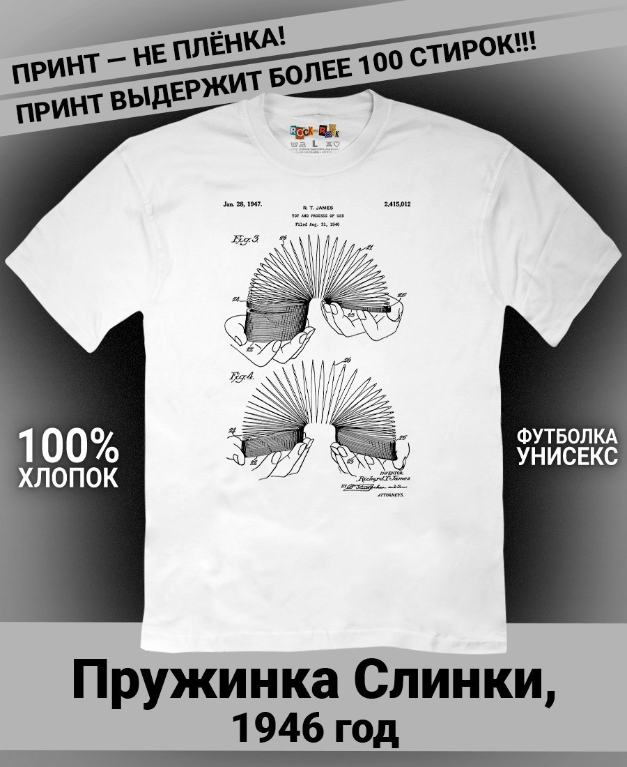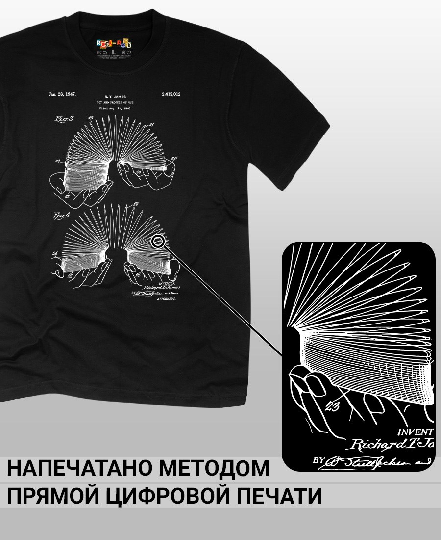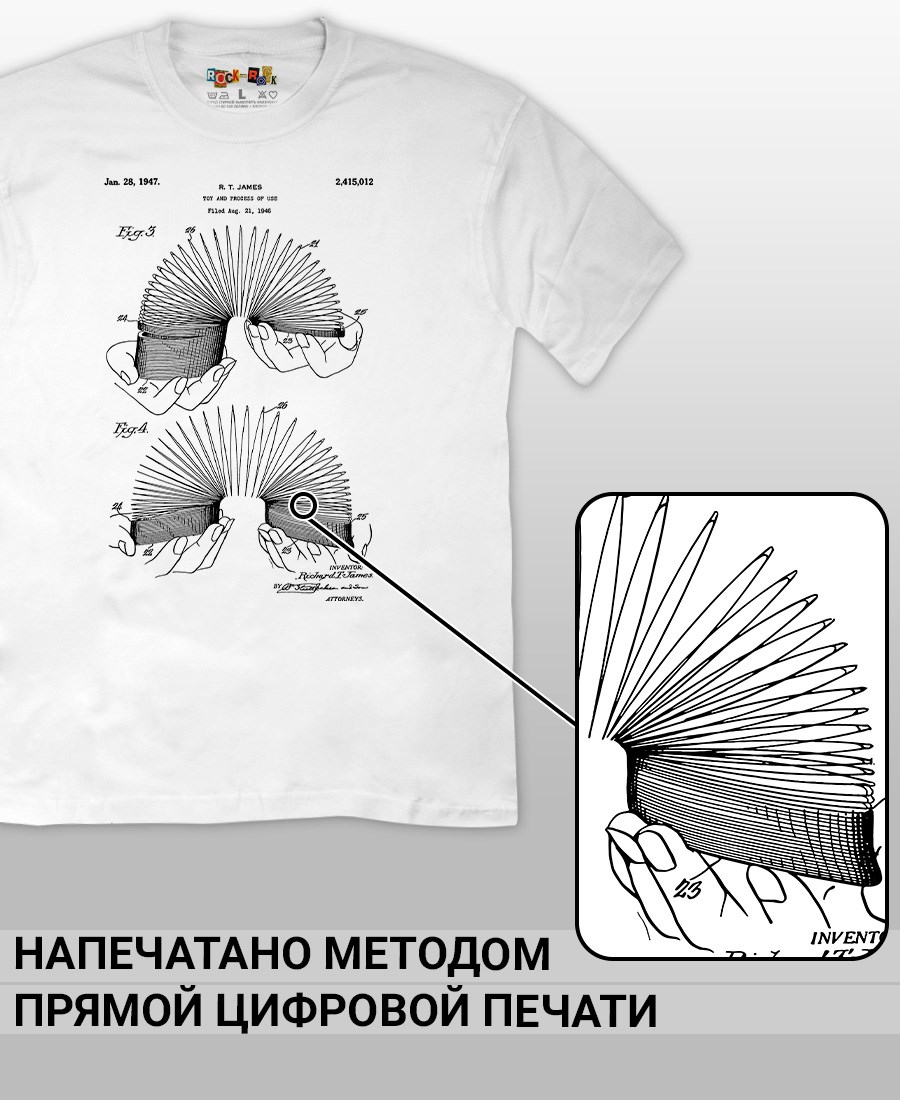 Футболки унисекс, чёрные и белые футболки с изображением патента Пружинка Слинки, 1946 год. Эта модель футболки подходит как мужчинам, так и женщинам, а также адаптируется к различным типам фигуры. Наши принты выполнены методом полноцветной цифровой печати, что обеспечивает высокую износостойкость и насыщенность цветов. Ткань из 100 % хлопка и качественная печать гарантируют сохранение цвета и формы изделия после более чем 100 стирок. В этой серии представлены футболки с патентами на игры, игрушки, игрушечные механизмы, запатентованные с XIX по начало XX века. Также у нас есть футболки с изображениями патентов на тему Авто, Авиация; Видео и фото; Деньги; Игры и игрушки; Мода, стиль, красота; Мореплавание; Мото и вело; Музыка; Оружие и охота; Профессии и призвания. Ищите также по запросам: футболка для мужчин, мужские футболки, крутая футболка, футболка женская с принтом, футболка мужская с принтом, футболка на день рождения, необычная футболка, необычный подарок, футболка на вечеринку, качественная футболка, шикарная футболка, модная футболка, футболка для подарка, крутая футболка, футболка хайп, подарок парню, подарок девушке, подарок коллекционеру, подарок инженеру, футболка блоггеру, футболка стимпанк, ретро стиль, винтажная электроника, старые игрушки, монополия, ностальгия, аналоговая эстетика, олдскул техника.
