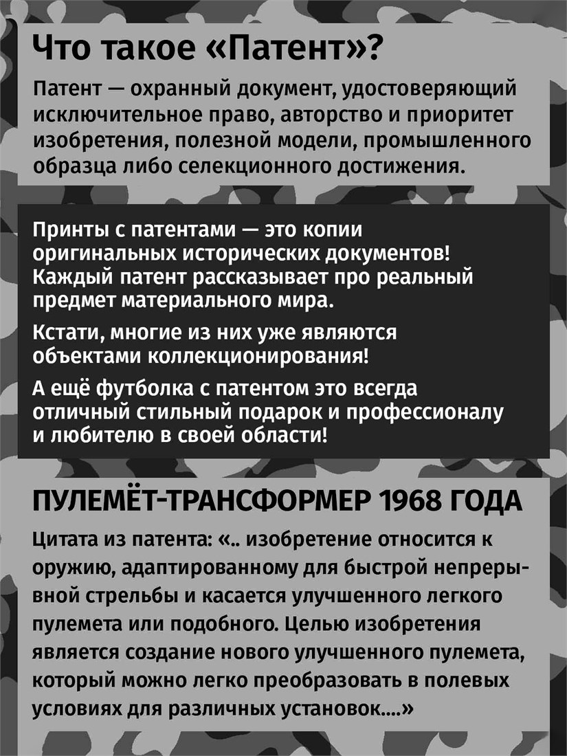 Футболки унисекс, чёрные и белые футболки с изображением патента Пулемёт-трансформер, 1968 год. Эта модель футболки подходит как мужчинам, так и женщинам, а также адаптируется к различным типам фигуры. Наши принты выполнены методом полноцветной цифровой печати, что обеспечивает высокую износостойкость и насыщенность цветов. Ткань из 100 % хлопка и качественная печать гарантируют сохранение цвета и формы изделия после более чем 100 стирок. В этой серии представлены футболки с патентами на револьверы, ружья, автоматы, гранаты, охотничьи ножи. Также у нас есть футболки с изображениями патентов на тему Авто, Авиация; Видео и фото; Деньги; Игры и игрушки; Мода, стиль, красота; Мореплавание; Мото и вело; Музыка; Оружие и охота; Профессии и призвания. Ищите также по запросам: футболка для мужчин, мужские футболки, крутая футболка, футболка женская с принтом, футболка мужская с принтом, футболка на день рождения, необычная футболка, необычный подарок, футболка на вечеринку, качественная футболка, шикарная футболка, модная футболка, футболка для подарка, крутая футболка, футболка хайп, подарок парню, подарок коллекционеру, подарок охотнику, подарок воину, ретро стиль, винтажная, ностальгия, аналоговая эстетика, олдскул техника.