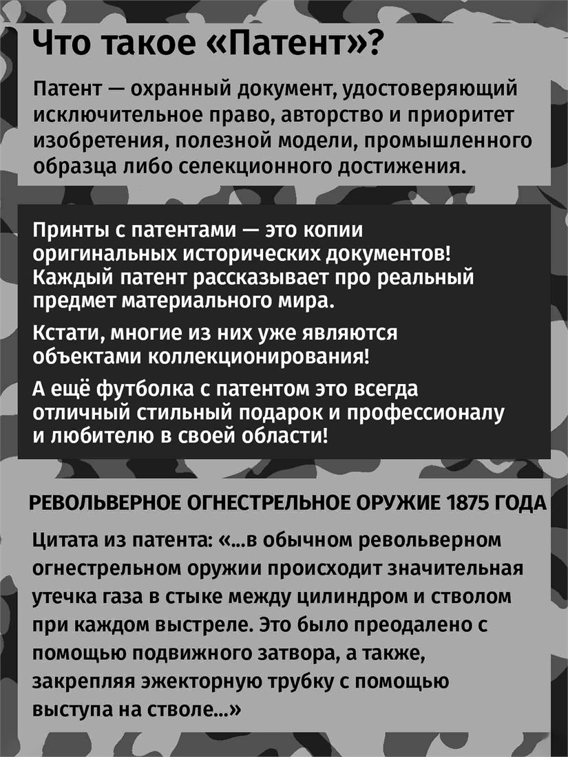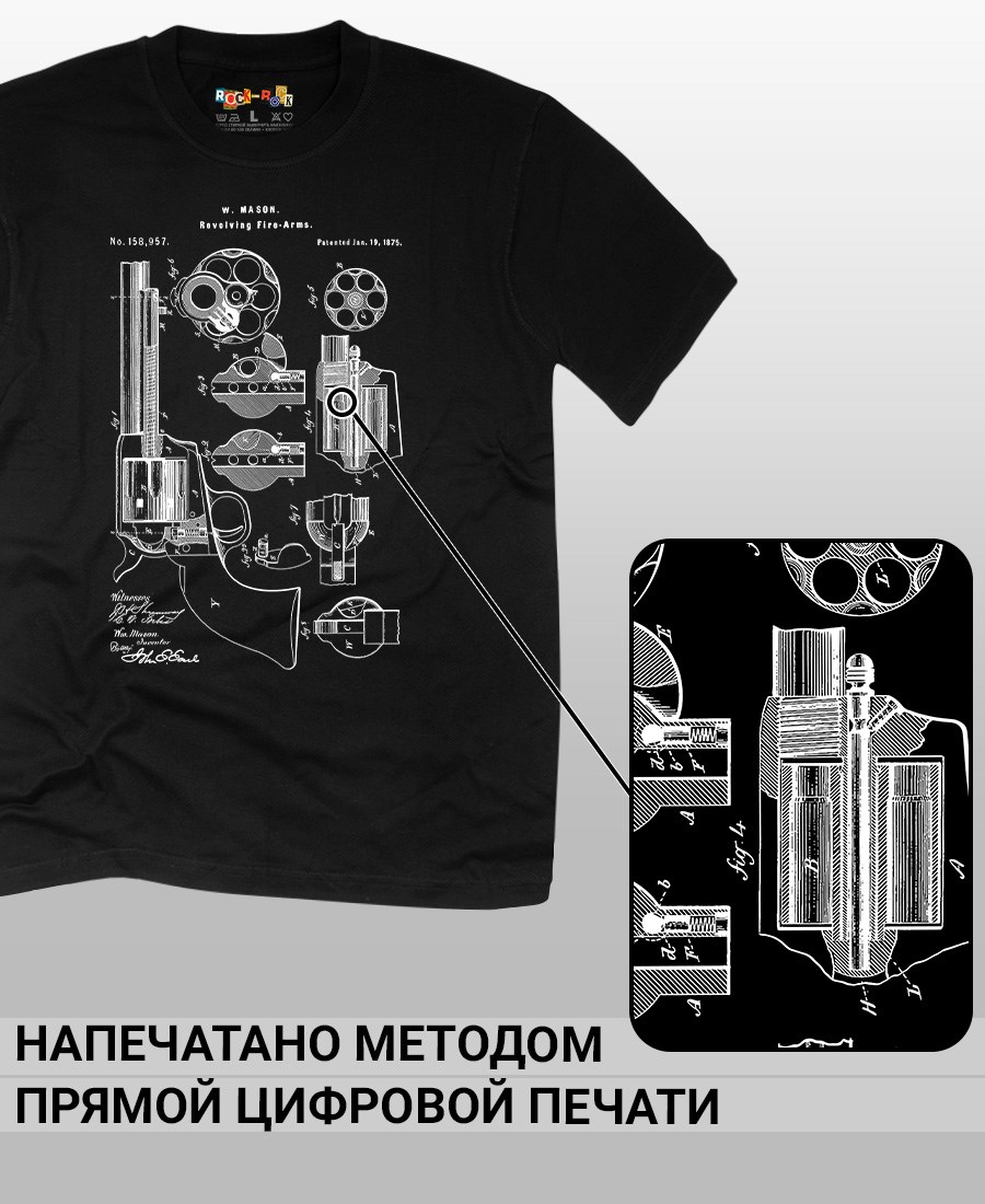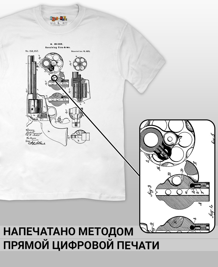 Футболки унисекс, чёрные и белые футболки с изображением патента Револьверное огнестрельное оружие, 1875 год. Эта модель футболки подходит как мужчинам, так и женщинам, а также адаптируется к различным типам фигуры. Наши принты выполнены методом полноцветной цифровой печати, что обеспечивает высокую износостойкость и насыщенность цветов. Ткань из 100 % хлопка и качественная печать гарантируют сохранение цвета и формы изделия после более чем 100 стирок. В этой серии представлены футболки с патентами на револьверы, ружья, автоматы, гранаты, охотничьи ножи. Также у нас есть футболки с изображениями патентов на тему Авто, Авиация; Видео и фото; Деньги; Игры и игрушки; Мода, стиль, красота; Мореплавание; Мото и вело; Музыка; Оружие и охота; Профессии и призвания. Ищите также по запросам: футболка для мужчин, мужские футболки, крутая футболка, футболка женская с принтом, футболка мужская с принтом, футболка на день рождения, необычная футболка, необычный подарок, футболка на вечеринку, качественная футболка, шикарная футболка, модная футболка, футболка для подарка, крутая футболка, футболка хайп, подарок парню, подарок коллекционеру, подарок охотнику, подарок воину, ретро стиль, винтажная, ностальгия, аналоговая эстетика, олдскул техника.