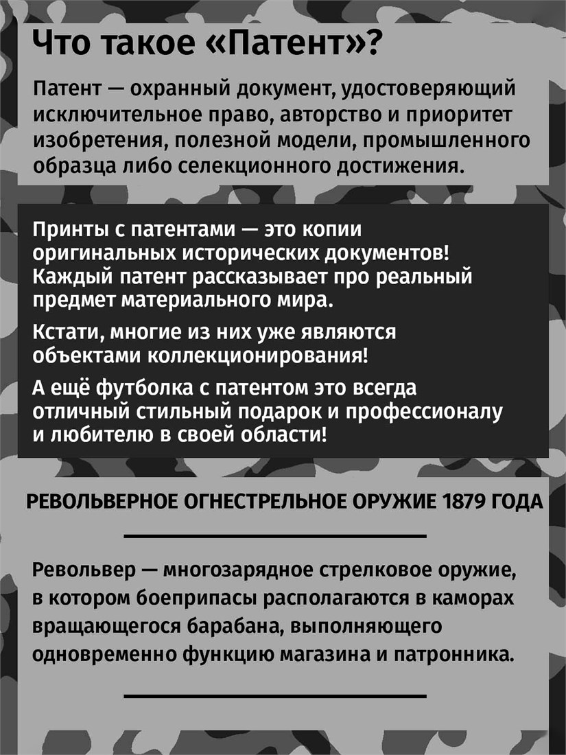 Футболки унисекс, чёрные и белые футболки с изображением патента Револьверное огнестрельное оружие, 1879 год. Эта модель футболки подходит как мужчинам, так и женщинам, а также адаптируется к различным типам фигуры. Наши принты выполнены методом полноцветной цифровой печати, что обеспечивает высокую износостойкость и насыщенность цветов. Ткань из 100 % хлопка и качественная печать гарантируют сохранение цвета и формы изделия после более чем 100 стирок. В этой серии представлены футболки с патентами на револьверы, ружья, автоматы, гранаты, охотничьи ножи. Также у нас есть футболки с изображениями патентов на тему Авто, Авиация; Видео и фото; Деньги; Игры и игрушки; Мода, стиль, красота; Мореплавание; Мото и вело; Музыка; Оружие и охота; Профессии и призвания. Ищите также по запросам: футболка для мужчин, мужские футболки, крутая футболка, футболка женская с принтом, футболка мужская с принтом, футболка на день рождения, необычная футболка, необычный подарок, футболка на вечеринку, качественная футболка, шикарная футболка, модная футболка, футболка для подарка, крутая футболка, футболка хайп, подарок парню, подарок коллекционеру, подарок охотнику, подарок воину, ретро стиль, винтажная, ностальгия, аналоговая эстетика, олдскул техника.