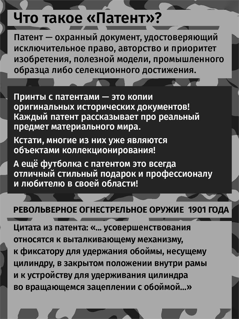 Футболки унисекс, чёрные и белые футболки с изображением патента Револьверное огнестрельное оружие, 1901 год. Эта модель футболки подходит как мужчинам, так и женщинам, а также адаптируется к различным типам фигуры. Наши принты выполнены методом полноцветной цифровой печати, что обеспечивает высокую износостойкость и насыщенность цветов. Ткань из 100 % хлопка и качественная печать гарантируют сохранение цвета и формы изделия после более чем 100 стирок. В этой серии представлены футболки с патентами на револьверы, ружья, автоматы, гранаты, охотничьи ножи. Также у нас есть футболки с изображениями патентов на тему Авто, Авиация; Видео и фото; Деньги; Игры и игрушки; Мода, стиль, красота; Мореплавание; Мото и вело; Музыка; Оружие и охота; Профессии и призвания. Ищите также по запросам: футболка для мужчин, мужские футболки, крутая футболка, футболка женская с принтом, футболка мужская с принтом, футболка на день рождения, необычная футболка, необычный подарок, футболка на вечеринку, качественная футболка, шикарная футболка, модная футболка, футболка для подарка, крутая футболка, футболка хайп, подарок парню, подарок коллекционеру, подарок охотнику, подарок воину, ретро стиль, винтажная, ностальгия, аналоговая эстетика, олдскул техника.