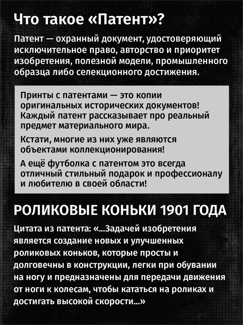 Футболки унисекс, чёрные и белые футболки с изображением патента Футболка Роликовые коньки, 1901 год. Эта модель футболки подходит как мужчинам, так и женщинам, а также адаптируется к различным типам фигуры. Наши принты выполнены методом полноцветной цифровой печати, что обеспечивает высокую износостойкость и насыщенность цветов. Ткань из 100 % хлопка и качественная печать гарантируют сохранение цвета и формы изделия после более чем 100 стирок. В этой серии представлены футболки с патентами на футбольные бутсы, футбольный мяч, боксёрский мешок, боксёрские перчатки, баскетбольную корзину, роликовые коньки, гантель, ледовые коньки, ракетку, хоккейные ботинки, хоккейную клюшку. Также у нас есть футболки с изображениями патентов на тему Авто, Авиация; Видео и фото; Деньги; Игры и игрушки; Мода, стиль, красота; Мореплавание; Мото и вело; Музыка; Оружие и охота; Профессии и призвания. Ищите также по запросам: футболка для мужчин, мужские футболки, крутая футболка, футболка женская с принтом, футболка мужская с принтом, футболка на день рождения, необычная футболка, необычный подарок, футболка на вечеринку, качественная футболка, шикарная футболка, модная футболка, футболка для подарка, крутая футболка, футболка хайп, подарок парню, подарок коллекционеру, подарок спортсмену, подарок футболисту, подарок хоккеисту, подарок фигуристу, подарок для стрелка, подарок тенниситу, подарок баскетболисту, подарок фитнес-тренеру, ретро стиль, винтажная, ностальгия, аналоговая эстетика, олдскул техника.