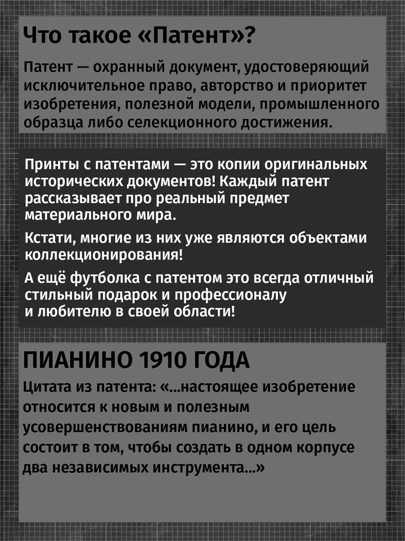 Футболки унисекс, чёрные и белые футболки с изображением патента Рояль, 1910 год. Эта модель футболки подходит как мужчинам, так и женщинам, а также адаптируется к различным типам фигуры. Наши принты выполнены методом полноцветной цифровой печати, что обеспечивает высокую износостойкость и насыщенность цветов. Ткань из 100 % хлопка и качественная печать гарантируют сохранение цвета и формы изделия после более чем 100 стирок. В этой серии представлены футболки с патентами на фортепиано, барабанные установки, гитары, аккордеон, банджо, микрофон, граммофон. Также у нас есть футболки с изображениями патентов на тему Авто, Авиация; Видео и фото; Деньги; Игры и игрушки; Мода, стиль, красота; Мореплавание; Мото и вело; Музыка; Оружие и охота; Профессии и призвания. Ищите также по запросам: футболка для мужчин, мужские футболки, крутая футболка, футболка женская с принтом, футболка мужская с принтом, футболка на день рождения, необычная футболка, необычный подарок, футболка на вечеринку, качественная футболка, шикарная футболка, модная футболка, футболка для подарка, крутая футболка, футболка хайп, подарок парню, подарок девушке, подарок коллекционеру, подарок музыканту, подарок гитаристу, подарок барабанщику, подарок аккордионисту, подарок рокеру, подарок пионисту, футболка музыканта, футболка музыка, ретро стиль, винтажная, ностальгия, аналоговая эстетика, олдскул техника.