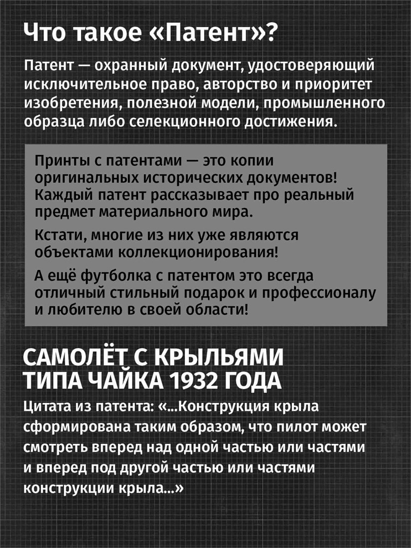 Футболки унисекс, чёрные и белые футболки с изображением патента Самолёт с крыльями типа "чайка", 1931 год. Эта модель футболки подходит как мужчинам, так и женщинам, а также адаптируется к различным типам фигуры. Наши принты выполнены методом полноцветной цифровой печати, что обеспечивает высокую износостойкость и насыщенность цветов. Ткань из 100 % хлопка и качественная печать гарантируют сохранение цвета и формы изделия после более чем 100 стирок. В этой серии представлены футболки с патентами на летающие машины, воздушный корабль, сверхзвуковой самолёт, аэроплан, самолёт с крыльями типа «чайка», вертолёт, АН-26, АН-12. Также у нас есть футболки с изображениями патентов на тему Авто, Авиация; Видео и фото; Деньги; Игры и игрушки; Мода, стиль, красота; Мореплавание; Мото и вело; Музыка; Оружие и охота; Профессии и призвания. Ищите также по запросам: футболка для мужчин, мужские футболки, крутая футболка, футболка женская с принтом, футболка мужская с принтом, футболка на день рождения, необычная футболка, необычный подарок, футболка на вечеринку, качественная футболка, шикарная футболка, модная футболка, футболка для подарка, крутая футболка, футболка хайп, подарок парню, подарок девушке, подарок летчику, подарок инженеру, футболка автолюбителю, футболка пилоту, футболка ВДВшнику, футболка десантнику.