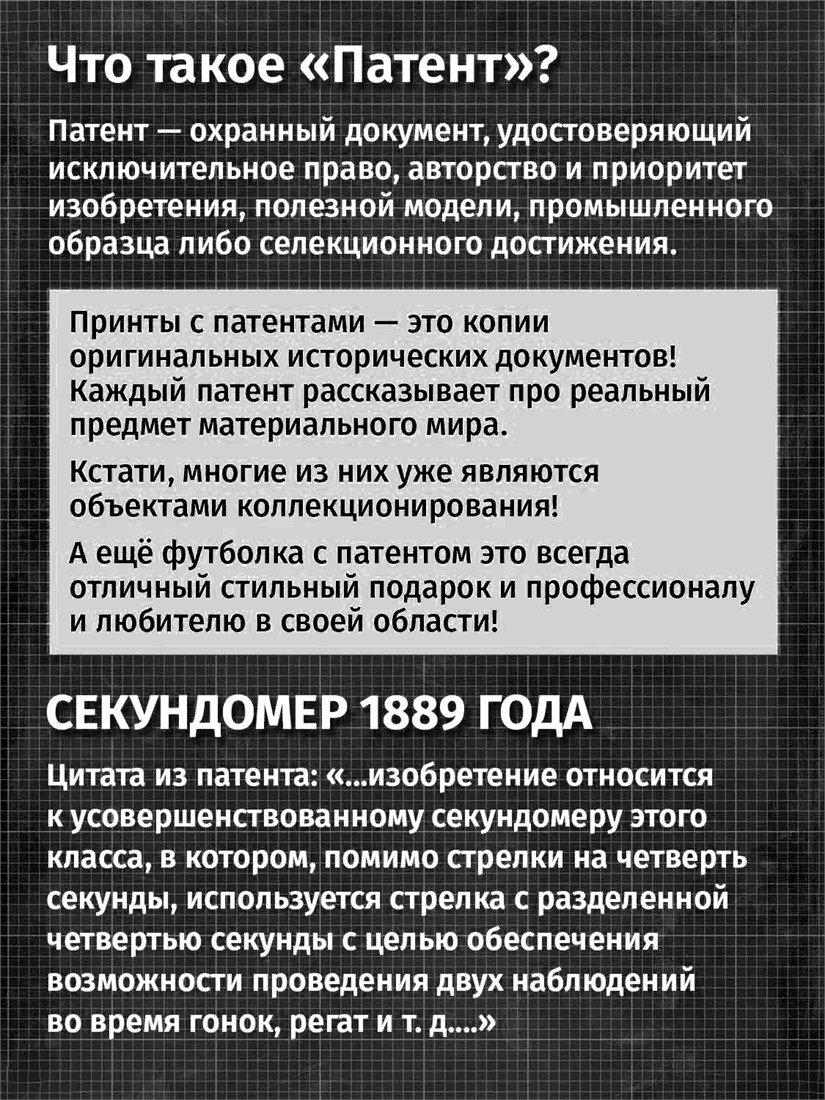 Футболки унисекс, чёрные и белые футболки с изображением патента Футболка Секундомер, 1889 год. Эта модель футболки подходит как мужчинам, так и женщинам, а также адаптируется к различным типам фигуры. Наши принты выполнены методом полноцветной цифровой печати, что обеспечивает высокую износостойкость и насыщенность цветов. Ткань из 100 % хлопка и качественная печать гарантируют сохранение цвета и формы изделия после более чем 100 стирок. В этой серии представлены футболки с патентами на анатомическую модель скелета, хирургическую маску, опору для пожрного рукава, маску пожарного, очки, скафандр, печатную машинку, локомотив, секундомер, магнето. Также у нас есть футболки с изображениями патентов на тему Авто, Авиация; Видео и фото; Деньги; Игры и игрушки; Мода, стиль, красота; Мореплавание; Мото и вело; Музыка; Оружие и охота; Профессии и призвания. Ищите также по запросам: футболка для мужчин, мужские футболки, крутая футболка, футболка женская с принтом, футболка мужская с принтом, футболка на день рождения, необычная футболка, необычный подарок, футболка на вечеринку, качественная футболка, шикарная футболка, модная футболка, футболка для подарка, крутая футболка, футболка хайп, подарок парню, подарок коллекционеру, подарок врачу, подарок пожарному, подарок космонавту, подарок писателю, подарок инжинеру, ретро стиль, винтажная, ностальгия, аналоговая эстетика, олдскул техника.