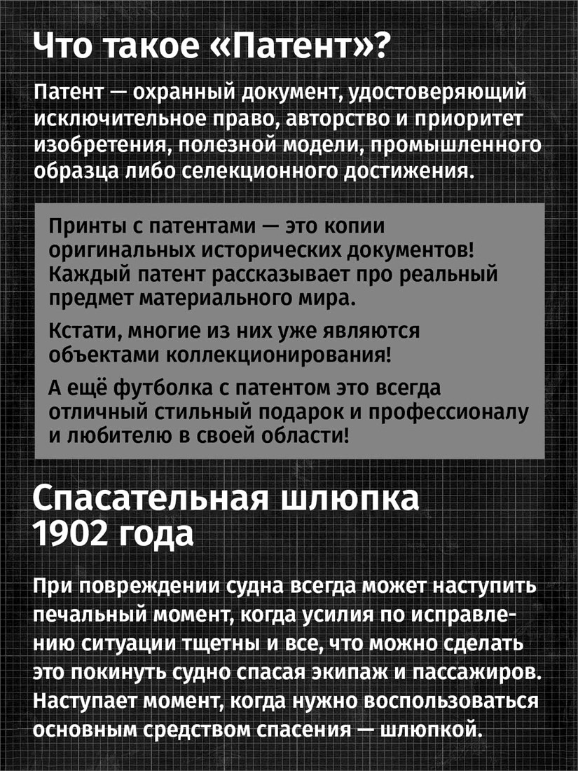 Футболки унисекс, чёрные и белые футболки с изображением патента Спасательная шлюпка, 1902 года. Эта модель футболки подходит как мужчинам, так и женщинам, а также адаптируется к различным типам фигуры. Наши принты выполнены методом полноцветной цифровой печати, что обеспечивает высокую износостойкость и насыщенность цветов. Ткань из 100 % хлопка и качественная печать гарантируют сохранение цвета и формы изделия после более чем 100 стирок. В этой серии представлены футболки с патентами на подводные лодки, парусные лодки, шлюпки, такелаж, каноэ, водолазные костюм, компас. Также у нас есть футболки с изображениями патентов на тему Авто, Авиация; Видео и фото; Деньги; Игры и игрушки; Мода, стиль, красота; Мореплавание; Мото и вело; Музыка; Оружие и охота; Профессии и призвания. Ищите также по запросам: футболка для мужчин, мужские футболки, крутая футболка, футболка женская с принтом, футболка мужская с принтом, футболка на день рождения, необычная футболка, необычный подарок, футболка на вечеринку, качественная футболка, шикарная футболка, модная футболка, футболка для подарка, крутая футболка, футболка хайп, подарок парню, подарок девушке, подарок коллекционеру, подарок моряку, подарок яхтеру, подарок яхтсмену, подарок путешественнику, подарок дайверу, подарок речнику, футболка блоггеру, футболка стимпанк, ретро стиль, винтажная, ностальгия, аналоговая эстетика, олдскул техника.
