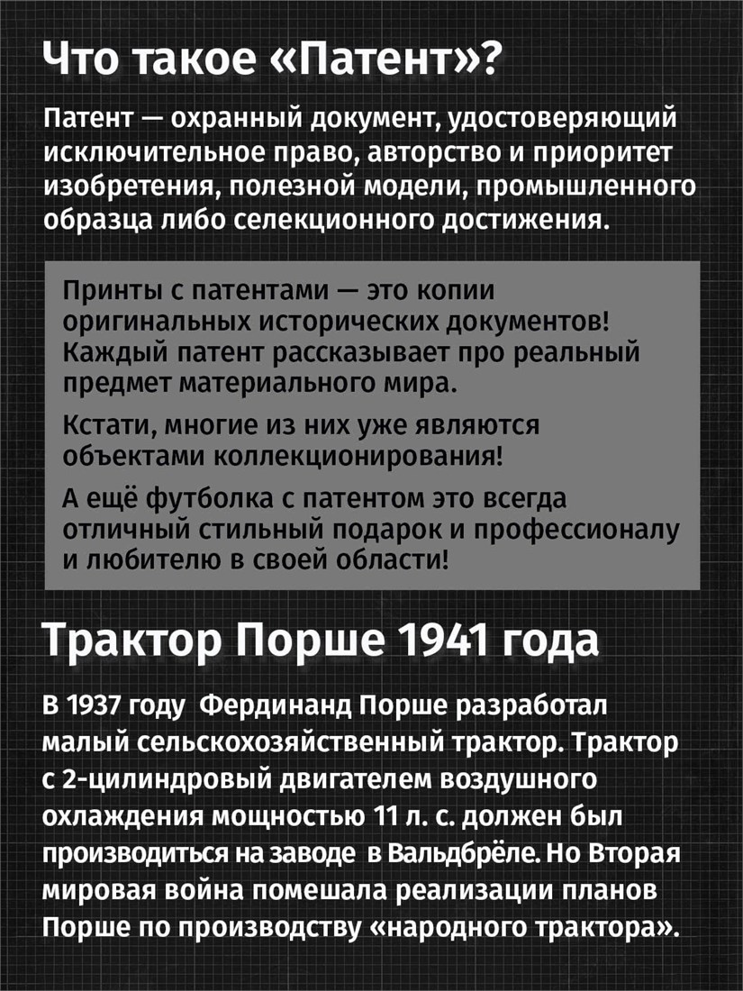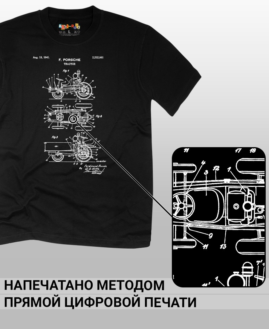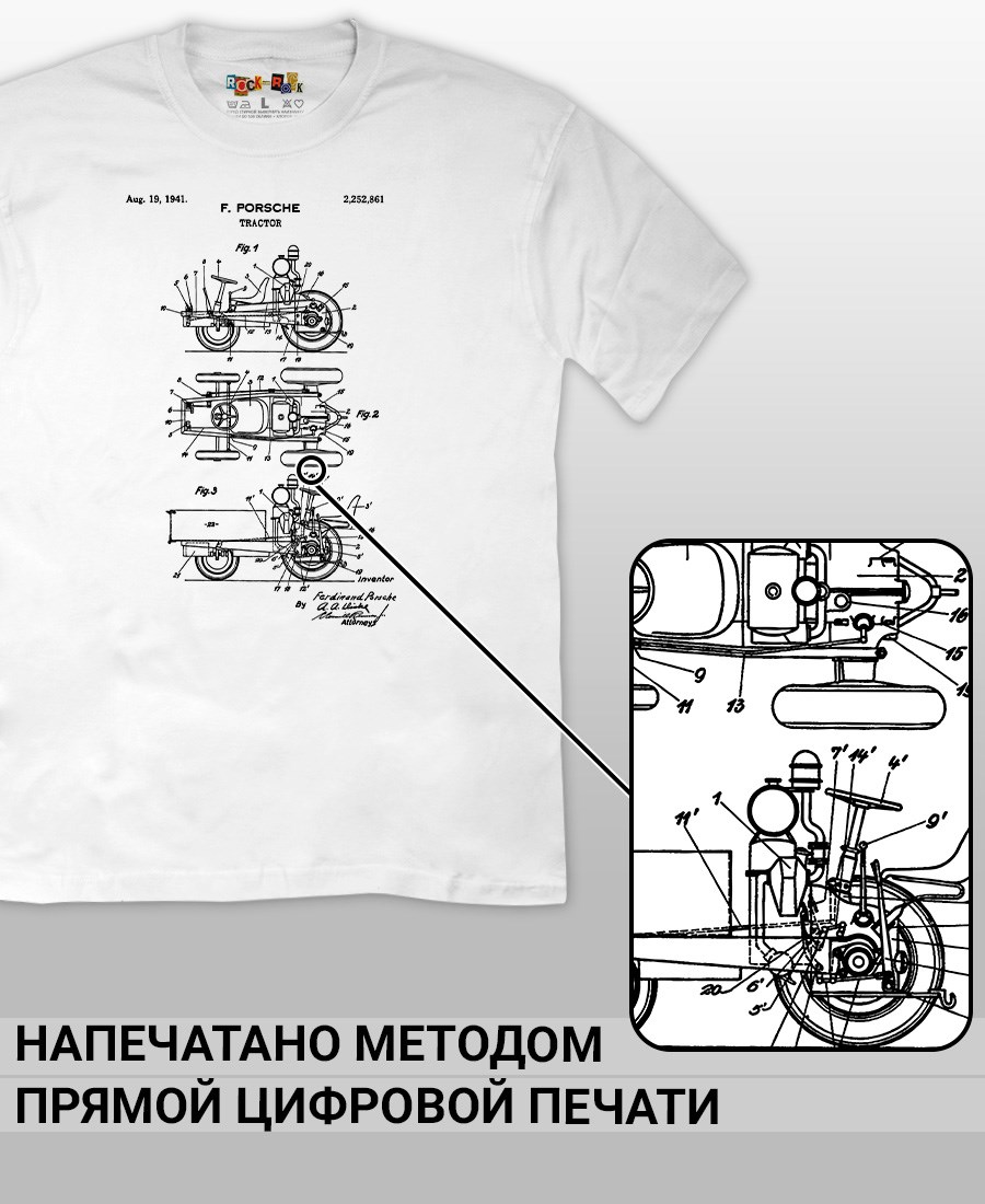 Чёрные и белые футболки унисекс с изображением патента Трактор Porsche, 1941 год. Эта модель футболки подходит как мужчинам, так и женщинам, а также адаптируется к различным типам фигуры. Наши принты выполнены методом полноцветной цифровой печати, что обеспечивает высокую износостойкость и насыщенность цветов. Ткань из 100 % хлопка и качественная печать гарантируют сохранение цвета и формы изделия после более чем 100 стирок. В этой серии представлены футболки с патентами на автомобили Chevrolet Corvette 1973 и 1969 года, автомобиль универсал Jeepster 1948 года, Двигатель Селдона 1912 года, трактор Фердинанда Порше, спорткар Porsche 911, Cadillac Series 61. Также у нас есть футболки с изображениями патентов на тему Авиация; Видео и фото; Деньги; Игры и игрушки; Мода, стиль, красота; Мореплавание; Мото и вело; Музыка; Оружие и охота; Профессии и призвание. Ищите также по запросам: футболка для мужчин, мужские футболки, крутая футболка, футболка женская с принтом, футболка мужская с принтом, футболка на день рождения, необычная футболка, необычный подарок, футболка на вечеринку, качественная футболка, шикарная футболка, модная футболка, футболка для подарка, крутая футболка, футболка хайп, подарок парню, подарок девушке, подарок летчику, футболка автолюбителю, футболка для автоледи.