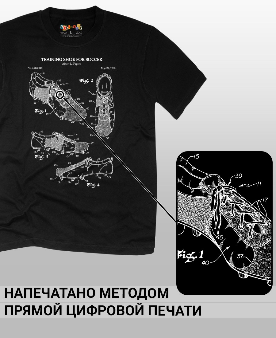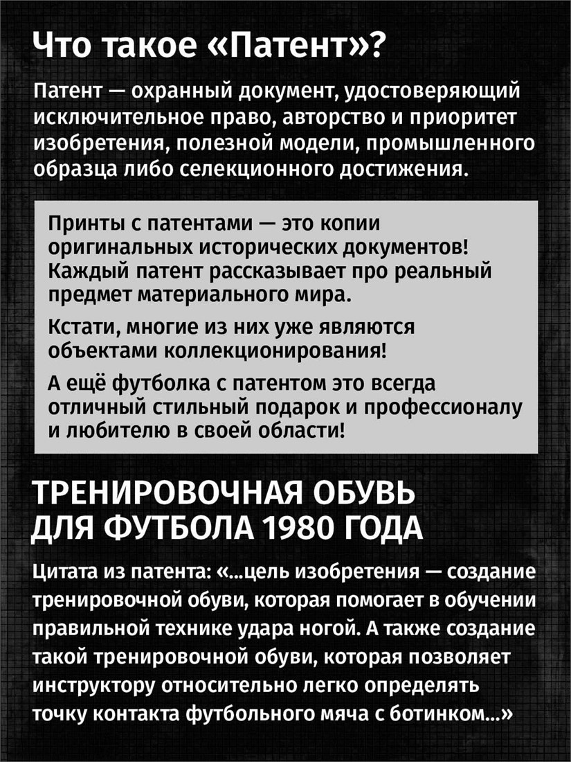 Футболки унисекс, чёрные и белые футболки с изображением патента Футболка Тренировочная обувь для футбола, 1980 год. Эта модель футболки подходит как мужчинам, так и женщинам, а также адаптируется к различным типам фигуры. Наши принты выполнены методом полноцветной цифровой печати, что обеспечивает высокую износостойкость и насыщенность цветов. Ткань из 100 % хлопка и качественная печать гарантируют сохранение цвета и формы изделия после более чем 100 стирок. В этой серии представлены футболки с патентами на футбольные бутсы, футбольный мяч, боксёрский мешок, боксёрские перчатки, баскетбольную корзину, роликовые коньки, гантель, ледовые коньки, ракетку, хоккейные ботинки, хоккейную клюшку. Также у нас есть футболки с изображениями патентов на тему Авто, Авиация; Видео и фото; Деньги; Игры и игрушки; Мода, стиль, красота; Мореплавание; Мото и вело; Музыка; Оружие и охота; Профессии и призвания. Ищите также по запросам: футболка для мужчин, мужские футболки, крутая футболка, футболка женская с принтом, футболка мужская с принтом, футболка на день рождения, необычная футболка, необычный подарок, футболка на вечеринку, качественная футболка, шикарная футболка, модная футболка, футболка для подарка, крутая футболка, футболка хайп, подарок парню, подарок коллекционеру, подарок спортсмену, подарок футболисту, подарок хоккеисту, подарок фигуристу, подарок для стрелка, подарок тенниситу, подарок баскетболисту, подарок фитнес-тренеру, ретро стиль, винтажная, ностальгия, аналоговая эстетика, олдскул техника.